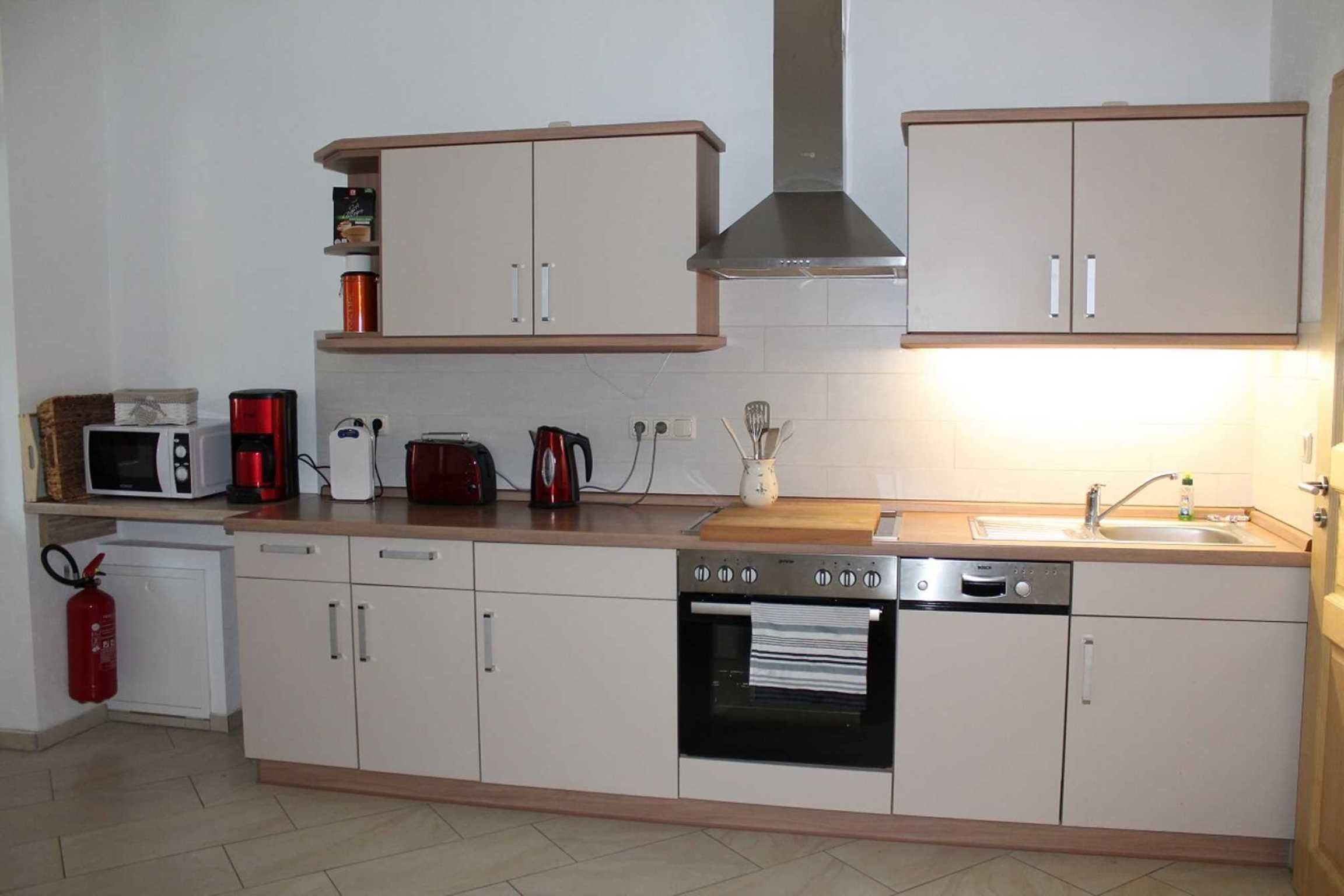 Die integrierte voll ausgestattete Küchenzeile verfügt neben Wasserkocher, Kaffeemaschine, Toaster, Mikrowelle, Herd mit Ceranfeld und Kühlschrank mit Gefrierfach auch über einen Geschirrspüler.