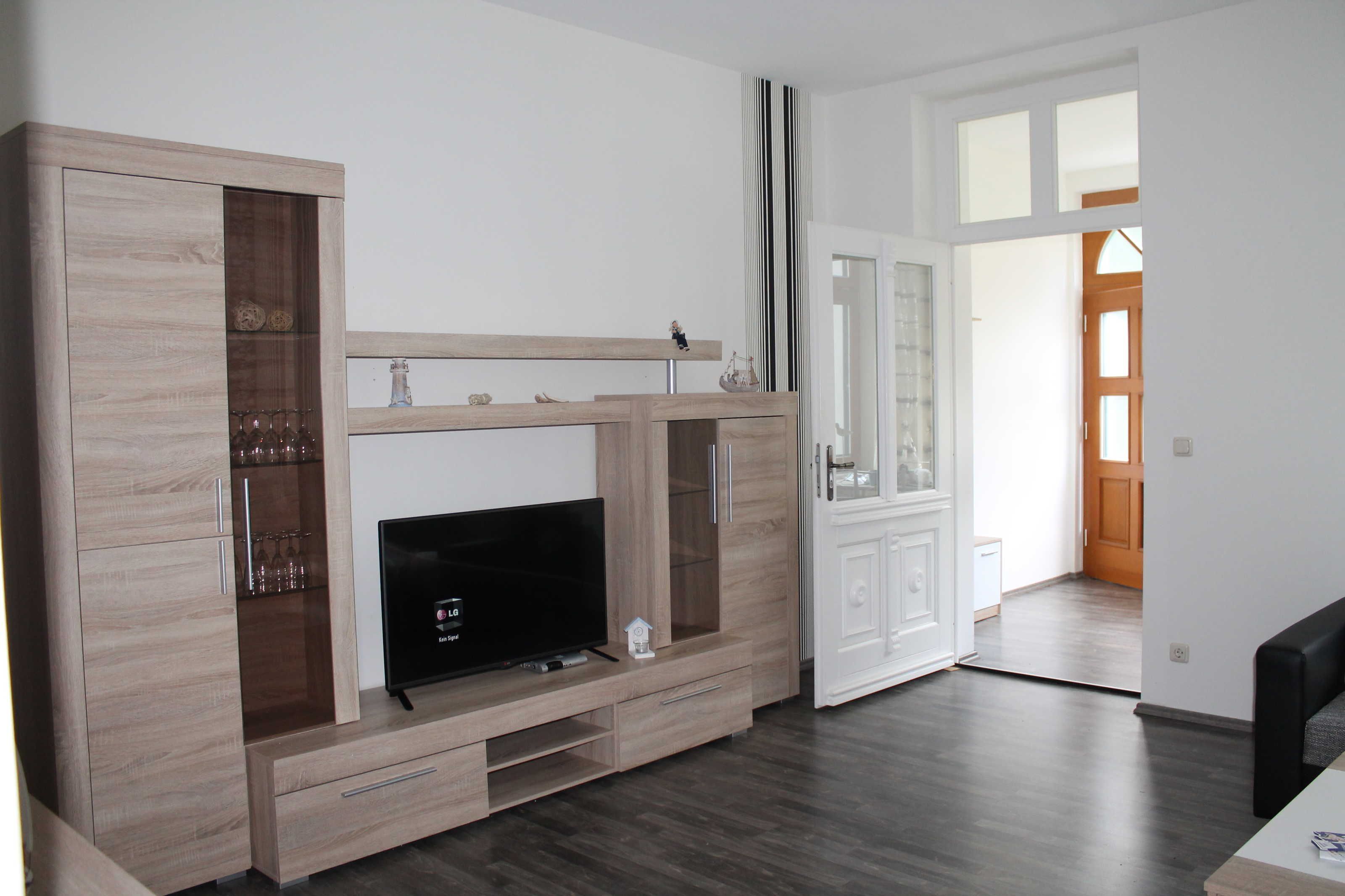 Das Wohnzimmer ist großzügig und modern mit großer Couch und Flachbild-TV eingerichtet. Hier kann Entspannung beginnen.