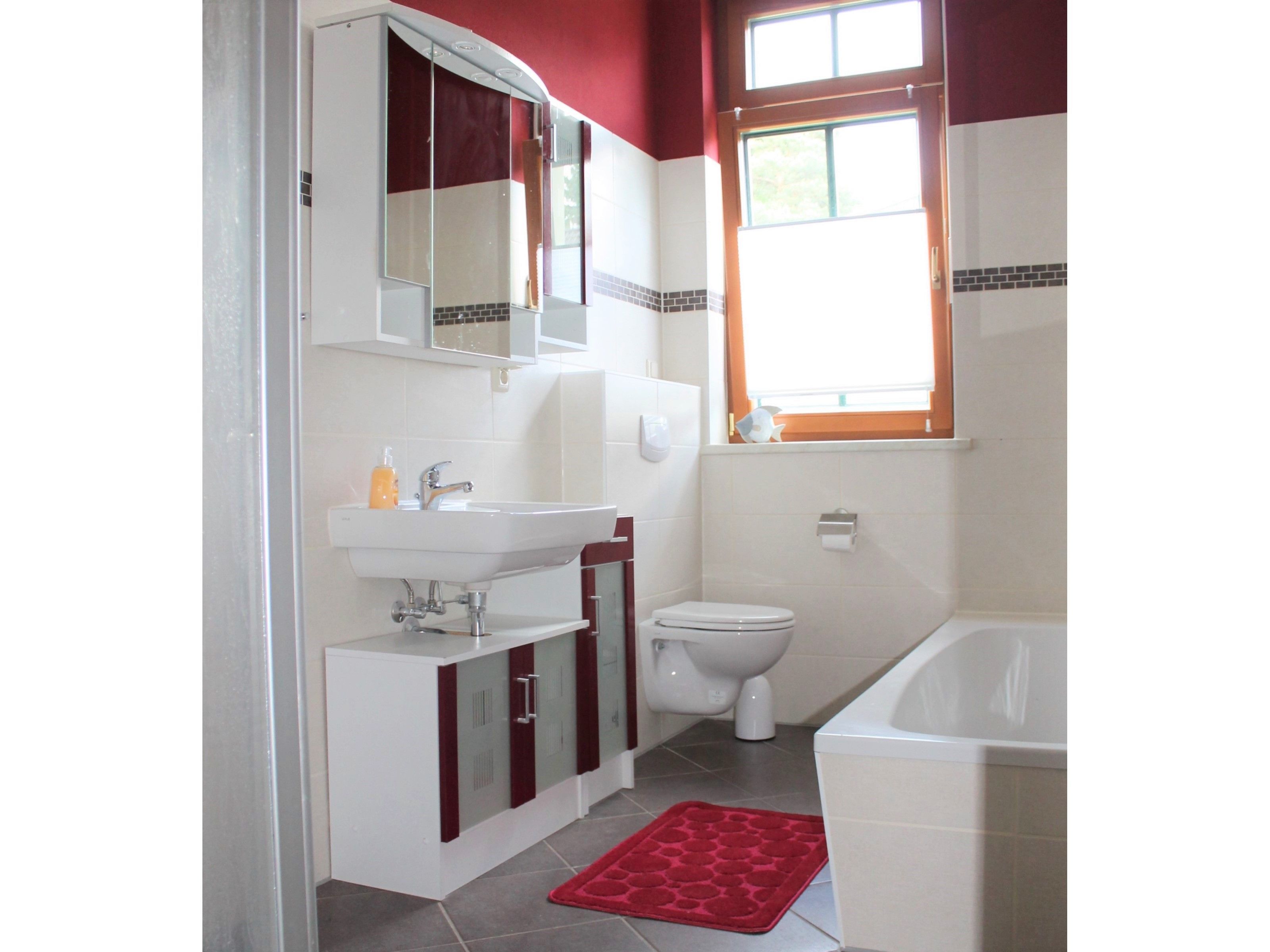 Im gefliesten modernen Bad stehen Ihnen neben dem WC eine Dusche und eine Badewanne zur Verfügung.