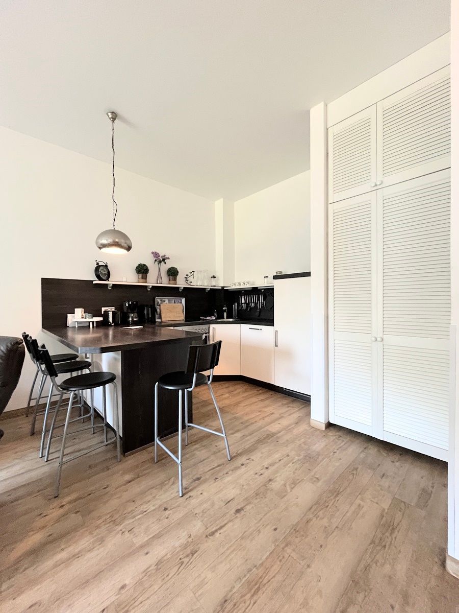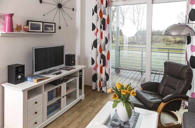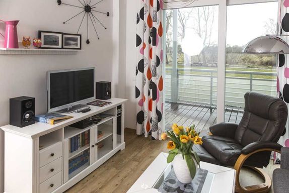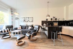 Das Appartement hat ein großes Wohnzimmer mit offener Küche. Ihnen steht im Wohnraum ein gemütliches Sofa (ausziehbar 1,60m breit) und zwei bequeme, verstellbare Sessel zur Entspannung zur Verfügung. Der moderne Flachbildfernseher sowie eine Soundanlage können außerhalb Ihrer Aktivitäten genutzt werden. Die hochwertige Einbauküche ist ausgestattet mit einem Cerankochfeld, Backofen, Kühlschrank (mit TK-Fach) und Geschirrspüler. Der integrierte Essplatz ermöglicht Ihnen kommunikative Essenszubereitung und -einnahme.