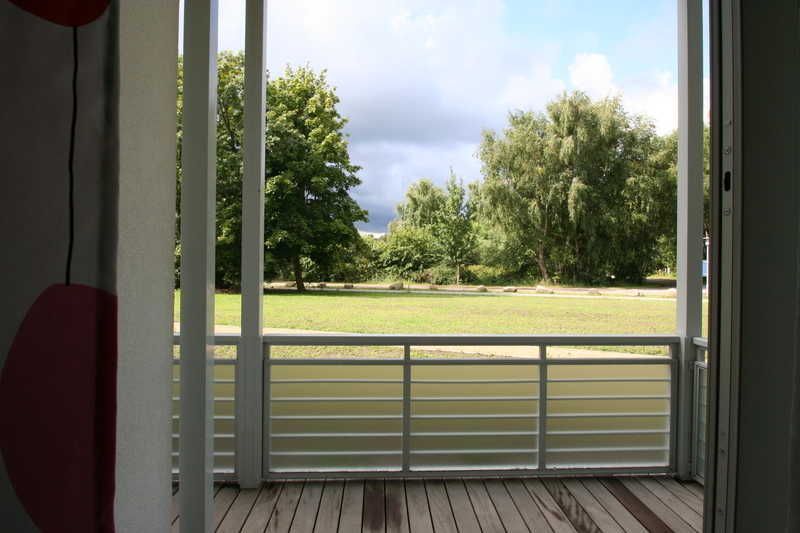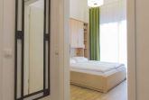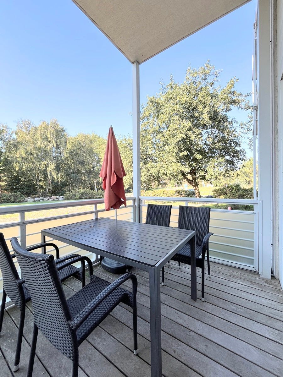 Die Wohnung befindet sich auf der Südseite im Erdgeschoss und ist ebenerdig begehbar. Die Einrichtung in hellen Farben ist freundlich und modern. Die großzügig überdachte Terrasse erstreckt sich über 2 Räume. Sie ist sowohl vom Schlafzimmer als auch vom Wohnzimmer aus zu erreichen. Die bodenhohen Fenster sorgen für lichtdurchflutete Räume. Wenn Ihnen die Sonne doch einmal zu viel wird, können die vorhandenen Außenjalousien die Räume verdunkeln.