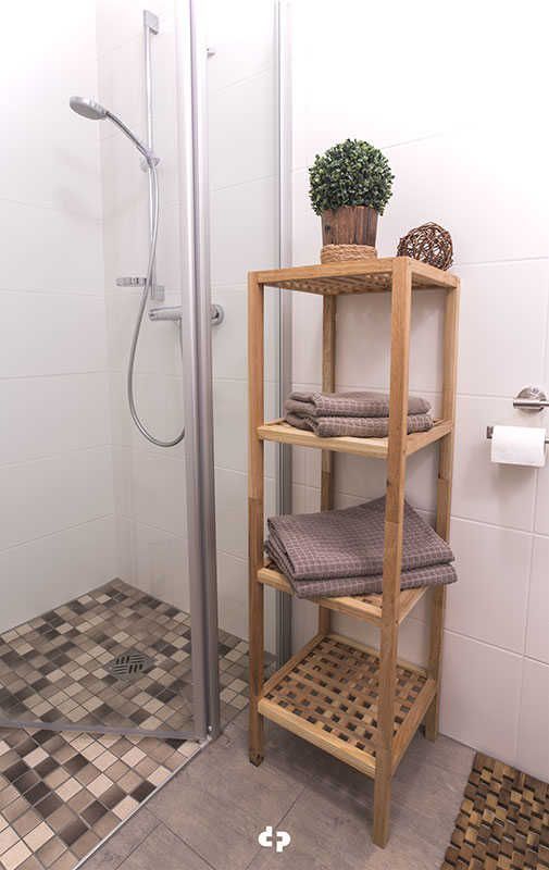 Das geflieste Bad ist mit hochwertiger Ausstattung versehen, dazu gehören die ebenerdige Dusche mit Glastür, Waschtisch und WC.