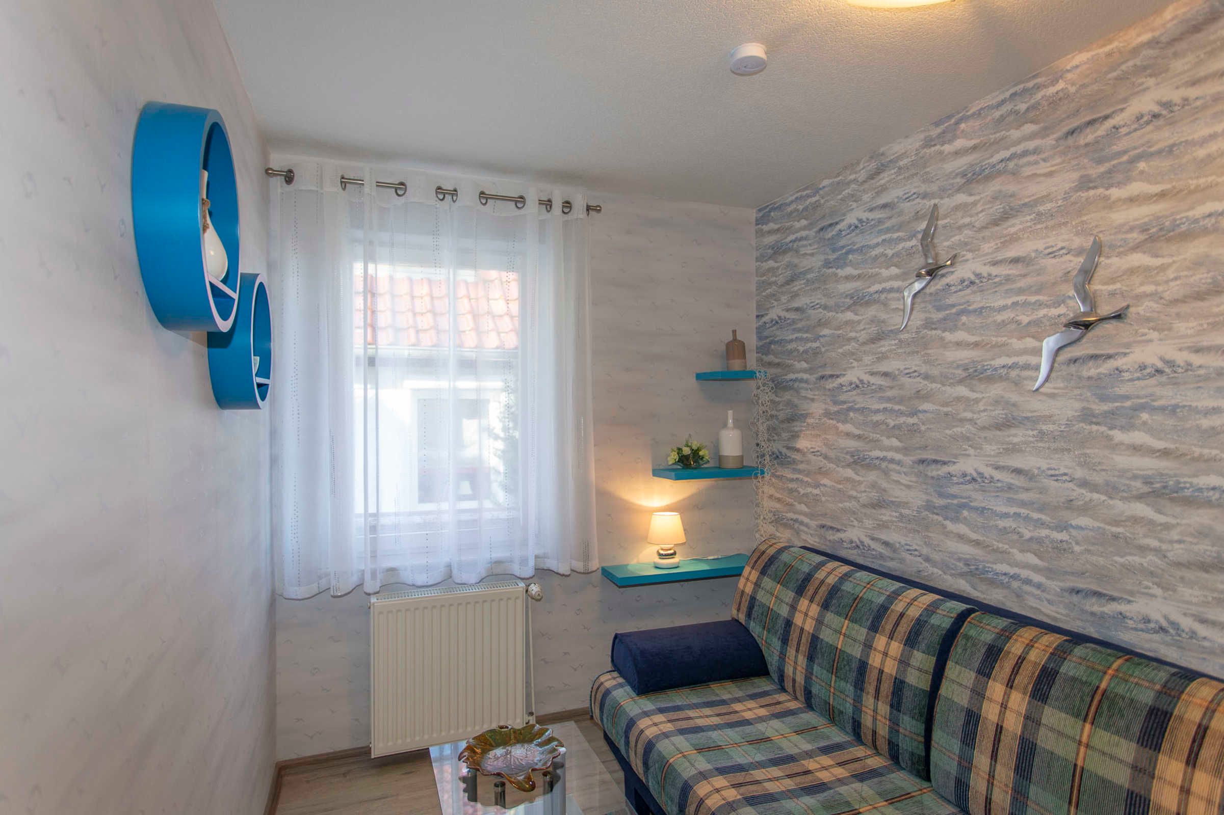 Im Erdgeschoss befindet sich neben dem Eingangsbereich das Wohnzimmer, ein kleineres Schlafzimmer (für 2 Personen), die offene Küche und ein Gäste-WC. Das Obergeschoss, welches über eine Wendeltreppe erreichbar ist, umfasst Bad mit Dusche, ein großes Schlafzimmer (2 Personen plus Aufbettung für 2 Personen) und eine Leseecke. Alle Räume sind hell, freundlich und modern eingerichtet. Die Küche ist ausgestattet mit mit 2-Platten-Ceranfeld und Minibackofen, Kühlschrank, Geschirrspüler, einem Frühstückscenter und allem notwendigen Geschirr.