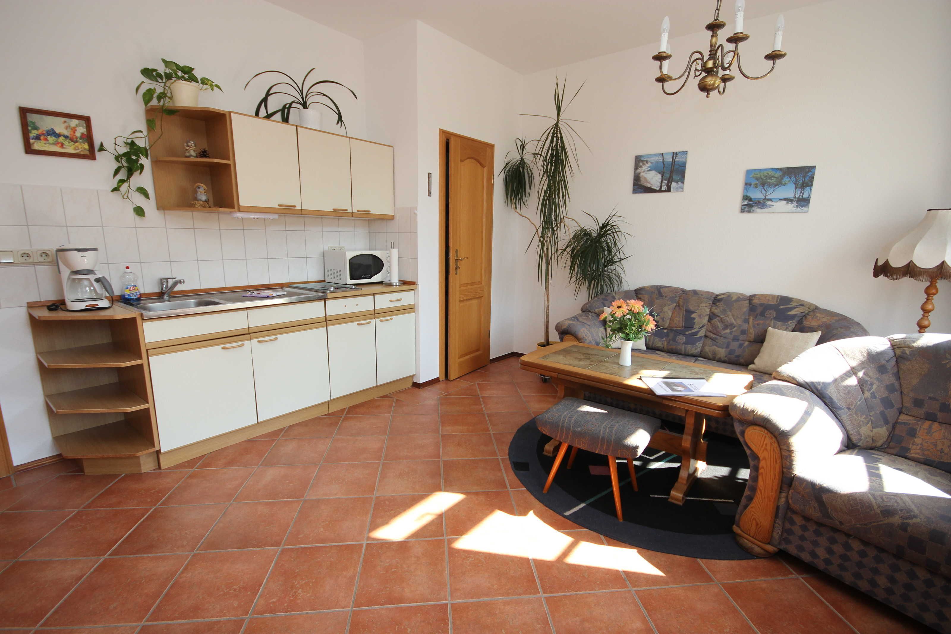 Ausstattung: Doppelbett: 1, Küchenzeile, Kühlschrankmit Gefrierfach, Mikrowelle, Toaster, Wasserkocher, Kaffeemaschine, 2- Plattencerankochfeld, Fußbodenheizung, TV, Radio, Dusche, separater Eingang, Insektenschutzrollo