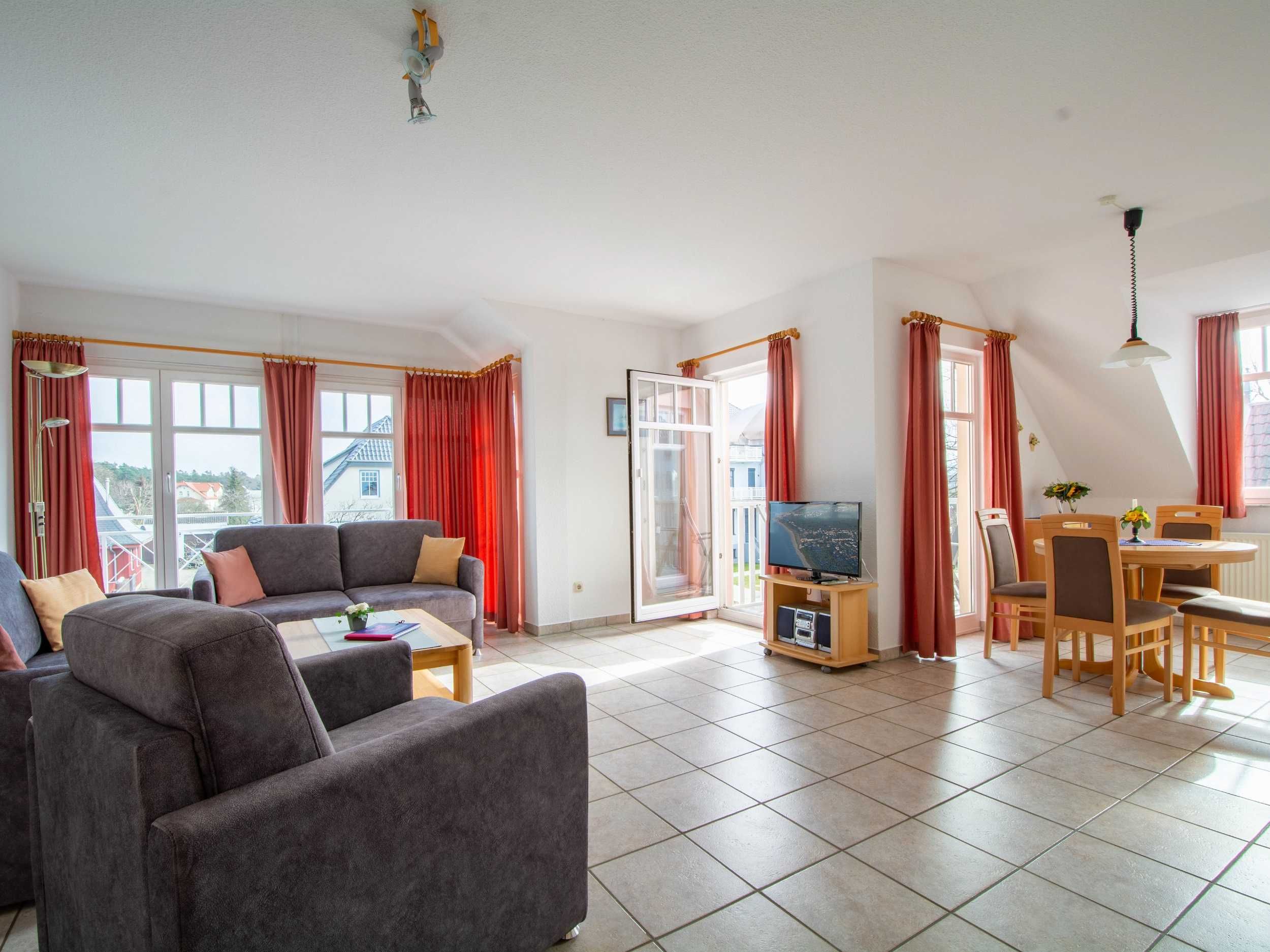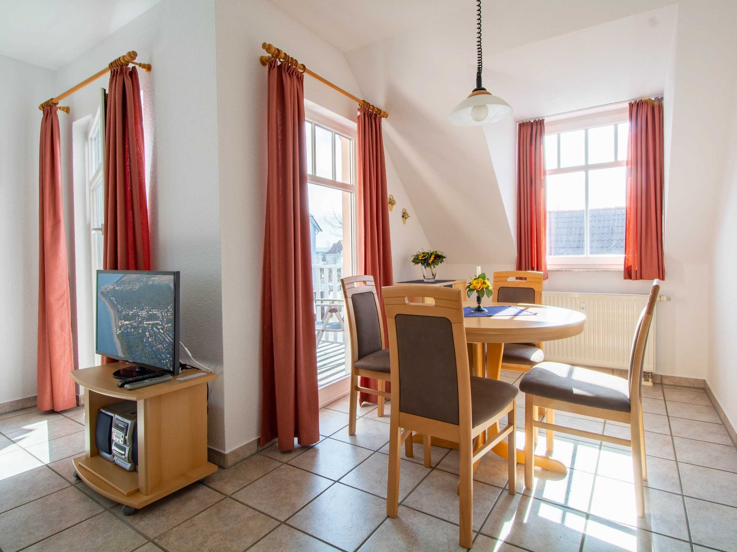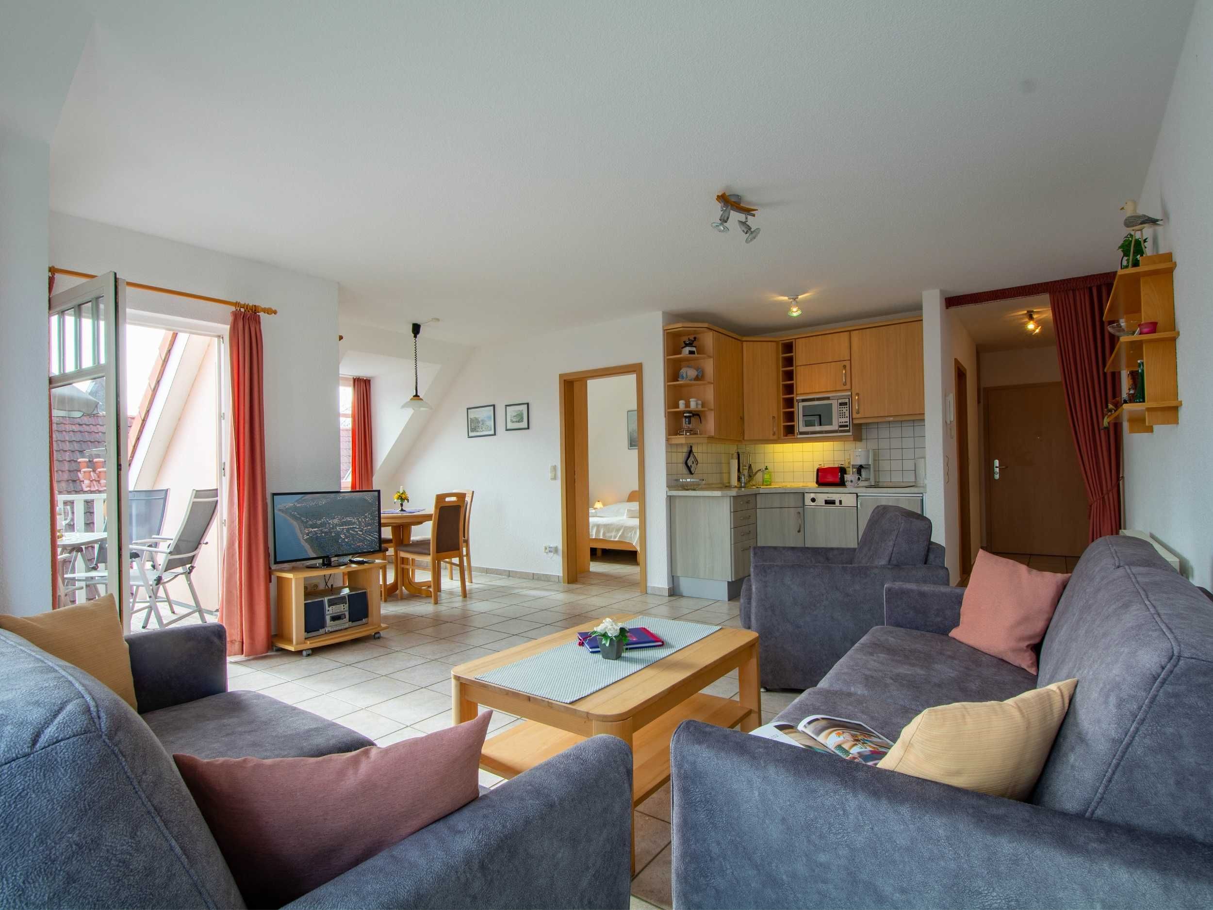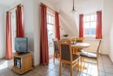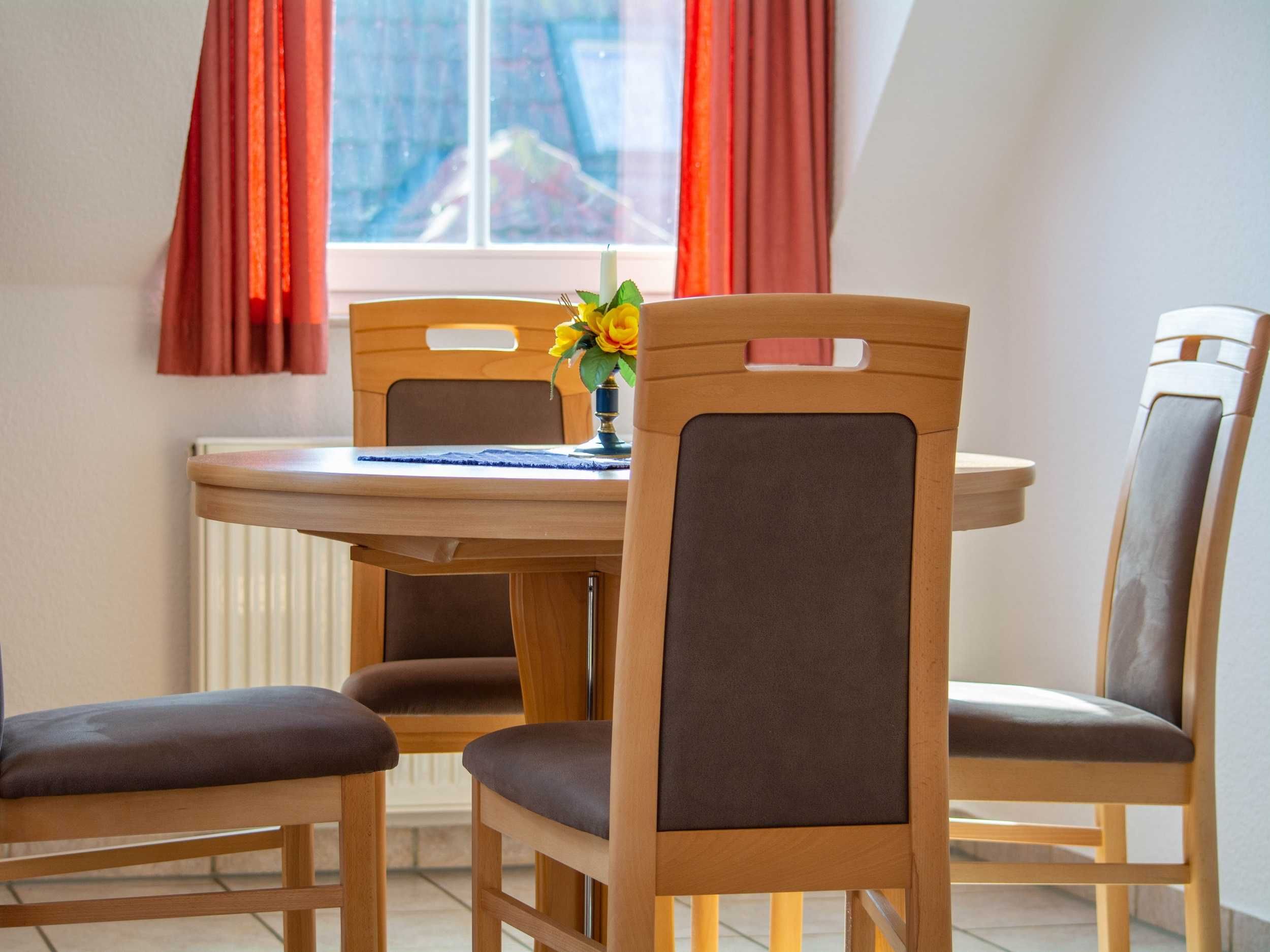 Im lichtdurchfluteten Wohnraum der Ferienwohnung lädt Sie eine gemütliche und moderne Couchgarnitur zu geselligen Abendstunden ein. Eine Couch kann mit wenigen Handgriffen zu einer bequemen Schlafcouch umfunktioniert werden (160cm Breite). Zu Ihrer Unterhaltung stehen Ihnen ein 32-Zoll-Flatscreen-TV und ein Radio zur Verfügung. Der Essbereich ist im großzügigen Wohnbereich integriert und bietet Ihnen viel Platz für Ihre Mahlzeiten.