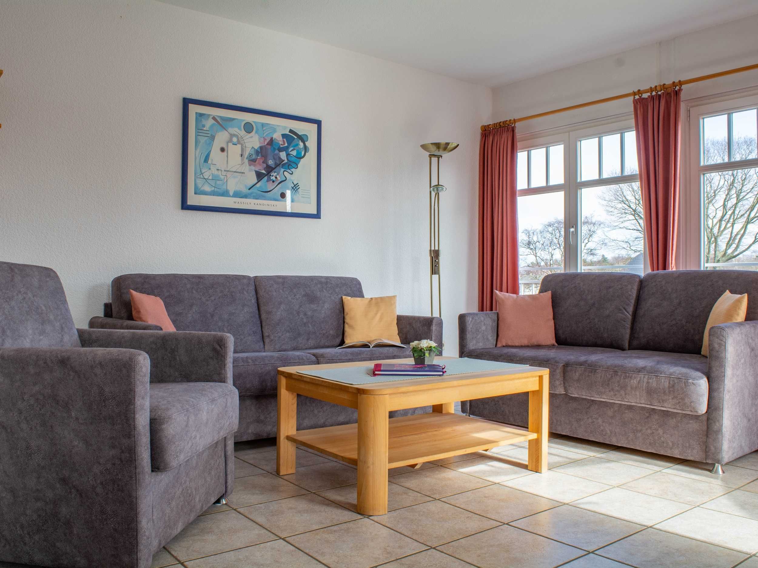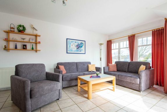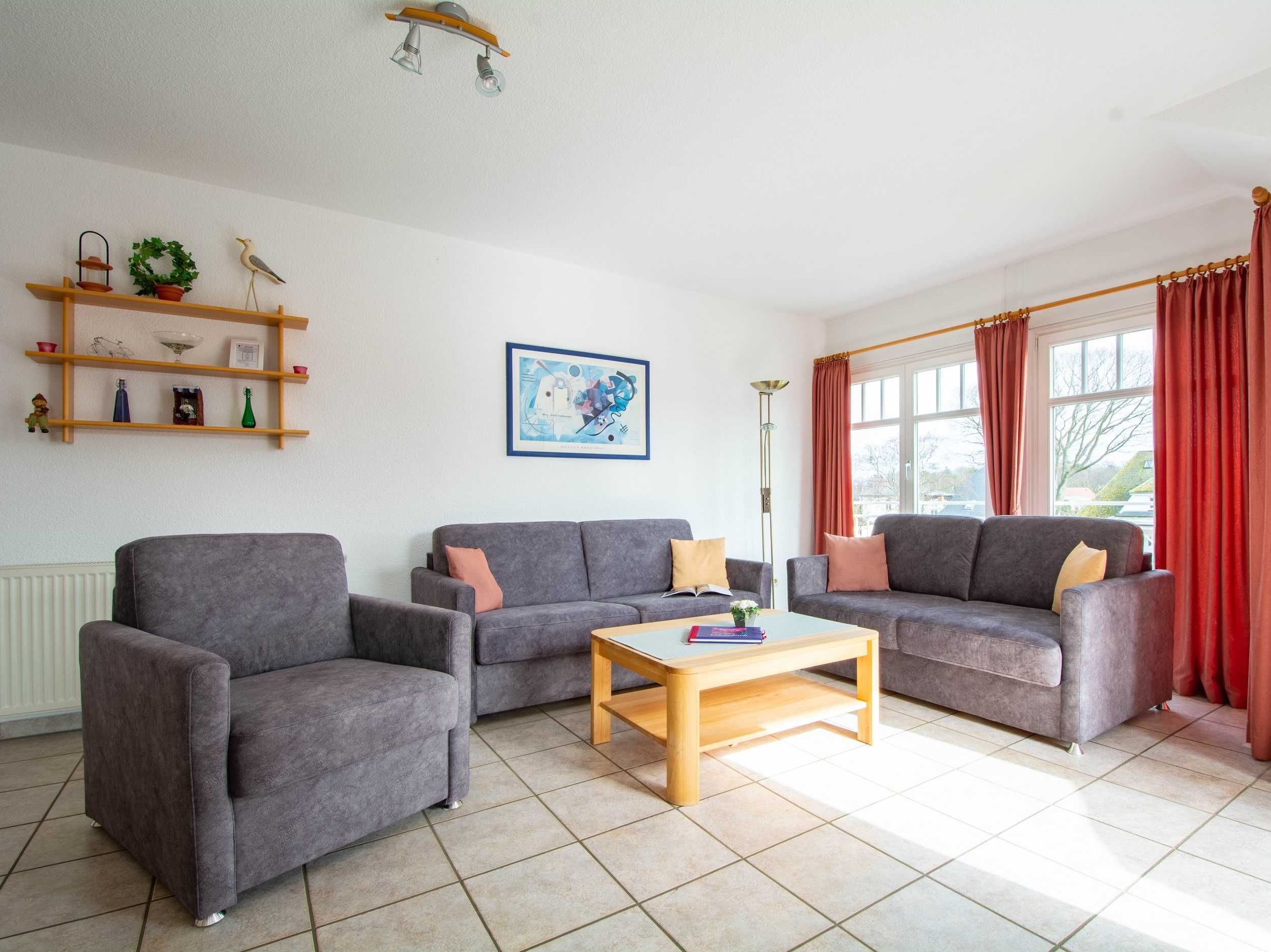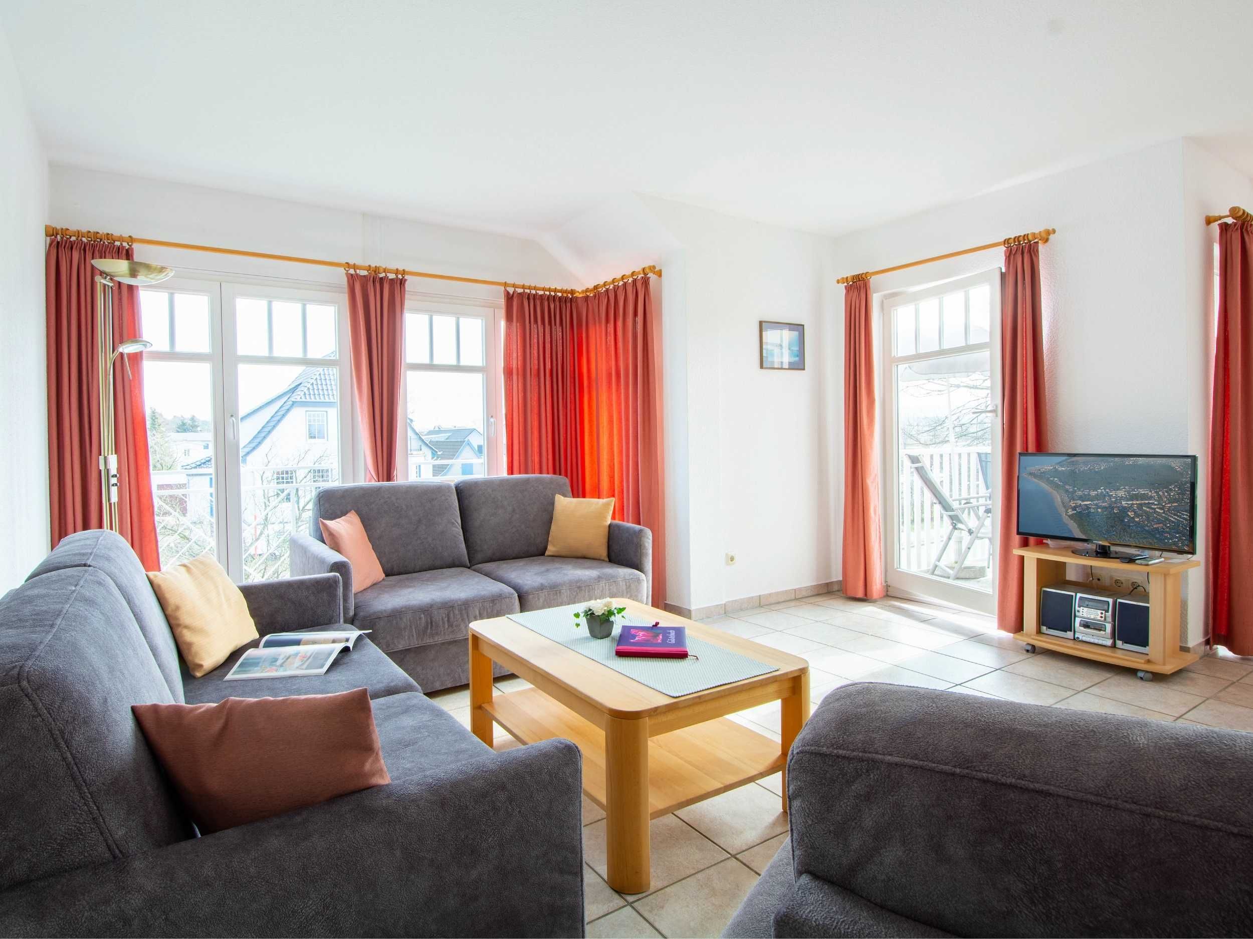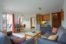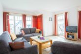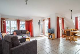 Im lichtdurchfluteten Wohnraum der Ferienwohnung lädt Sie eine gemütliche und moderne Couchgarnitur zu geselligen Abendstunden ein. Eine Couch kann mit wenigen Handgriffen zu einer bequemen Schlafcouch umfunktioniert werden (160cm Breite). Zu Ihrer Unterhaltung stehen Ihnen ein 32-Zoll-Flatscreen-TV und ein Radio zur Verfügung. Der Essbereich ist im großzügigen Wohnbereich integriert und bietet Ihnen viel Platz für Ihre Mahlzeiten.