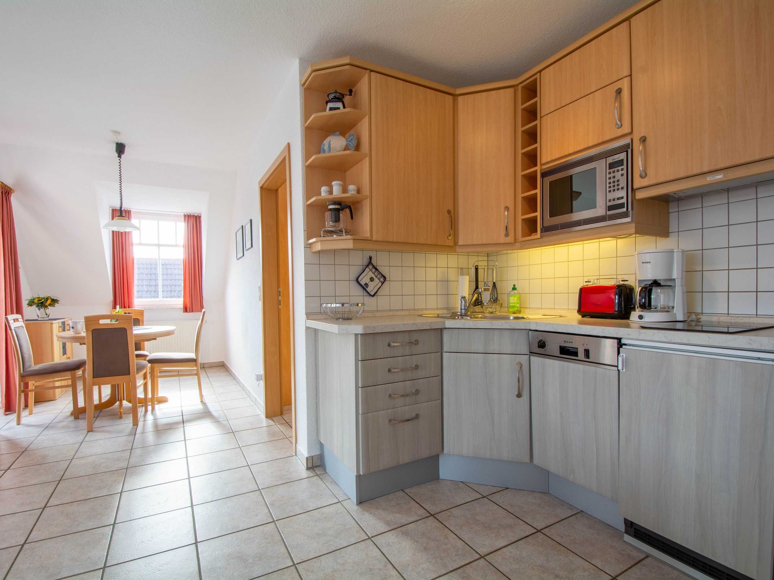Die offene Küchenzeile hält für Sie alle wichtigen Küchengeräte und -utensilien bereit, die Sie für Ihr perfektes Dinner benötigen: Ein 2-Zonen-Cerankochfeld, eine Mikrowelle, ein Geschirrspüler sowie ein Kühlschrank mit Gefrierfach befinden sich in der Küche. Eine Kaffeemaschine, ein Wasserkocher und ein Toaster sowie genügend Koch- und Essgeschirr vervollständigen die Kücheneinrichtung.