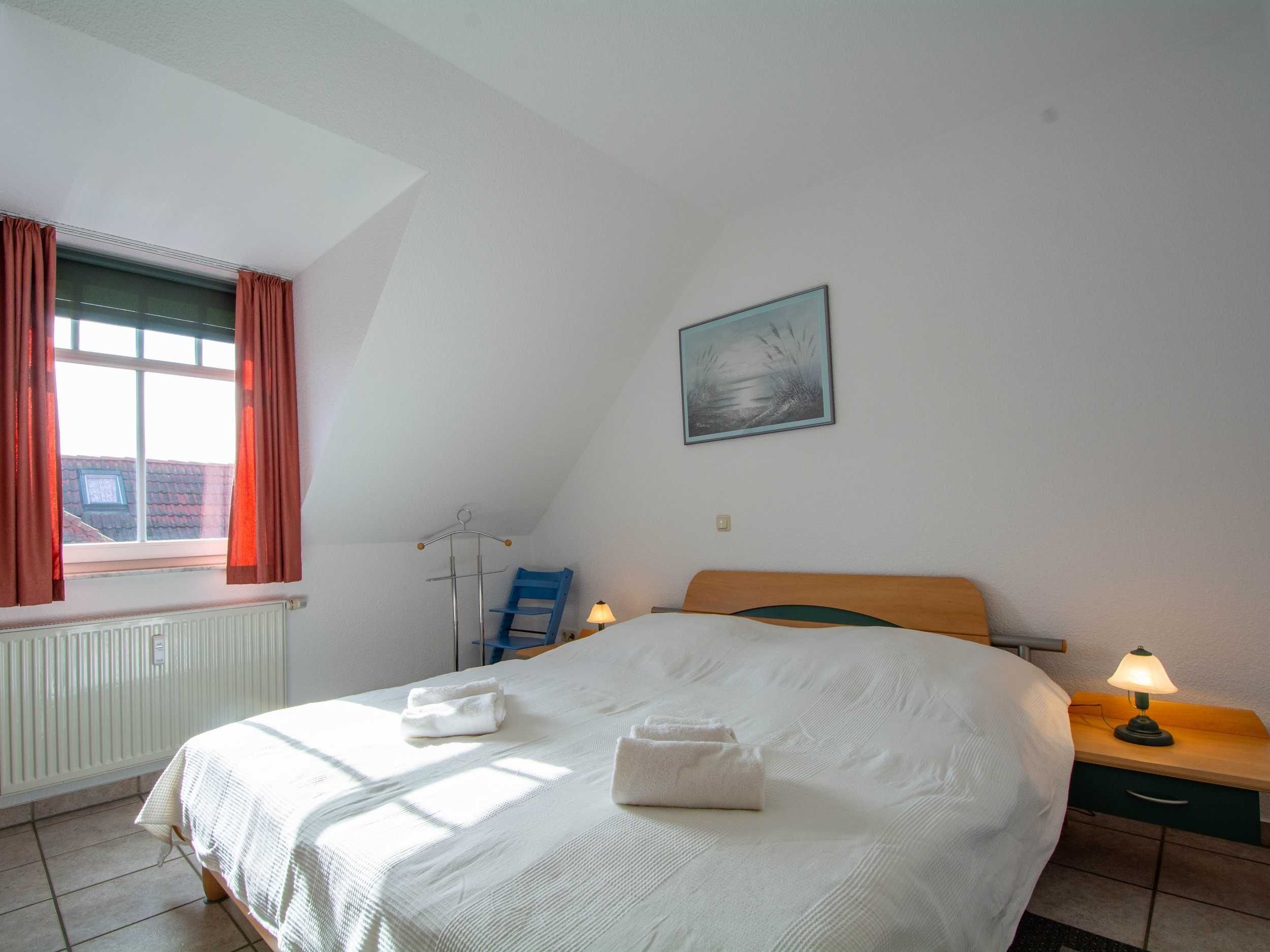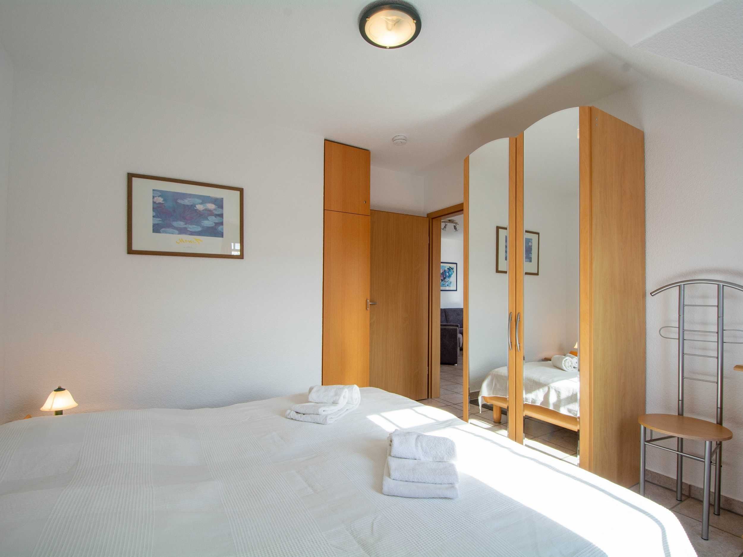 Im Schlafzimmer lädt Sie ein komfortables Doppelbett (2 x 90cm x 200 cm) zur Nachtruhe ein. Der geräumige Kleiderschrank mit Ganzkörperspiegel bietet genügend Platz für Ihre Urlaubsgarderobe. Das Bad mit Dusche und WC vervollständigt das Gesamtbild dieser Wohnung.