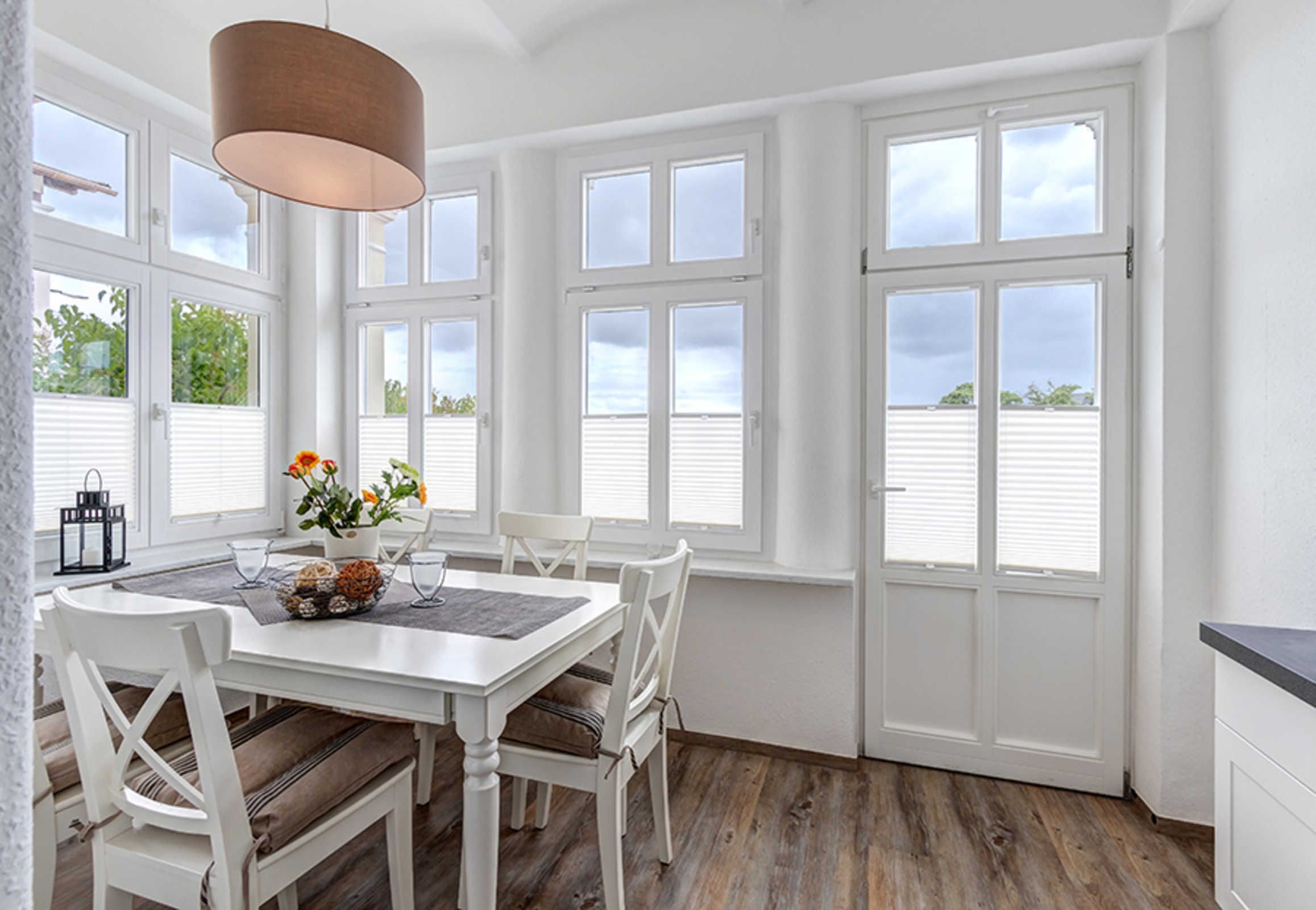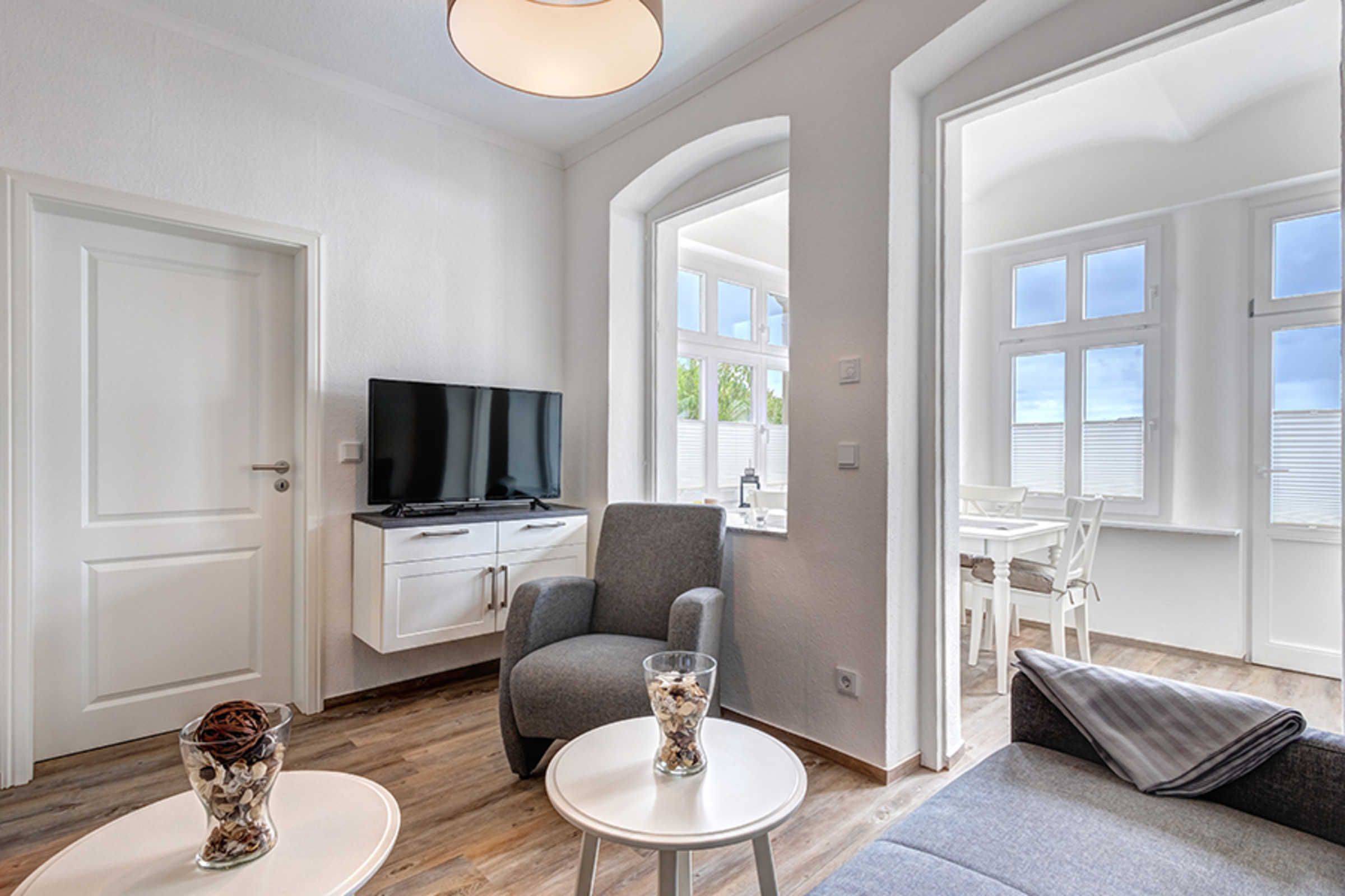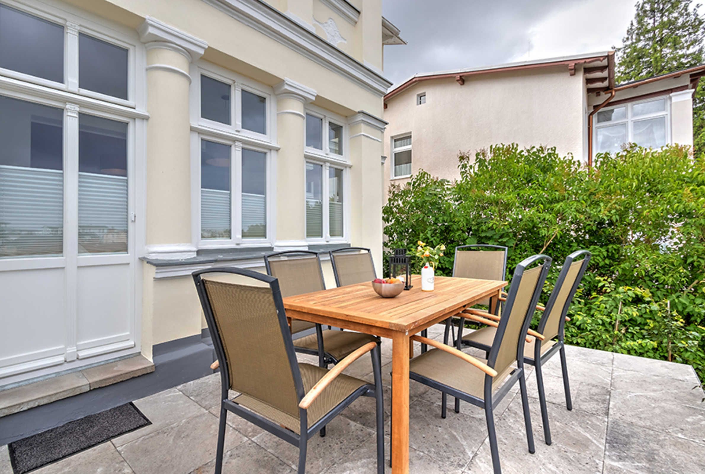 Schicke 4-Zimmer-Wohnung für bis zu 5 Personen mit Veranda und TERRASSE. Die Wohnung ist modern und dennoch gemütlich eingerichtet und komfortabel ausgestattet. Sie wird 2018 komplett renoviert, mit Fußbodenheizung! Die Wohnung verfügt über drei separate Schlafzimmer (eines davon für eine Person und eines mit zugehörigem ensuite-Duschbad), Wohnzimmer mit Küchenzeile, Essplatz in der Veranda und ein weiteres Bad mit Wanne und Dusche. Die Wohnung verfügt weiter über einen Eingangsflur mit Garderobe. Aus der Veranda gelangt man auf die möblierte Terrasse und in den Garten. Ein Pkw-Stellplatz ist inklusive. Die Villa Margarete steht etwas erhöht in der Bergstrasse, wodurch sich ein schöner Blick ergibt. Die Wohnung befindet sich im EG, etwa 300m zur Strandpromenade. Zum Ortszentrum und der bekannten Ahlbecker Seebrücke sind es ca. 8-10 Minuten zu Fuß. Die Zufahrt mit dem Auto erfolgt über die Ferdinand-Egelinski-Straße.
