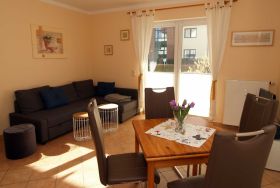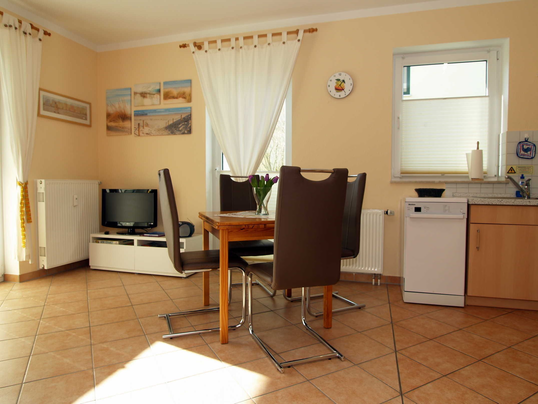 Es begrüßt Sie ein heller offener Wohn- und Essbereich mit gemütlicher Couchgarnitur. Die Wohncouch lässt sich in wenigen Handgriffen zu einem gemütlichen Schlafplatz umwandeln (120cm Breite). Für Unterhaltung sorgen ein 46-Zoll-Flachbild-TV und ein Radio. Von hier betreten Sie die großzügige möblierte Südterrasse, auf der Sie die Sonne genießen und entspannen können. Der Wohnbereich ist offen gestaltet: Hier befindet sich auch ein Esstisch und die voll ausgestattete Küchenzeile.