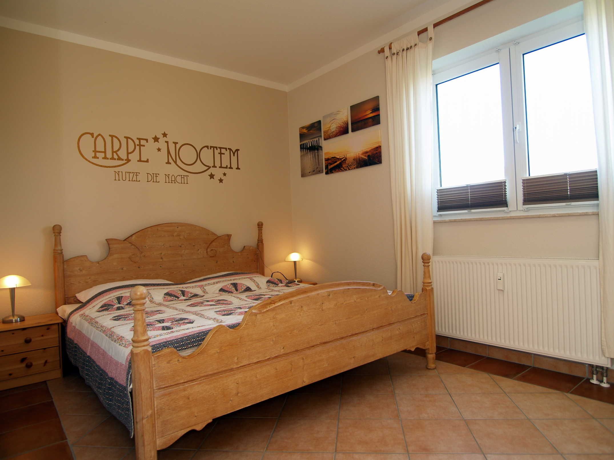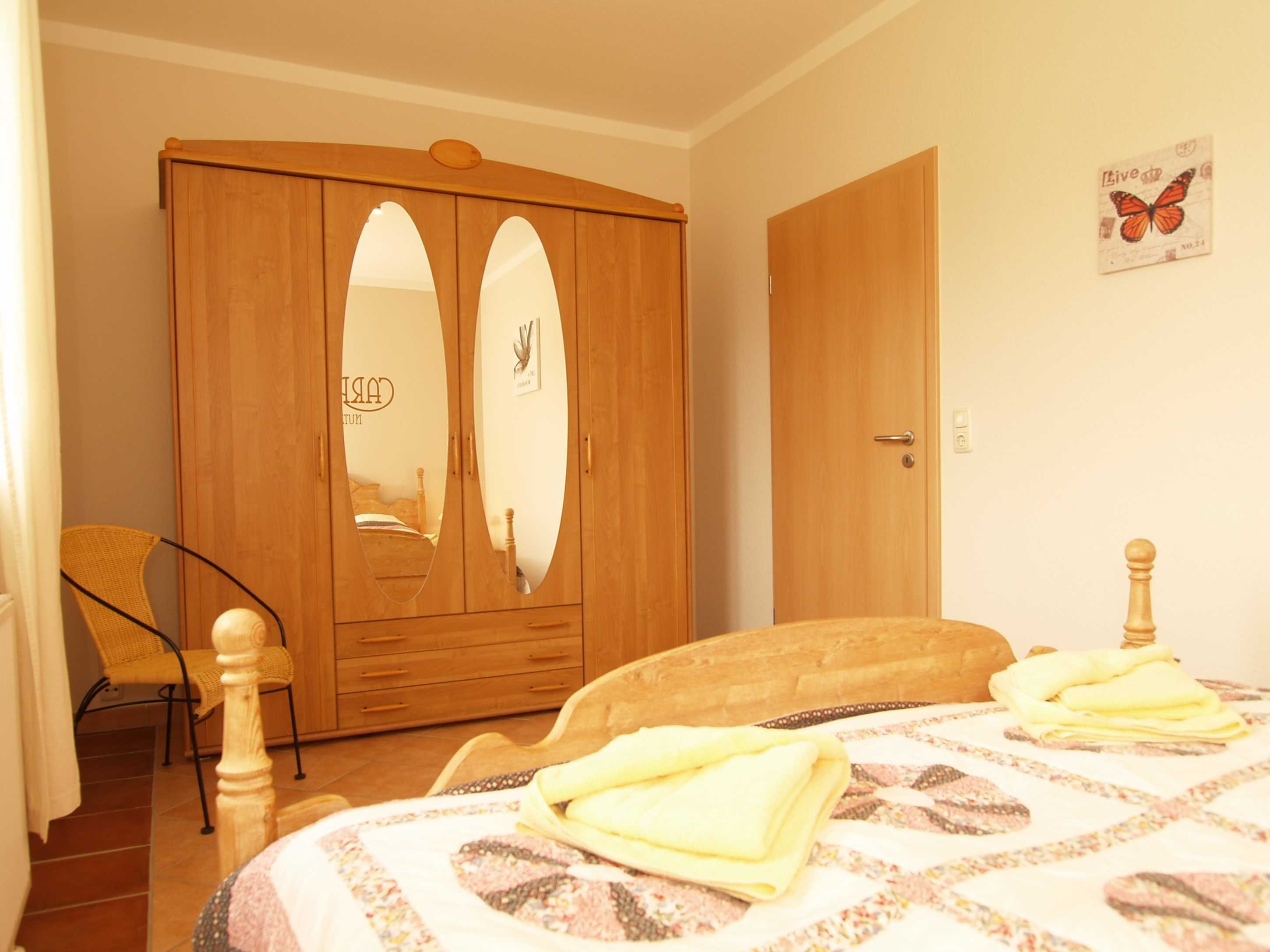 Im Schlafzimmer lädt Sie ein komfortables Doppelbett (2 x 90cm x 200 cm) zur Nachtruhe ein. Der geräumige Kleiderschrank mit Ganzkörperspiegel bietet genügend Platz für Ihre Urlaubsgarderobe. Ein weiterer 26-Zoll-TV befindet sich hier im Schlafzimmer. Als Sichtschutz sind im Schlafzimmer und im Wohnzimmer Plissees und Vorhänge angebracht.