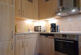 Der offene Wohn- und Küchenbereich ist geschmackvoll eingerichtet und ist mit einem Kaminofen, einem TV mit USB/HDMI und Radio ausgestattet. Die Küchenzeile wurde mit Kaffeemaschine, Wasserkocher, Kühlschrank mit Gefrierfach, Mikrowelle, Geschirrspüler und Herd mit Cerankochfeld und Backofen ausgestattet.