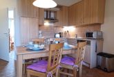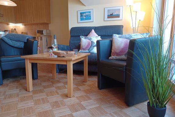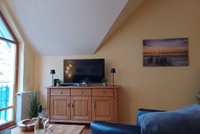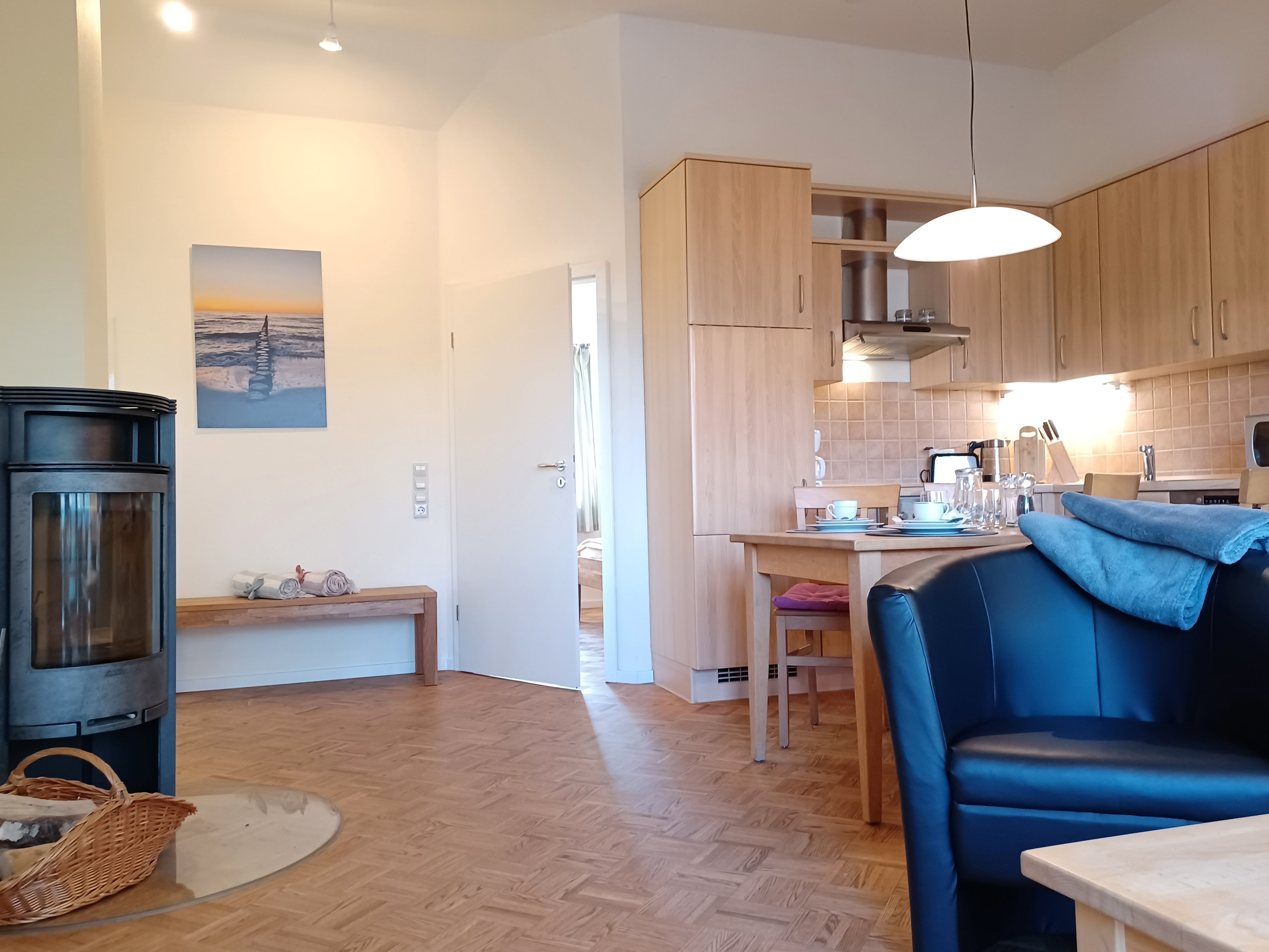 Der offene Wohn- und Küchenbereich ist geschmackvoll eingerichtet und ist mit einem Kaminofen, einem TV mit USB/HDMI und Radio ausgestattet. Zur Küchenausstattung gehören Kaffeemaschine, Wasserkocher, Kühlschrank mit Gefrierfach, Mikrowelle, Geschirrspüler und Herd mit Cerankochfeld und Backofen .