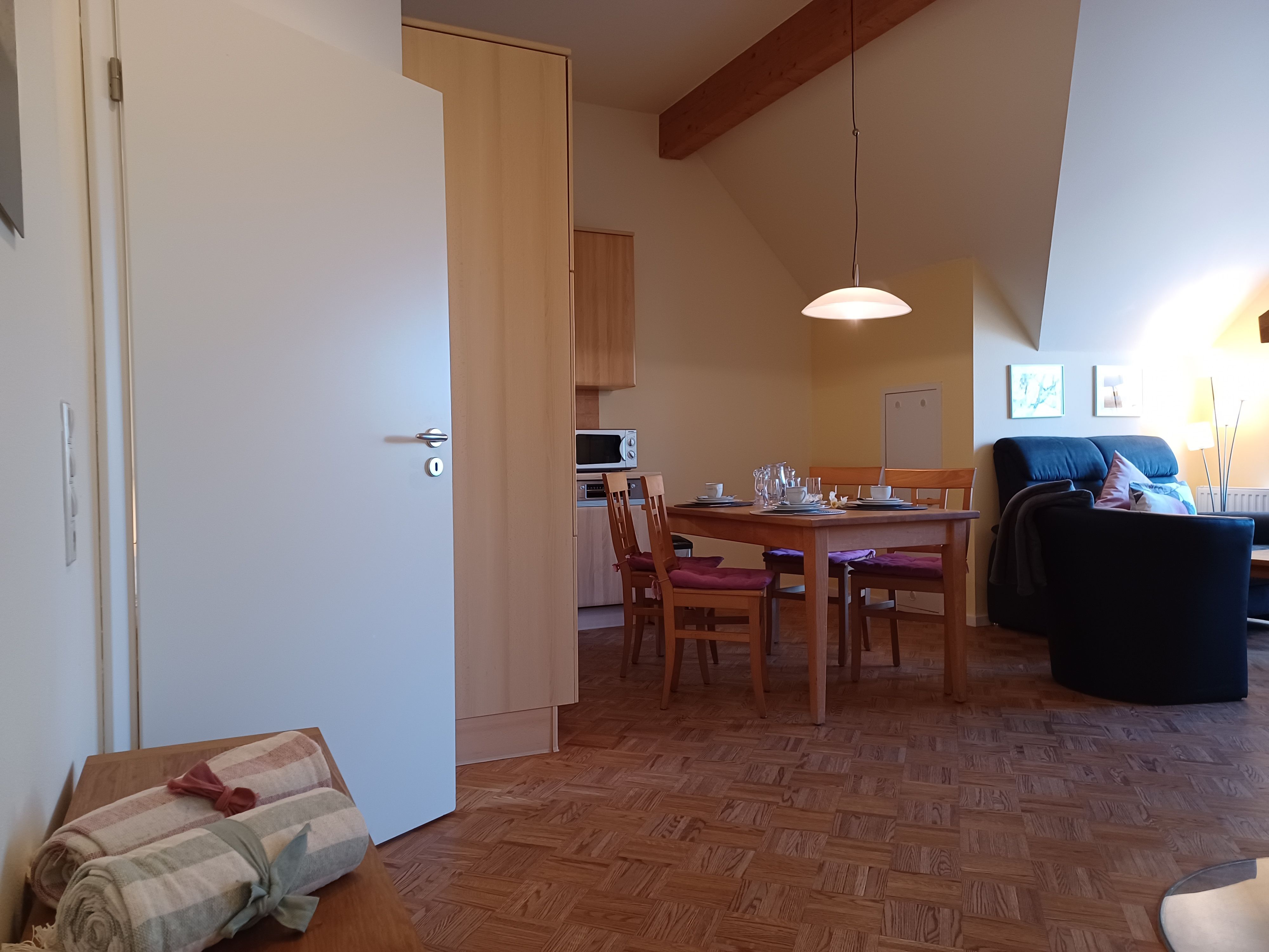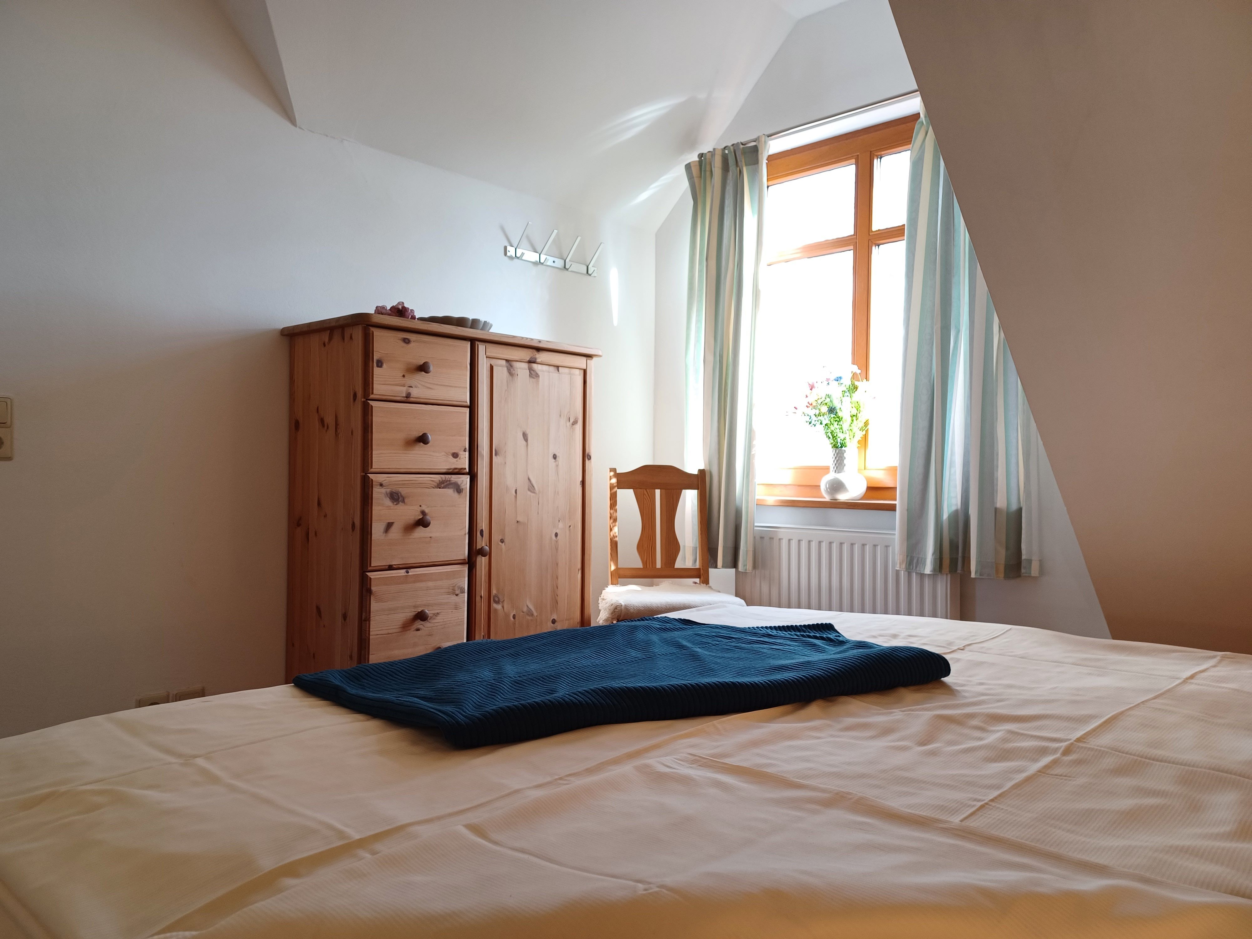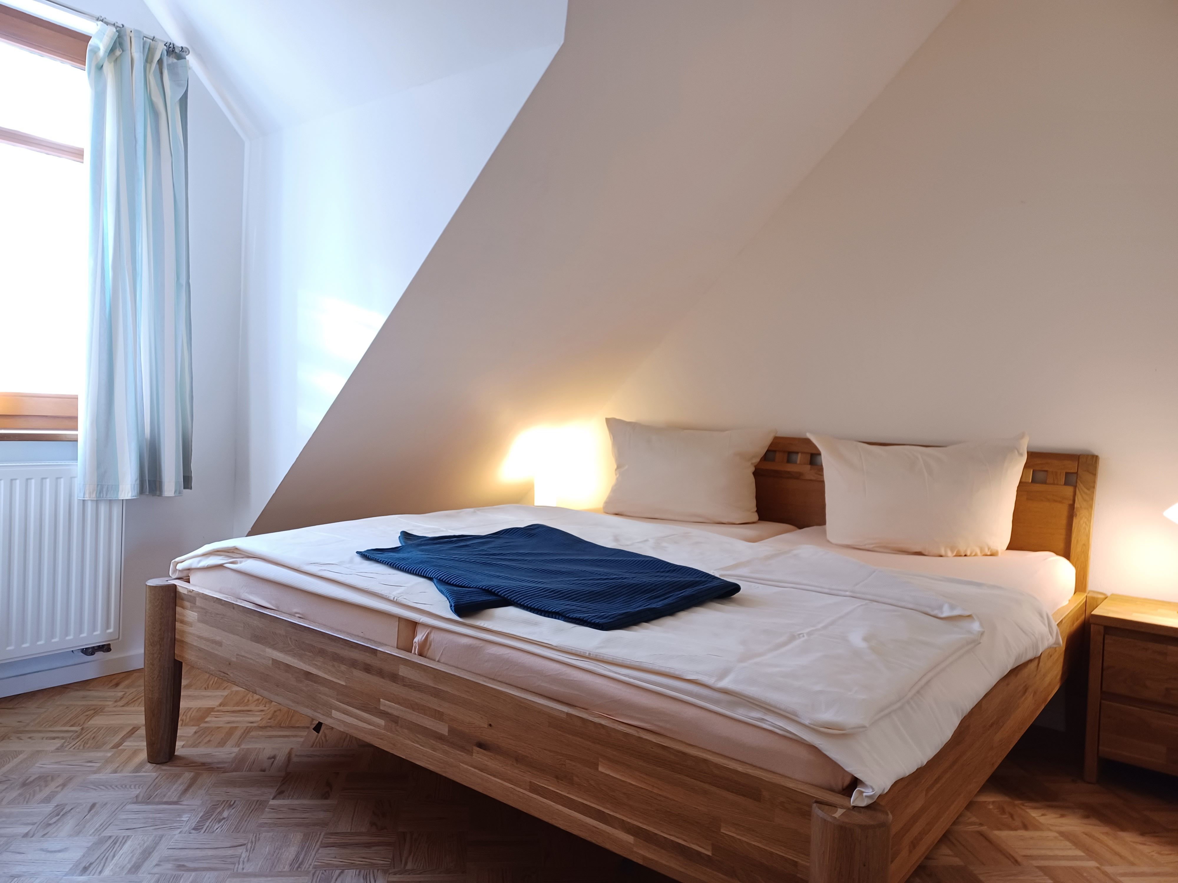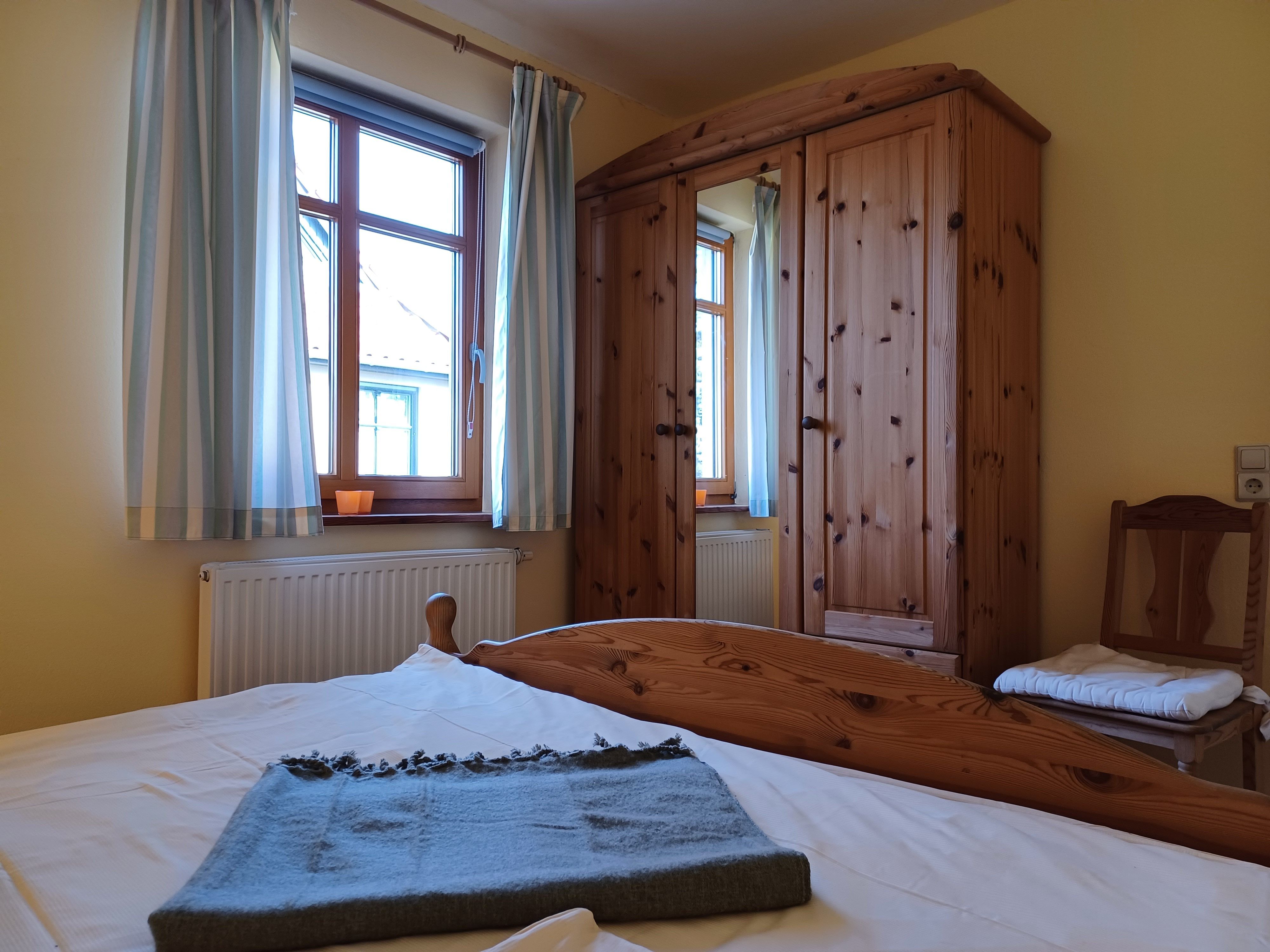 Die Ferienwohnung 4 befindet sich im Obergeschoss und verfügt über 2 Schlafzimmer mit Doppelbetten (jeweils 1,80 x 2,00 m mit getrennten Matratzen). Die Bettwäsche und Handtücher sind für Sie inklusive.