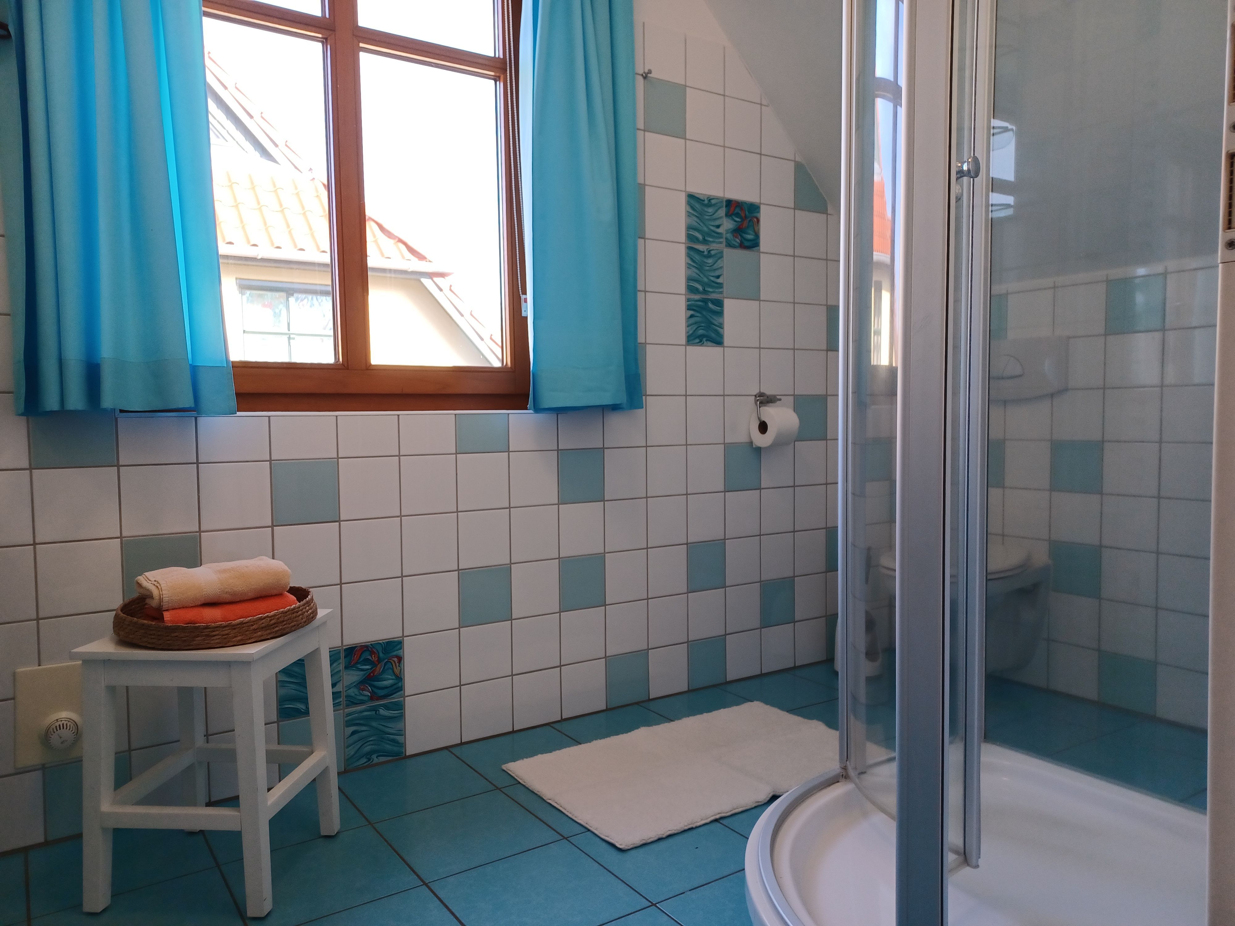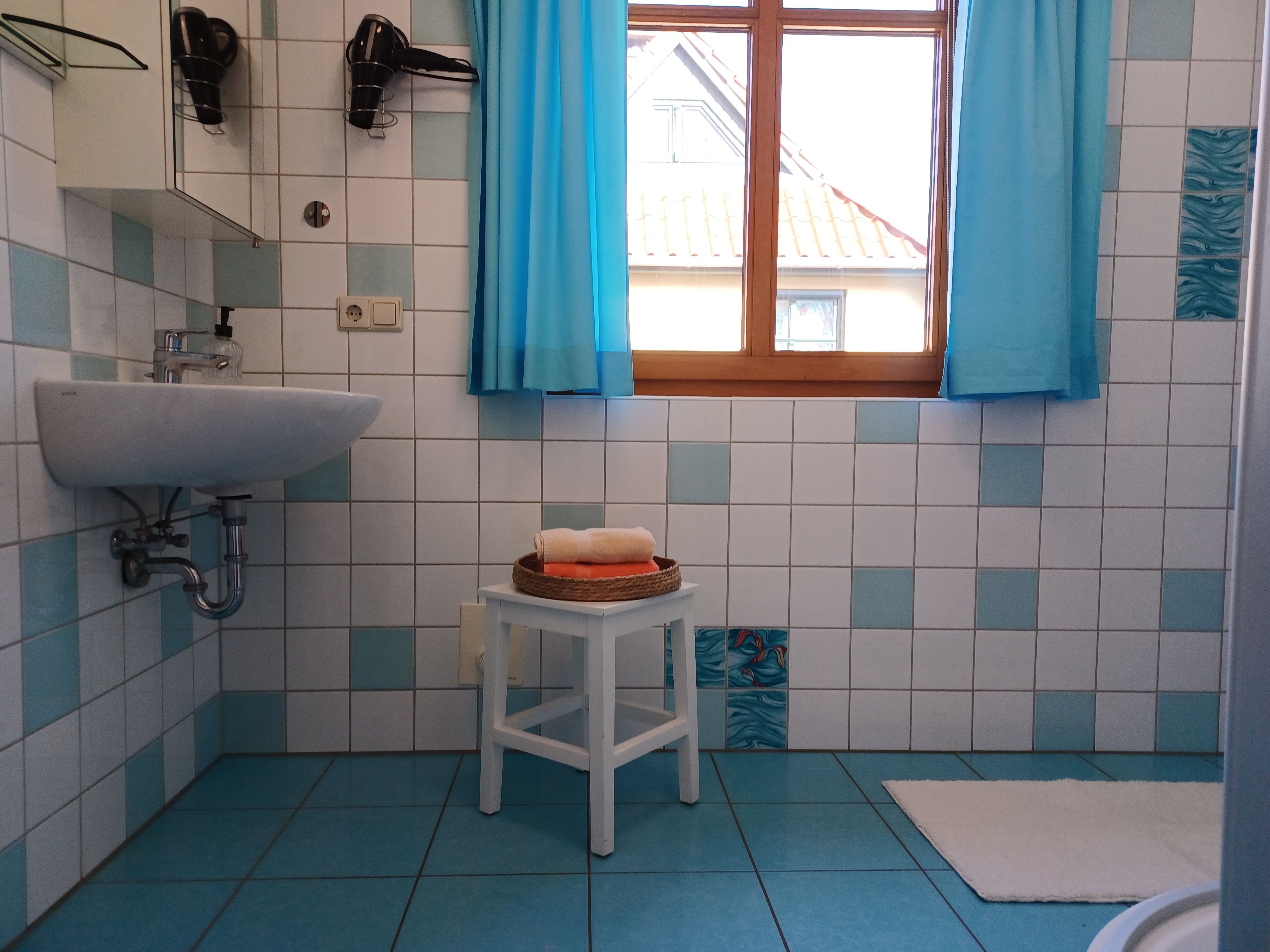 Das Badezimmer ist mit Dusche, WC und Fön ausgestattet.