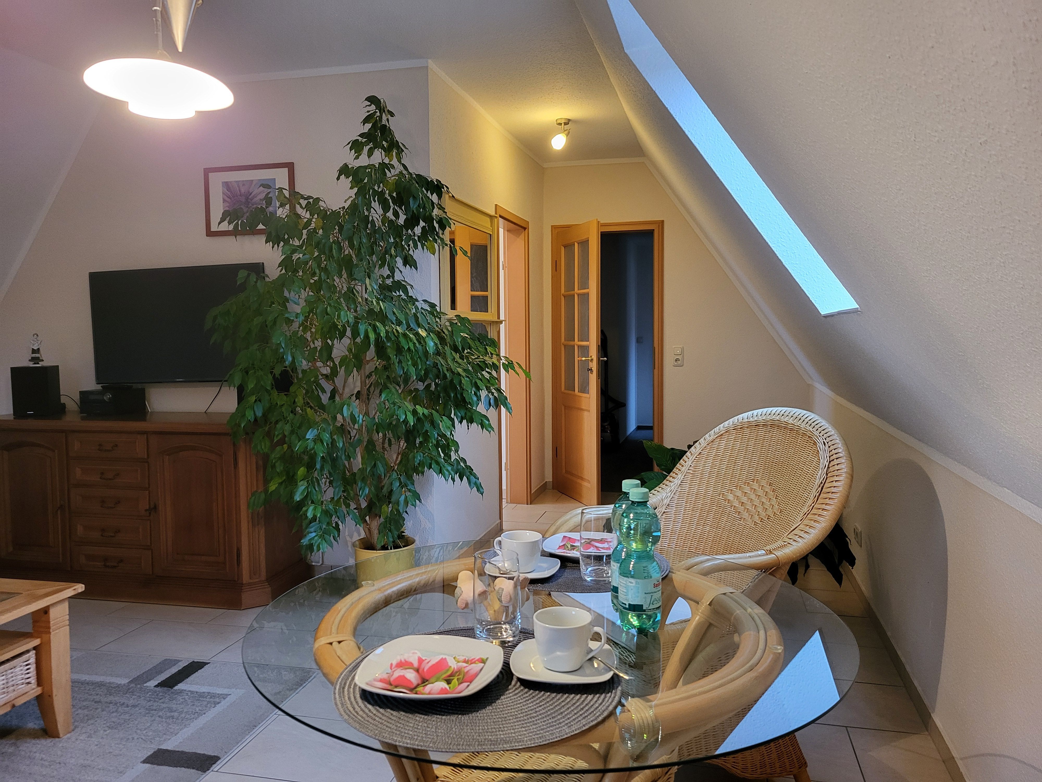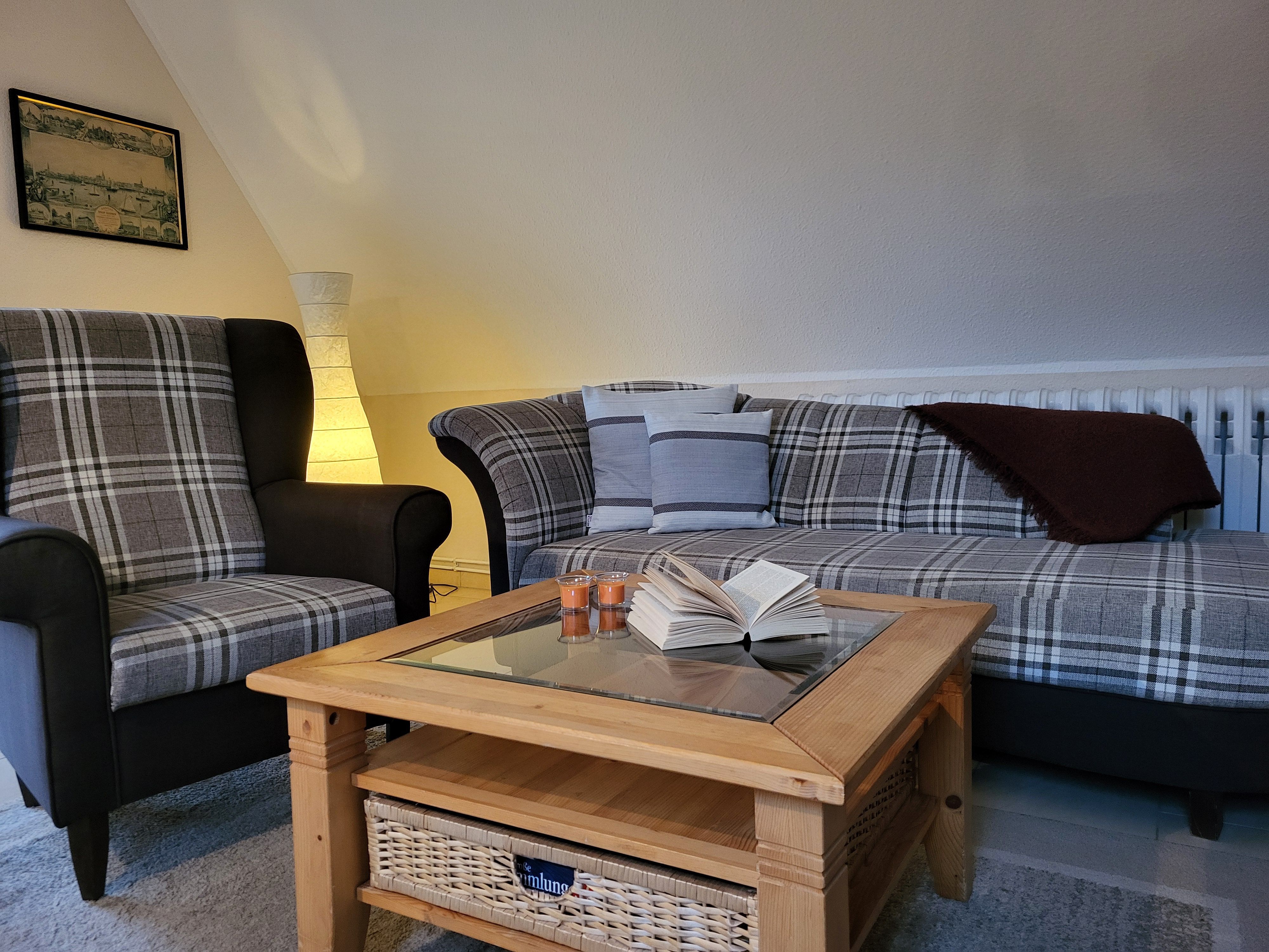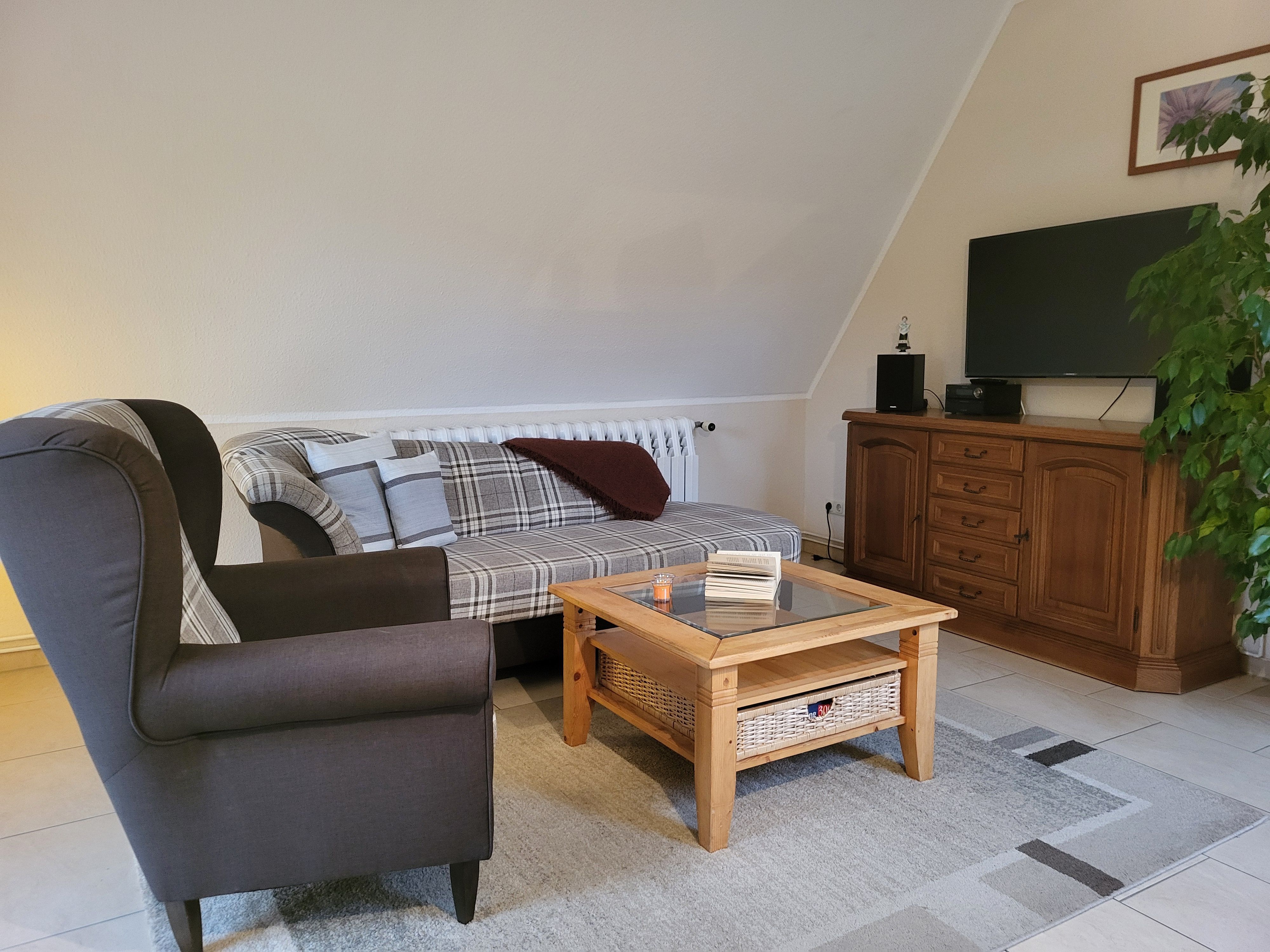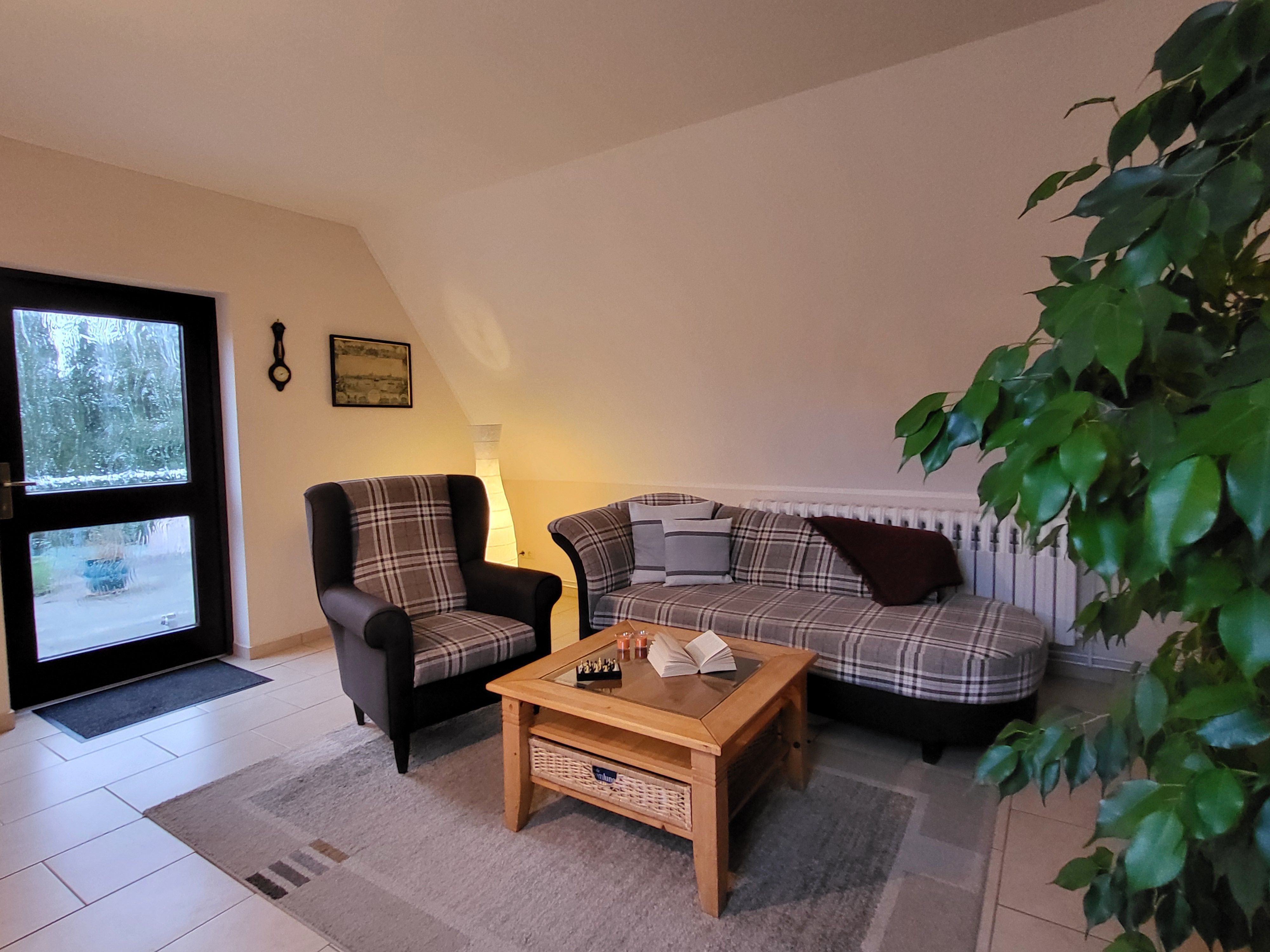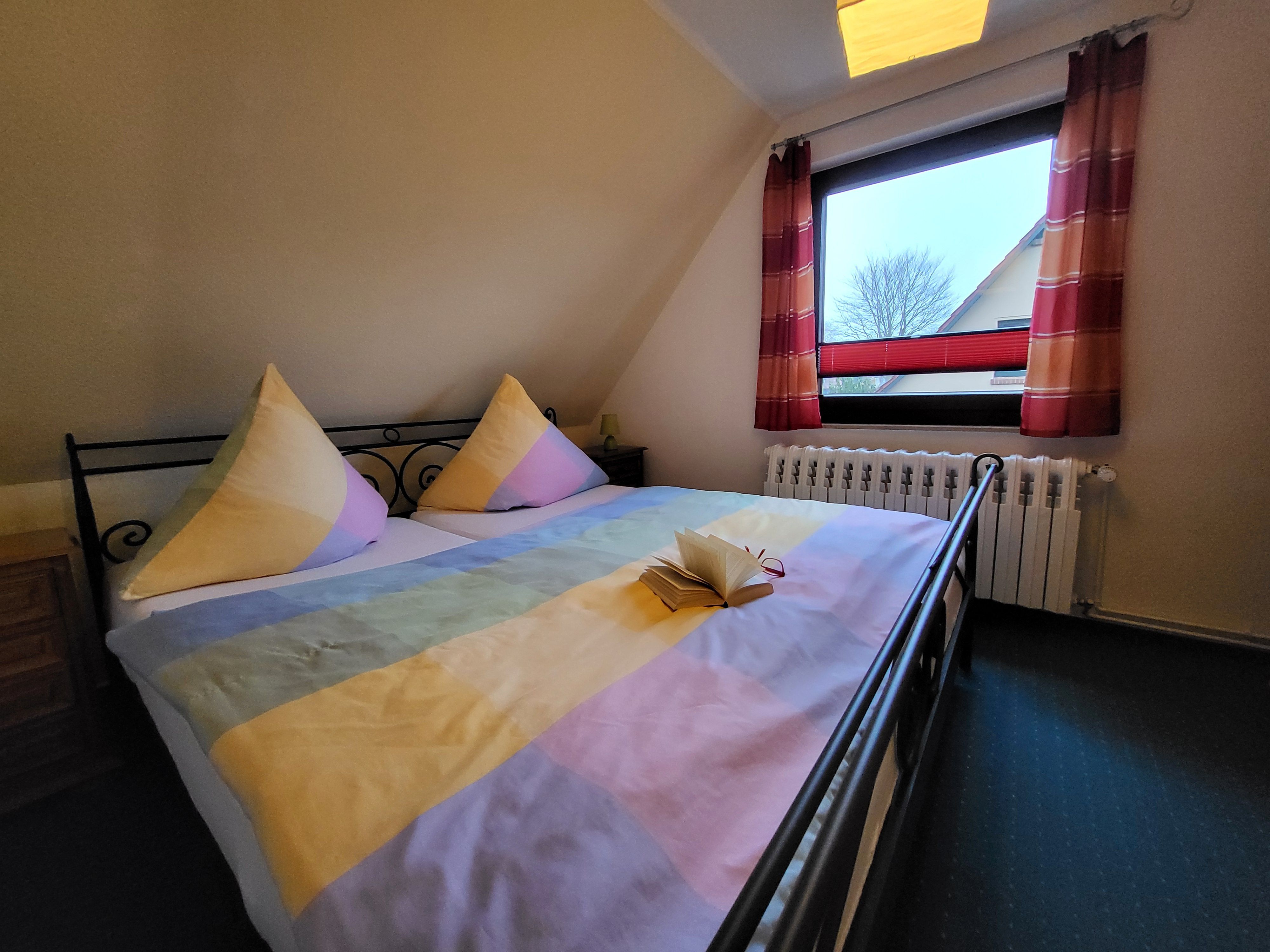 Neue modern und gemütlich eingerichtete Ferienwohnung im Obergeschoss, gelegen in ruhiger Lage am Ortsrand, mit separatem Eingang und Zugang zur Dach-Terrasse die zum entspannen einlädt. Der feinsandige Strand ist etwa 250 m entfernt. Das Wohnzimmer verfügt über eine gemütliche Couch und SAT- TV, sowie einen Essplatz. Im Schlafzimmer steht ein Doppelbett 1,80 x 2,00 m ( getrennte Matratzen ) bereit. In der Küchenzeile finden Sie ein Cerankochfeld mit 4- Platten, eine Mikrowelle und einen Kühlschrank. Im Bad mit gibt es eine Badewanne. Unsere Wohnung ist eine Nichtraucherwohnung. Das Schlafzimmer und Bad ist mit Mückenschutz ausgestattet. Die Bettwäsche ist inklusive, Handtücher können Sie in der Zimmervermittlung zubuchen für 7,00 € pro Person (1 Badetuch, 1 Handtuch). Ein Parkplatz befindet sich auf dem Grundstück.
