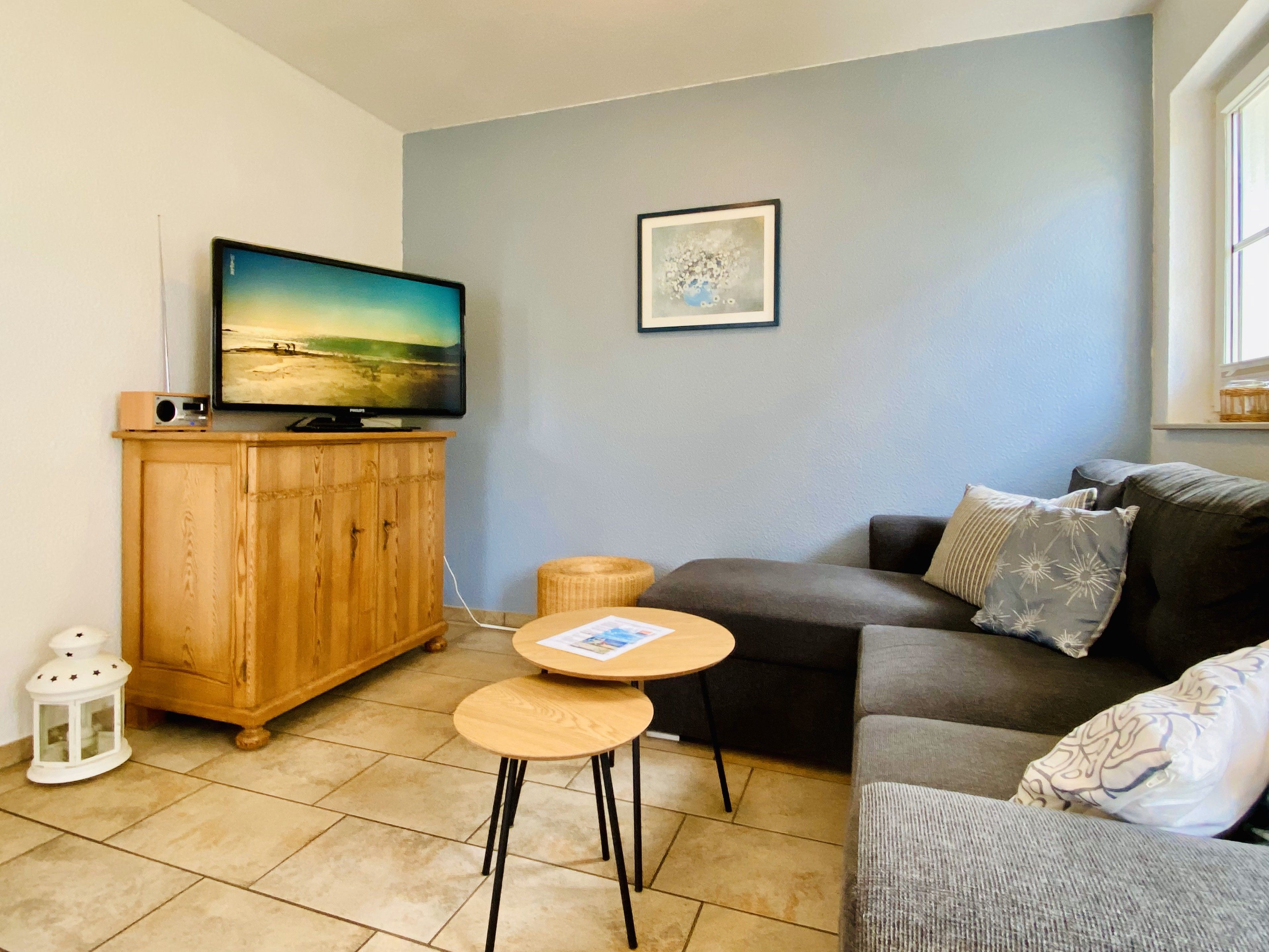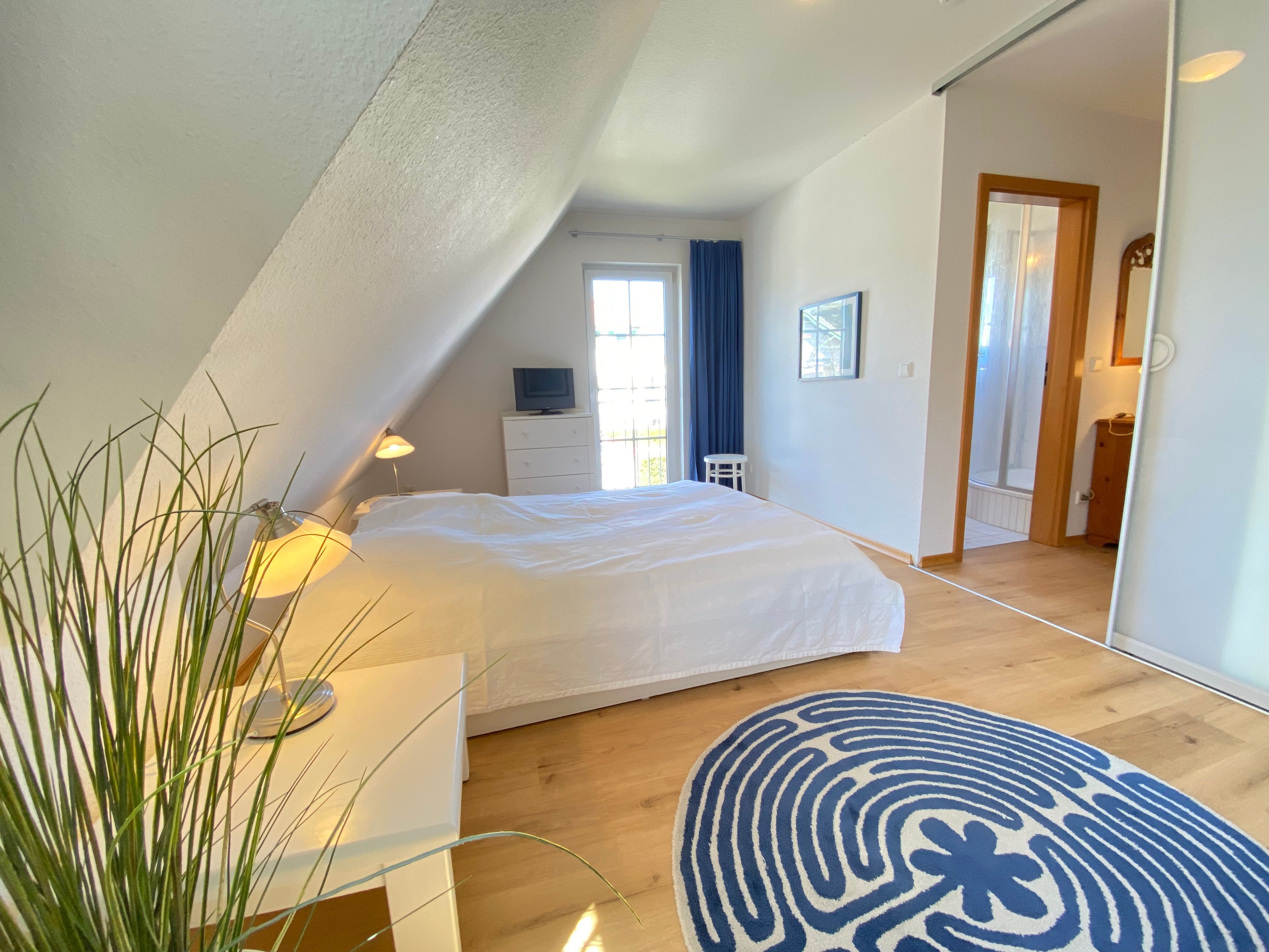 Die gemütliche Dreizimmerwohnung erstreckt sich über 3 Ebenen. In der unteren Ebene findet sich der kombinierte Wohnraum mit Küchenzeile und Zugang zur Terrasse. Eine schöne Holztreppe führt nach oben ins große Schlafzimmer mit Doppelbett (TV) und zum Bad (Dusche). Ganz oben gibt es ein zweites Schlafzimmer, in dem ebenfalls ein Doppelbett steht.