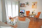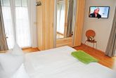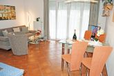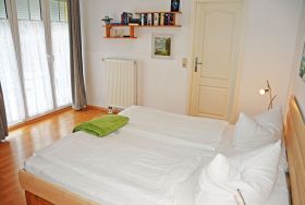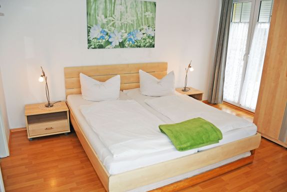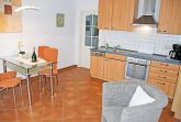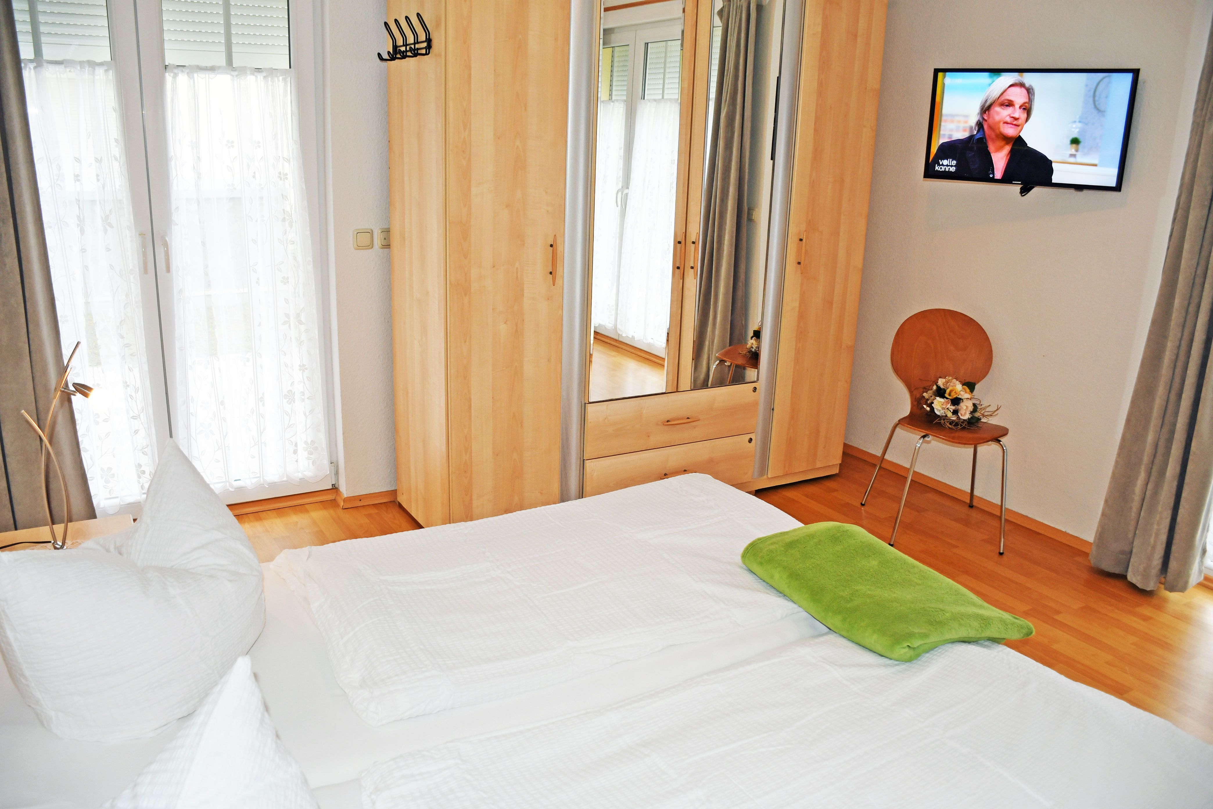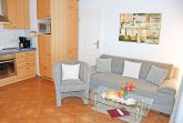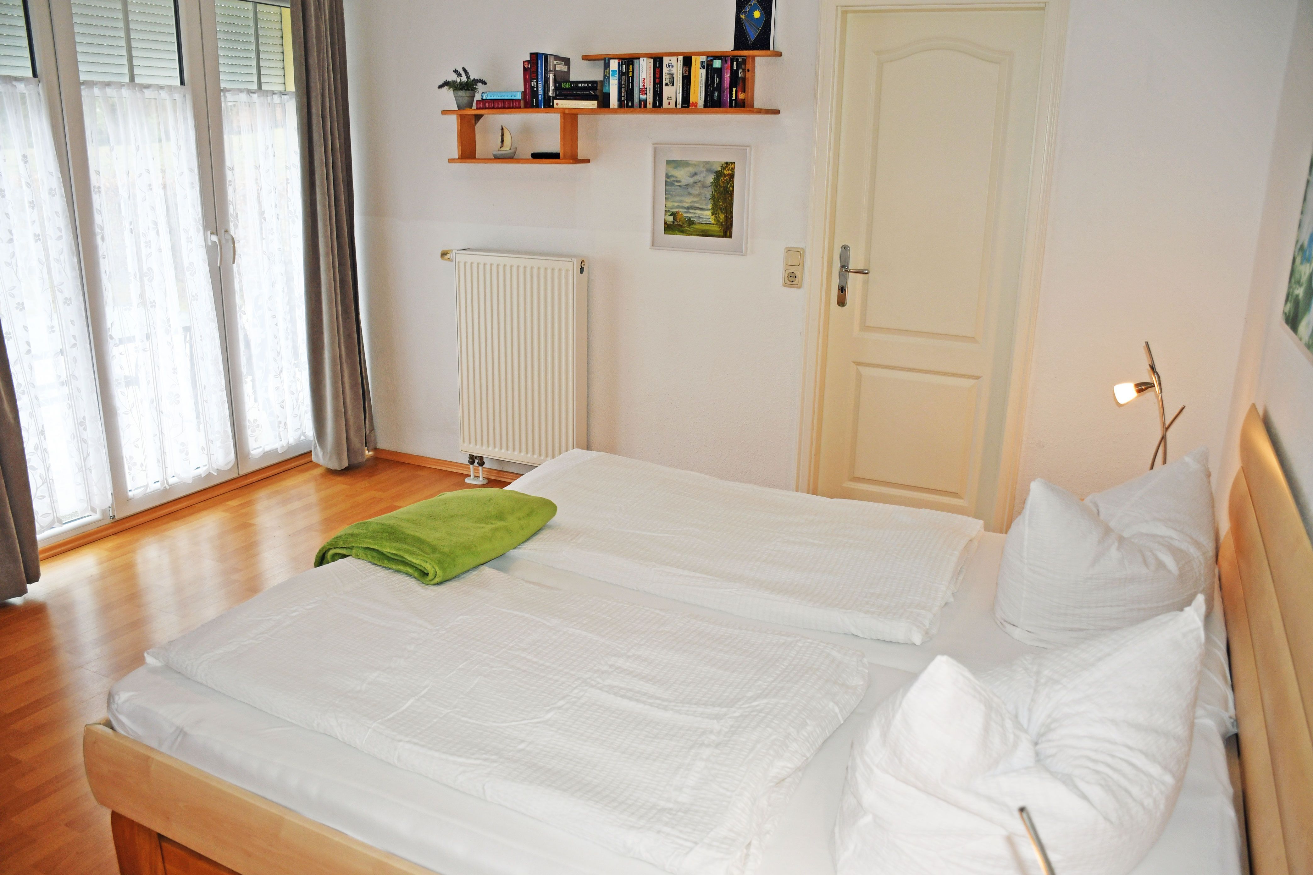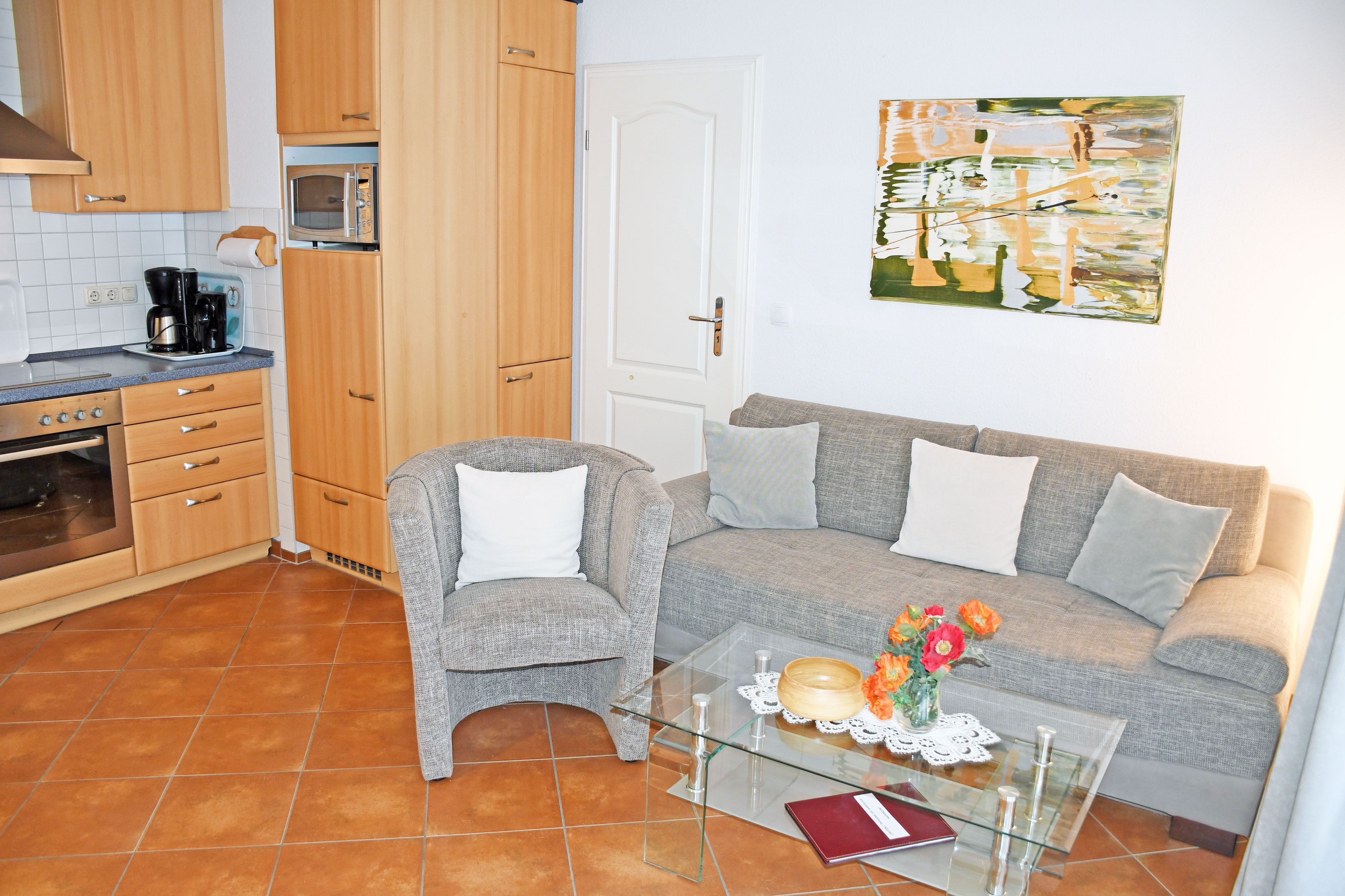 Sie werden von einer hellen und freundlichen 2-Zimmer Ferienwohnung in Parterre begrüßt, die über einen kleinen Flur betreten wird. Von hier aus kommen Sie in die Du/WC und durch eine Glastür in den Wohn-Küchenbereich. Eine moderne Wohnküche mit Vollausstattung (Cerankochfeld, Kühlschrank incl. TK-Fach, Geschirrspülmaschine, Mikrowelle, Kaffeemaschine, Wasser- und Eierkocher, Toaster ect.) Durch die hohen Terrassenfenster ist der Wohn-und Schlafbereich sehr lichtdurchlässig. Die ausziehbare Couch im Wohnzimmer oder das Schiebebett unter dem Doppelbett im Schlafzimmer oder ein zur Verfügung stehendes Klappbett bieten eine weitere Schlafmöglichkeit.