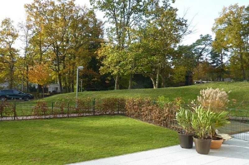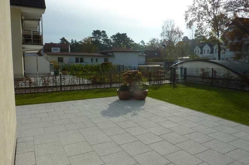 Die große Außenterrassenfläche mit „Grünbereich“ lädt schon mal am Haus zum entspannen ein