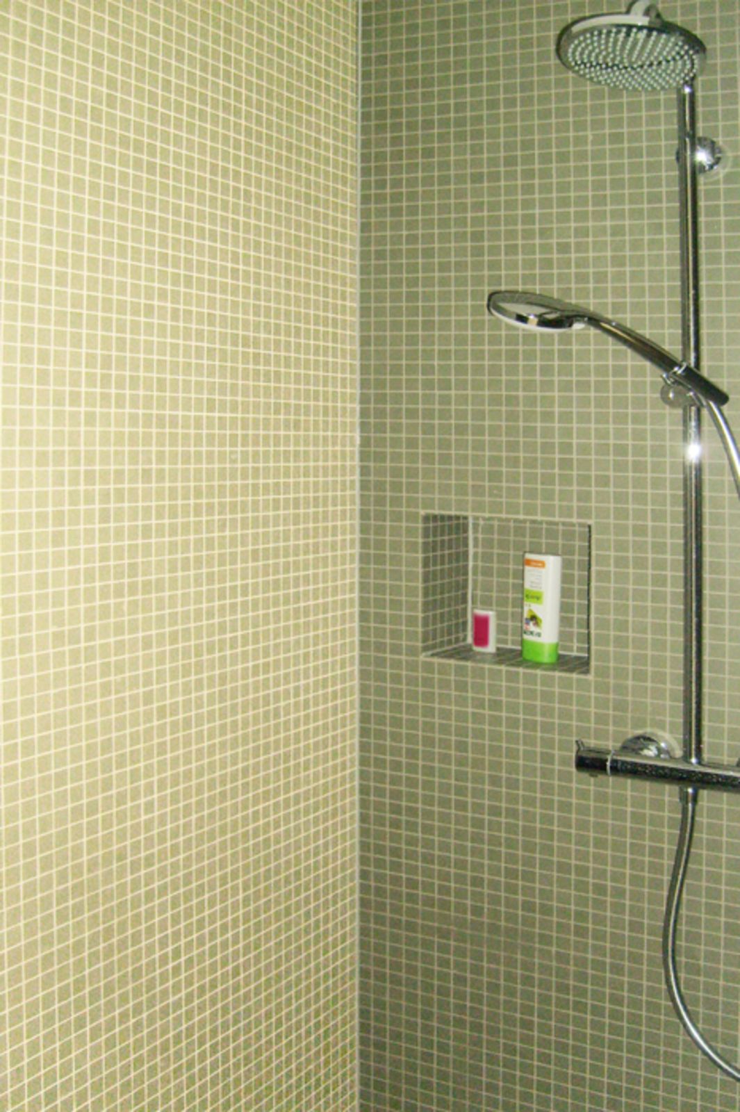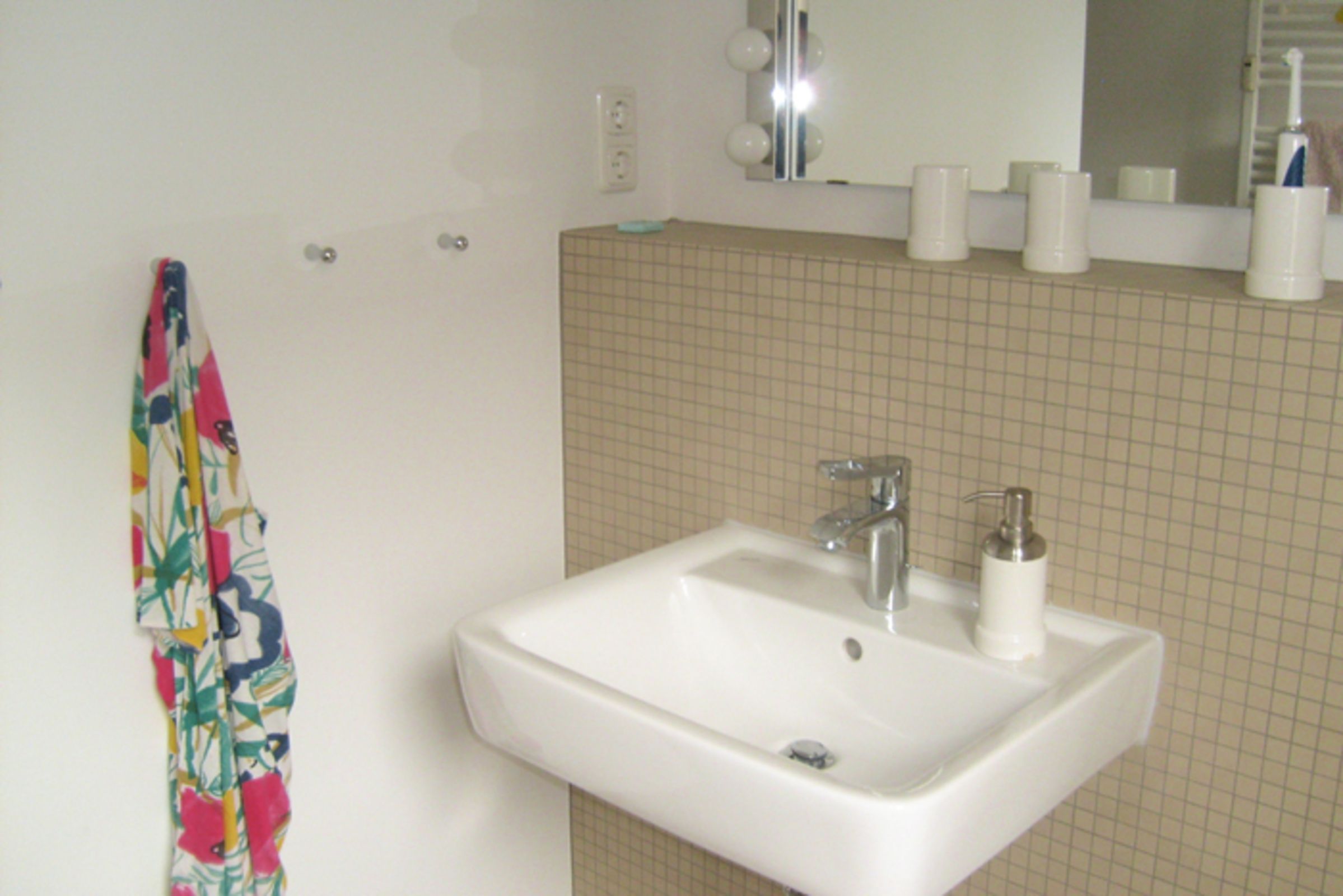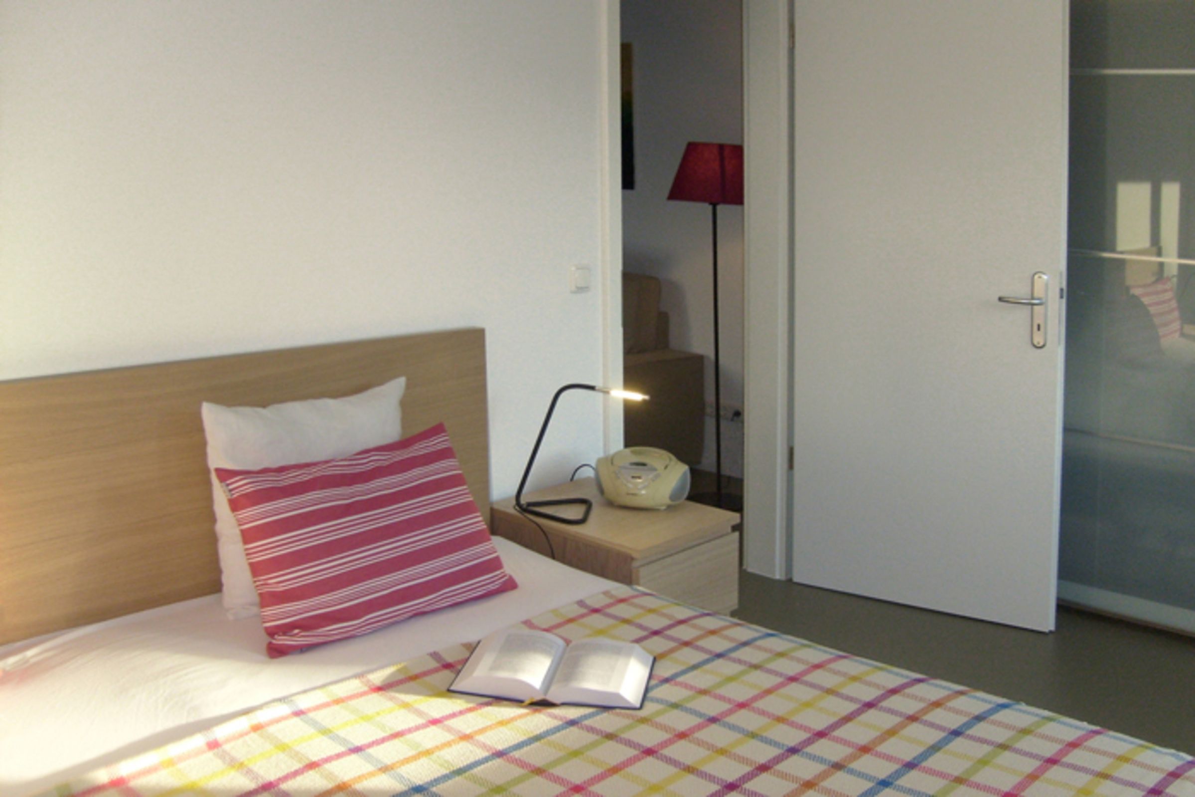 Ein Schlafzimmer mit Doppelbett und geräumigem Schiebetürenschrank, ein komfortabler Wohnbereich mit kombinierter (Schlaf-)Couch und einem Fernseher, sowie ein großzügiges Badezimmer mit ebenerdigem Zugang zur Dusche gehören mit zur Ausstattung.