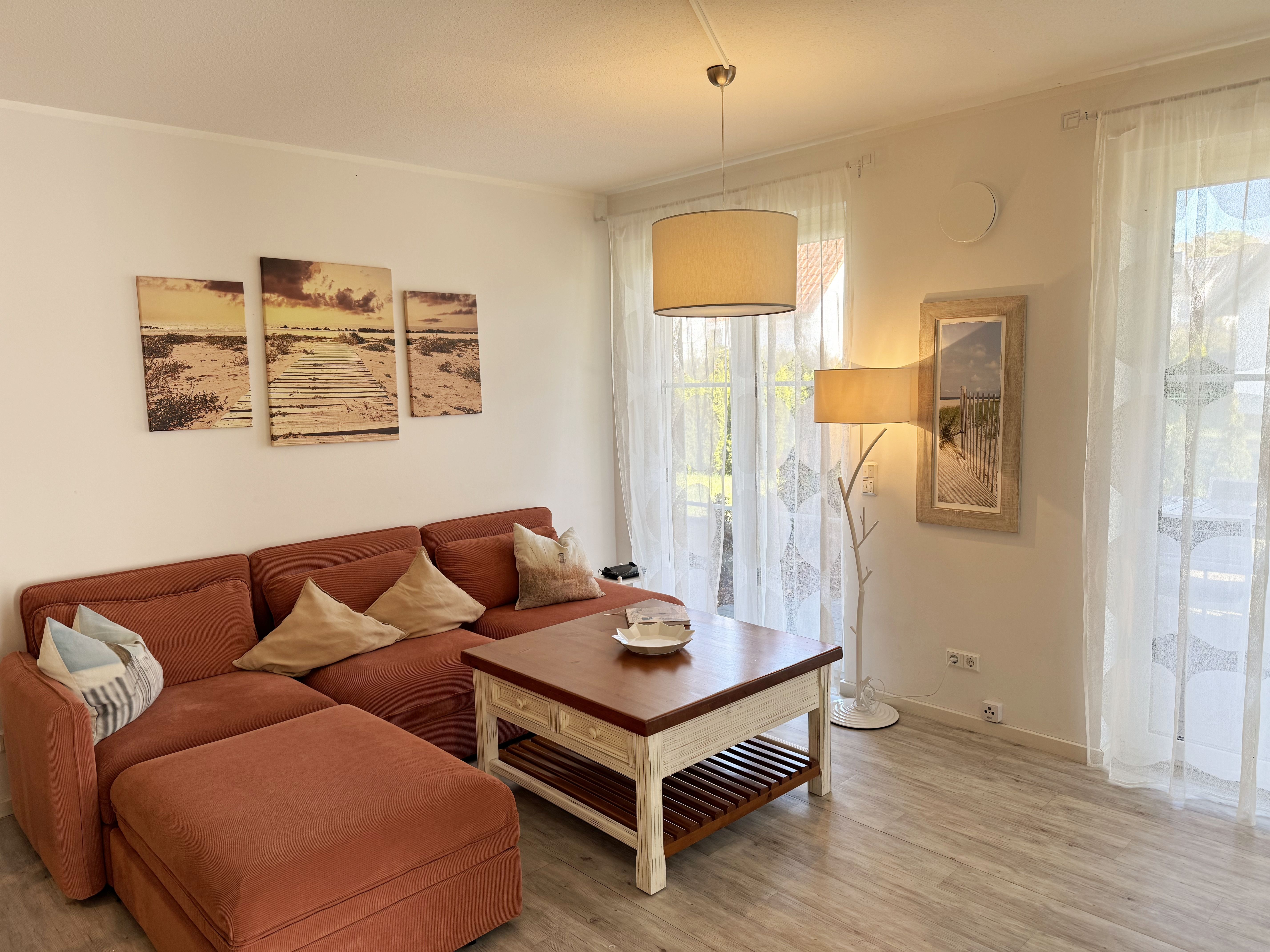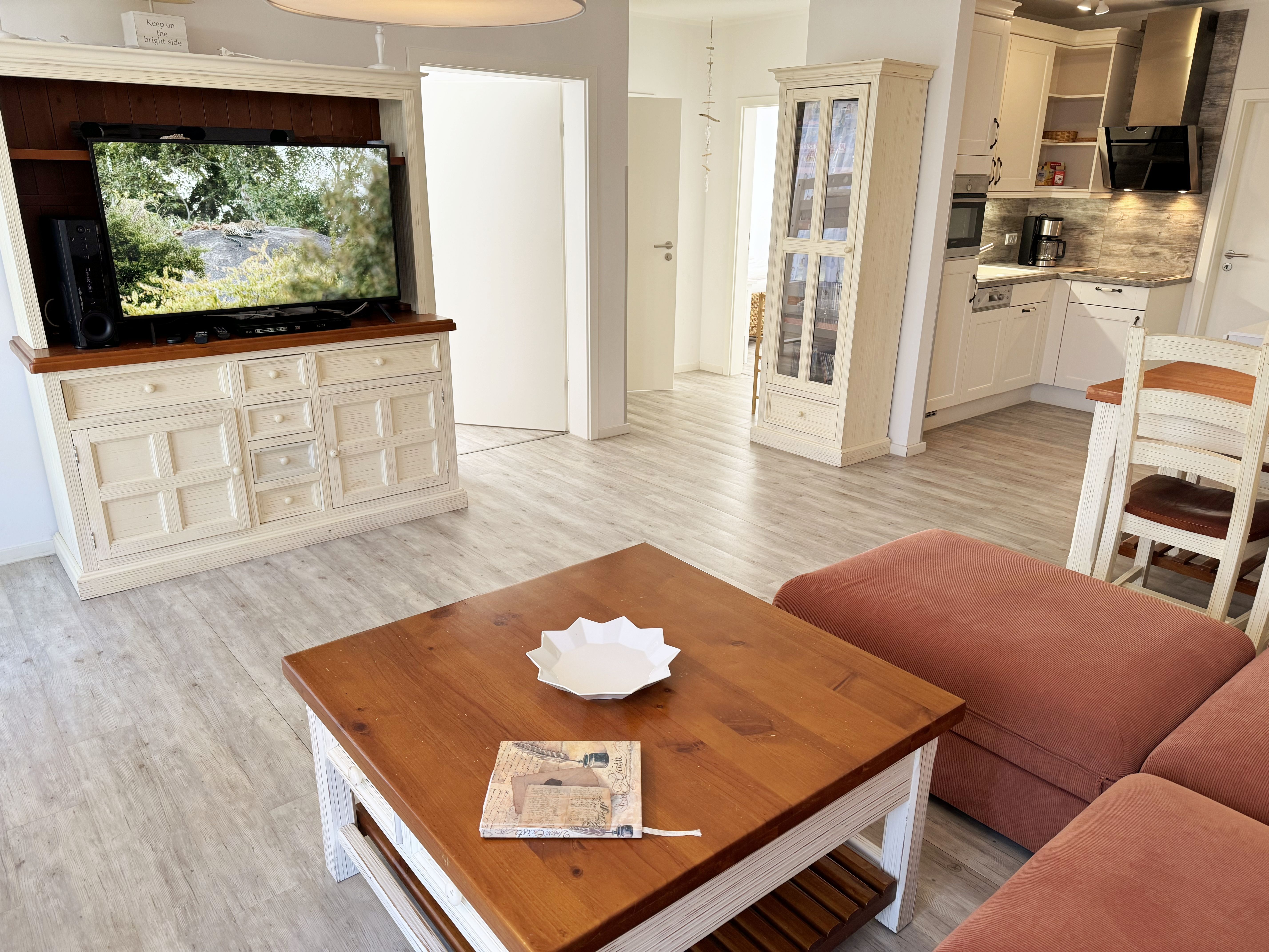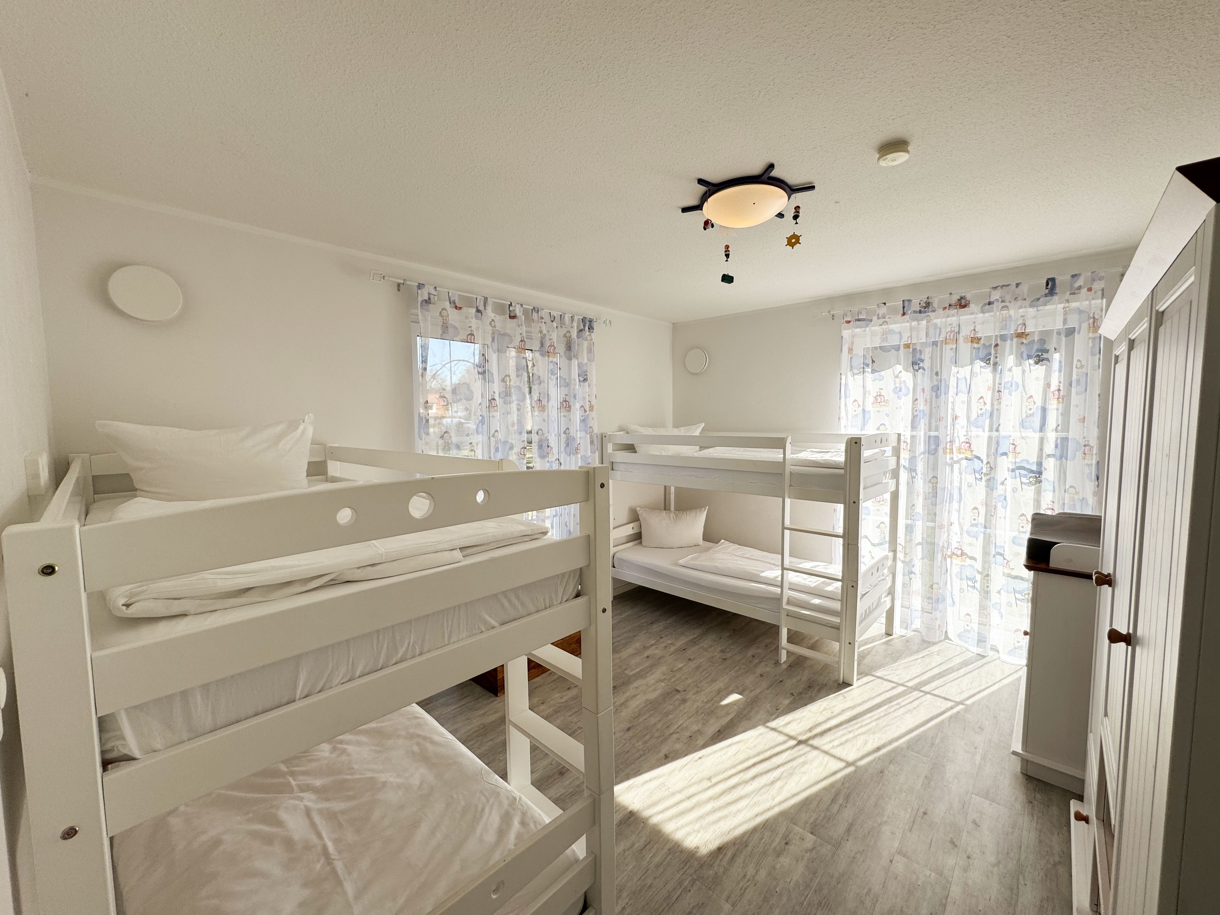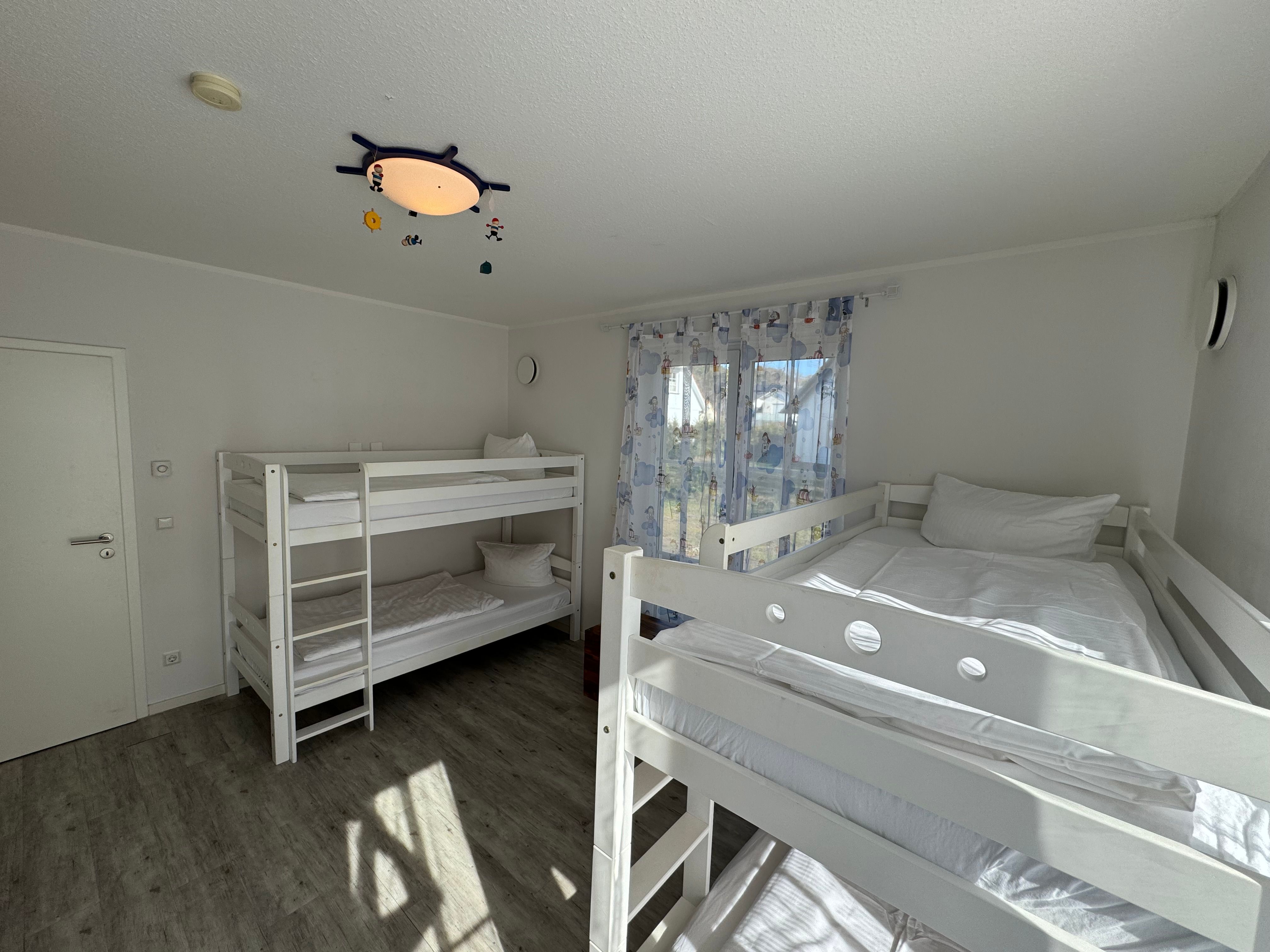 Die Ferienwohnung ist mit einer Be- und Entlüftungsanlage, elektrischen Rollläden, großen Terrassenfenstern und -Türen sowie Fußbodenheizung und in allen Räumen mit Vinylboden und Fliesen ausgestattetet. Sie ist liebevoll im maritimen Stil mit hochwertigen Massivholzmöbeln eingerichtet. Die Wohnung ist für max. 4 Erwachsene und 2 Kinder bis 17 Jahre. Dem freundlichen Eingangsbereich mit Garderobe, Sitzbank, Spiegel und Memoboard schließt sich das Wohn-Esszimmer mit offener Küchenzeile an. Die komfortable Küchenzeile verfügt über einen Backofen, eine Kühl-Gefrierkombination, Geschirrspüler, Spüle, Mikrowelle, Kaffeemaschine, Wasserkocher, Toaster, Cerankochfeld sowie diverse Küchenutensilien. Im angrenzenden Hauswirtschaftsraum befindet sich eine Waschmaschine zur Inklusiven Nutzung. Der großzügige Essbereich besticht durch einen großen Tisch mit 6 Stühlen sowie zwei Kinderhochstühle. Im gemütlichen Wohnbereich lädt das große Ecksofa zum Entspannen und Fernsehen ein. Dafür stehen ein 4K-TV mit Soundbar, Smart-TV und Blue-Ray/DVD-Player und Leselampe bereit. Auch im Urlaub brauchen Sie auf einen Internetanschluß (WLAN) nicht verzichten. Dieser ist für Sie inklusive. Die Vitrine beherbergt eine kleine Spiele- und Filmeauswahl. Das große Schlafzimmer bietet neben einem Sekretär und einem großen Kleiderschrank ein King-Size Doppelbett mit zwei 1,00m x 2,00m Matratzen sowie einer Komforthöhe von 60cm mit verstellbaren Lattenrosten, Nachttisch-Konsolen und einen Smart-TV. Das abenteuerliche Kinderschlafzimmer hält vier kuschelige Kojen in zwei Etagenbetten für wagemutige Piraten oder Prinzessinnen bereit. Genügend Stauraum für das Hab und Gut sind in der Wickelkommode und dem großen Kleiderschrank zu finden. Eine große Schatzkiste mit Spielsachen lädt zum Entdecken ein. Alle Betten sind ausgestattet mit Komfort-Kaltschaum-Matratzen. Zwei Kinderreisebetten mit zusätzlichen Matratzen sind inklusive. Das Tageslicht - Bad hat neben einem Waschtisch, Handtuchheizung, Fön, beleuchtetem Spiegel, Kosmetikspiegel, WC und begehbarer Dusche eine zusätzliche Belüftung. Die nahezu barrierefrei zu erreichenden, drei großen Terrassen in Ost- oder Südausrichtung mit Terrassenmöbeln bieten genügend Platz zum gemeinsamen Spielen, Erholen und Grillen. Zur komfortablen, Allergiker freundlichen Ferienwohnung gehören neben eigenem PKW-Stellplatz Nr. 03, ein eigener Schuppen mit Unterstellmöglichkeiten für Fahrräder, ein mobiler Kugelgrill und ein Bollerwagen. Haustiere sind nicht erlaubt. Die Erstausstattung eines Wäschepaketes (komplette Bettwäsche, 1 Duschhandtuch, 2 kleine Handtücher) können Sie bis 14 Tage vor Anreise gegen einen Aufpreis dazu buchen oder durch eigene ergänzen. Ab 2 gebuchten Paketen erhalten Sie einmalig 1 Geschirrhandtuch und 1 Duschvorleger hinzu. Wir freuen uns auf Ihren Besuch.