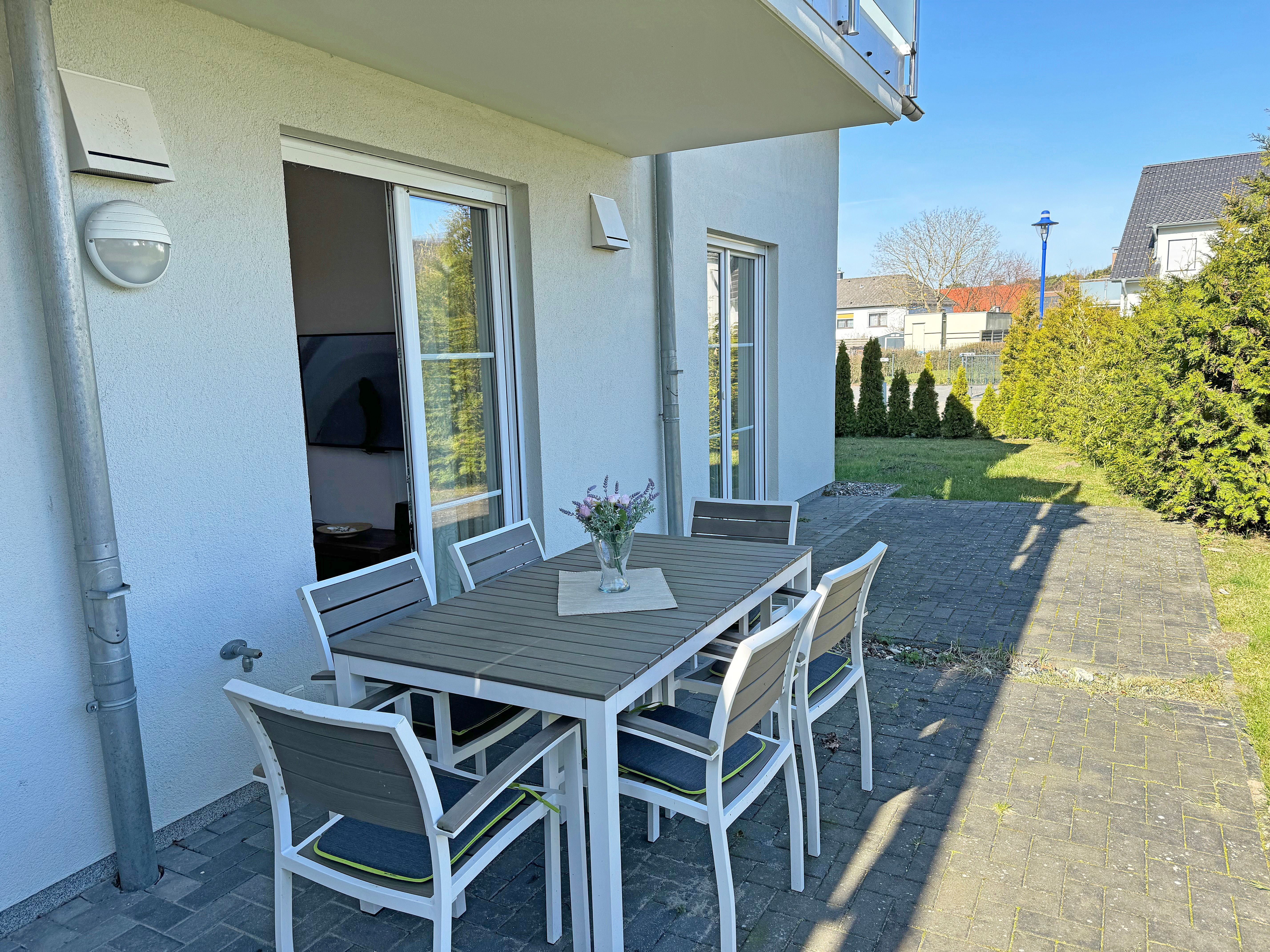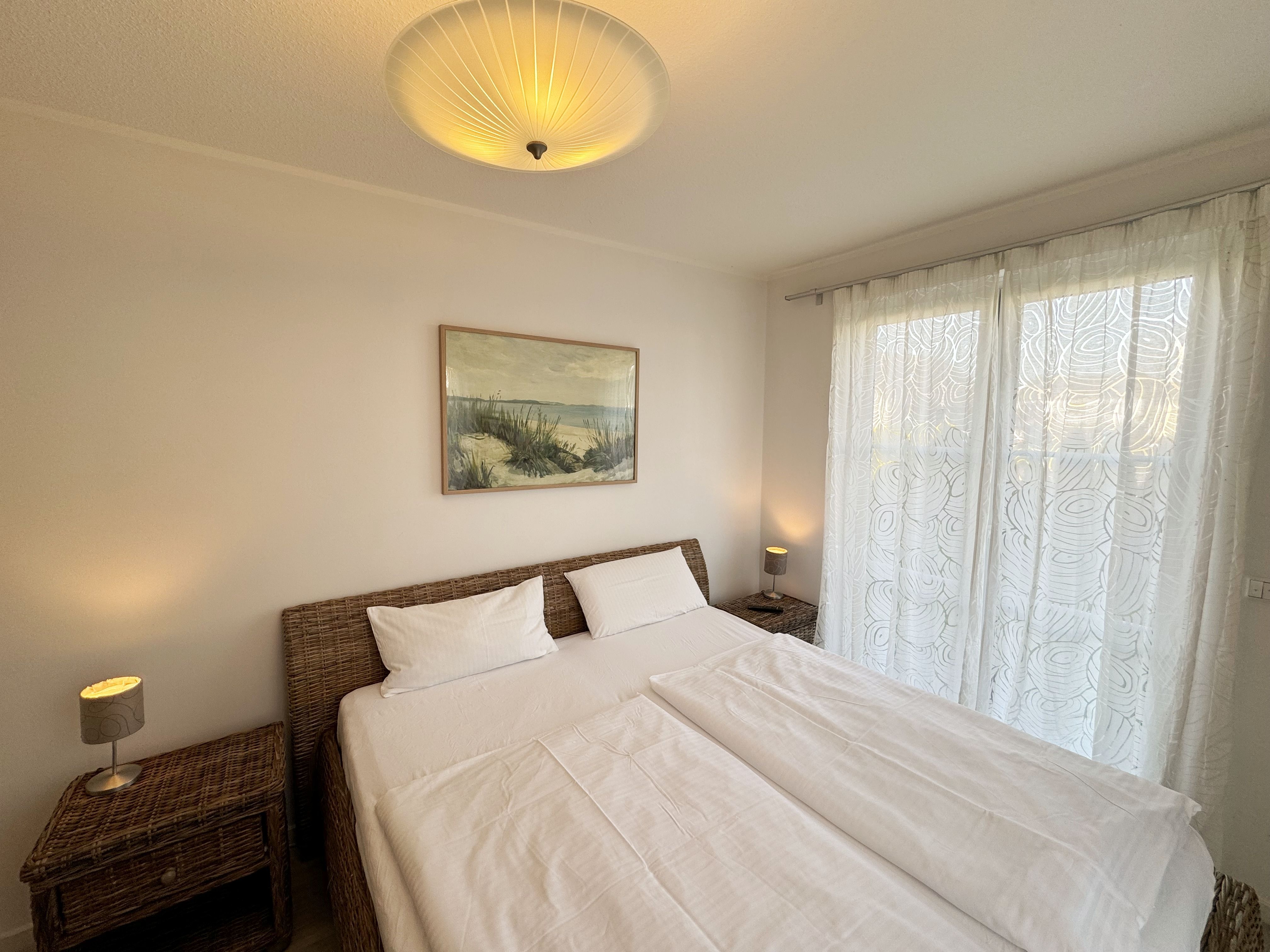 Die ca. 68m² große Erdgeschosswohnung (Nichtraucher) mit dem Namen Sandperle bietet Platz für 2 bis 6 Personen. Der offene Wohnbereich wurde mit Massivholzmöbeln, einer gemütlichen Eckcouch sowie mit einem 50 Zoll LED-Flachbildschirm mit Blu-ray-Player und einer Stereoanlage ausgestattet. Auch im Urlaub brauchen Sie auf einen Internetanschluss (WLAN) nicht verzichten. Dieser ist für Sie inklusive. Auch textiles Kinderspielzeug, eine kleine Sammlung von Büchern sowie Gesellschaftsspiele können genutzt werden. Im angrenzenden Essbereich befinden sich ein großer Esstisch mit 4 Stühlen und eine Sitzbank, wo Sie tolle Urlaubsstunden mit Freunden oder Familie verbringen können. Die integrierte Küchenzeile mit Kühlschrank + Gefrierfach, Ceranfeld, Backofen, Geschirrspüler, Wasserkocher, Toaster, Kaffeemaschine, Handmixer, Kindergeschirr + Besteck und diversen Küchenutensilien laden zum selbst kochen ein. Vom Wohnbereich hat man einen direkten Zugang zur ostseitigen und bestuhlten Terrasse mit Grill. Im ersten Schlafzimmer befindet sich ein Doppelbett (2x 0,90 m x 2,00m) in Komforthöhe (60cm) und zwei 7 -Zonenkaltschaummatratzen, Nachttischablagen sowie ein Kleiderschrank mit Ordnungssystem und großem Wandspiegel. Ein 40 Zoll LED - Flachbild TV runden das Schlafzimmer ab. Im zweiten Schlafzimmer stehen 2 Kojenbetten (0,80m x 2,00m), die mit wenigen Handgriffen auf eine Liegefläche von 1,60 m als Doppelbett vergrößert, werden können zur Verfügung. Der Kleiderschrank hat ebenfalls ein Ordnungssystem. Das Tageslicht - Bad besitzt eine bodengleiche Dusche, eine separate Lüftung, Fön, WC und Waschtisch mit Spiegelbeleuchtung. Alle Räumlichkeiten sind mit einer Fußbodenheizung, elektrische Rollläden und mit einer kontrollierten Be- & Entlüftungsanlage versehen. Im Wirtschaftsraum steht Ihnen eine Waschmaschine zur inklusiven Nutzung zur Verfügung sowie diverse Reinigungsutensilien. Für unsere kleinen Gäste sind 1x Kinderreisebett (ohne Matratze und Bettinlett), 1x Hochstuhl, eine Wickelauflage und ein Töpfchen inklusive. Ein PKW-Stellplatz Nr. 01 und ein eigener abschließbarer Fahrradschuppen sind direkt am Haus. Haustiere sind nicht erlaubt. Die Erstausstattung eines Wäschepaketes (komplette Bettwäsche, 1 Duschhandtuch, 2 kleine Handtücher) können Sie bis 14 Tage vor Anreise gegen einen Aufpreis dazu buchen oder durch eigene ergänzen. Ab 2 gebuchten Paketen erhalten Sie einmalig 1 Geschirrhandtuch und 1 Duschvorleger hinzu.