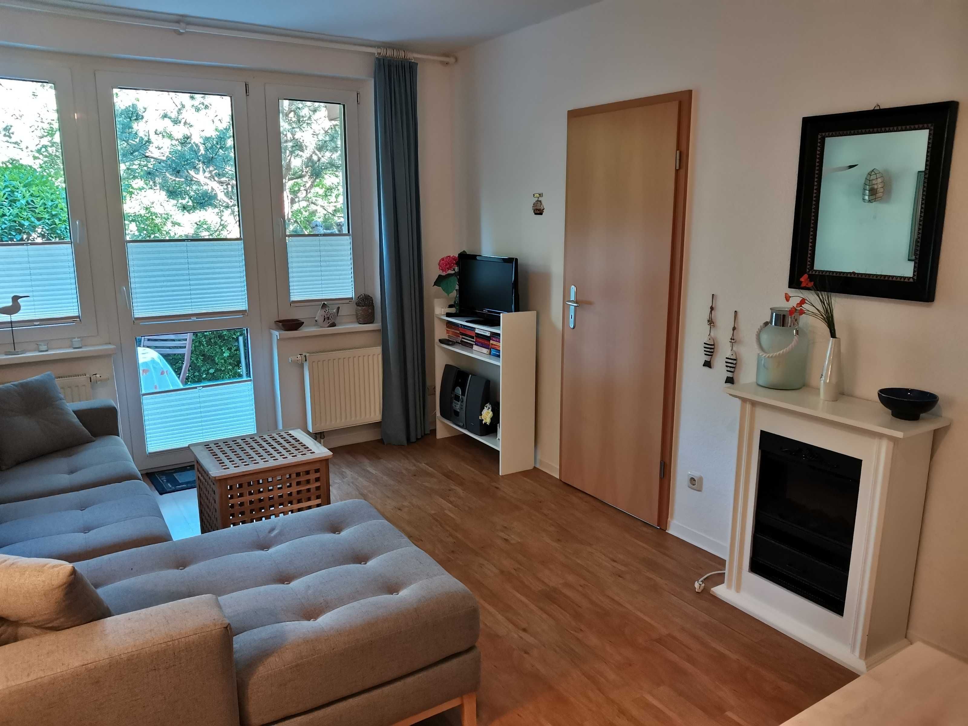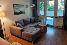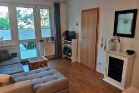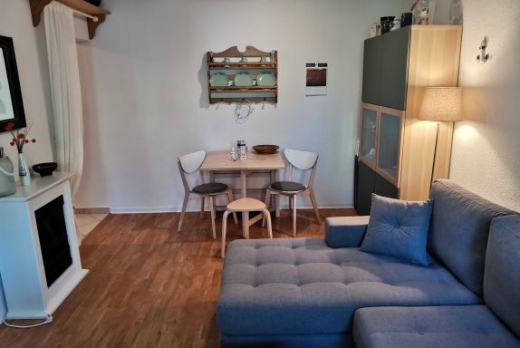 Die Ferienwohnung verfügt über ein Wohnzimmer mit Essecke und Schlafsofa, welches als Aufbettung für weitere Gäste genutzt werden kann. An das Wohnzimmer schließt sich ein kleines Schlafzimmer mit Polsterbett und Kleiderschrank an. Vom Wohnzimmer aus betritt man die Terrasse.