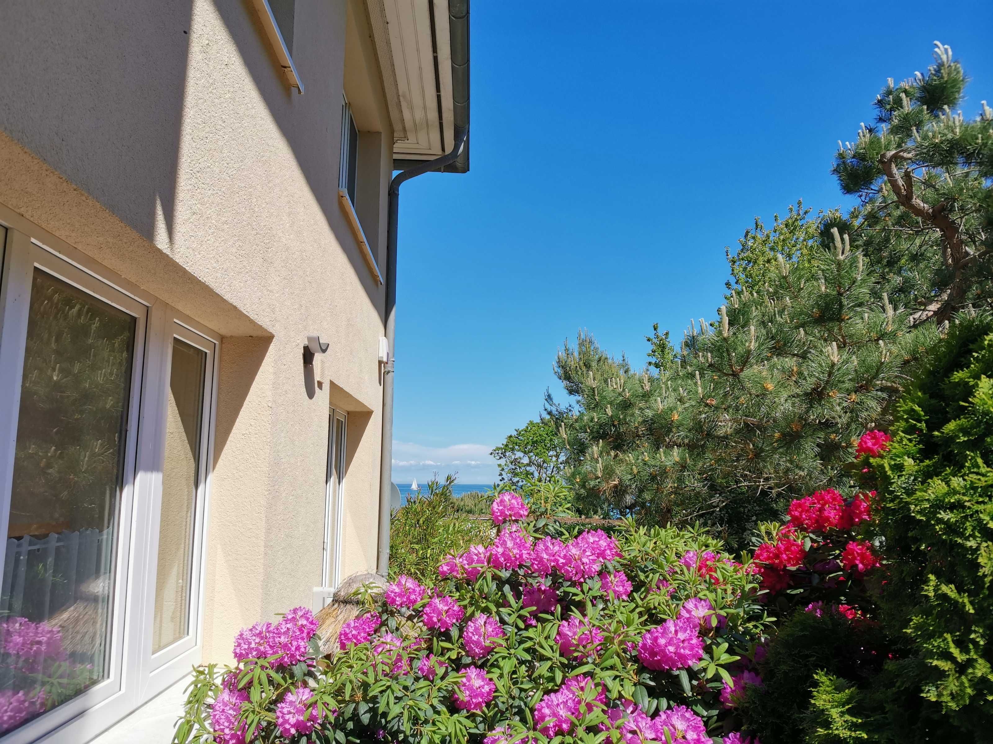 Die Terrasse können Sie vom Wohnzimmer aus betreten. Hier können Sie im Strandkorb in der Morgensonne frühstücken.