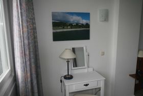 Ausserdem gibt es ein geräumiges Schlafzimmer mit einem Doppelbett (1,80x2,00m) , zwei Nachtschränkchen, einen grossen Kleiderschrank und ein Frisiertischen. Ein Bad mit Dusche ist vorhanden. Fön, Handseife und Toilettenpapier stellen wir für Sie bereit. Bettwäsche und Handtücher sind im Preis schon enthalten.