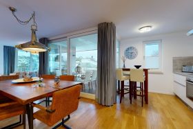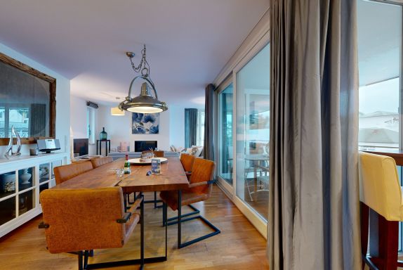 * Großes, helles Wohnzimmer mit einer großen Fensterfront: Couchgarnitur (Schlafcouch für 1-2 Personen), Kabel-TV, Internetzugang (WLAN inkl.), HiFi-Anlage, Esstisch für 4-6 Personen