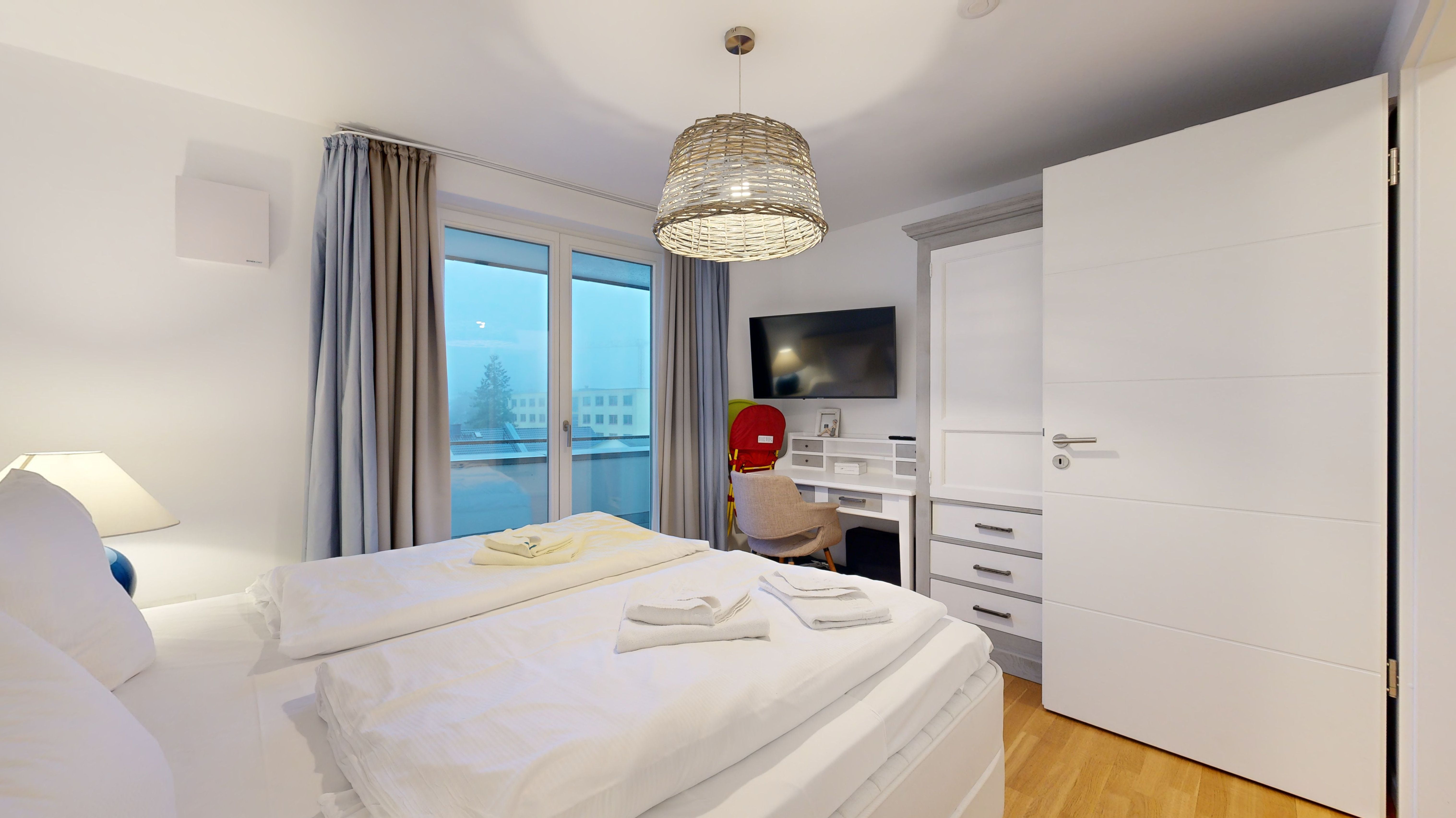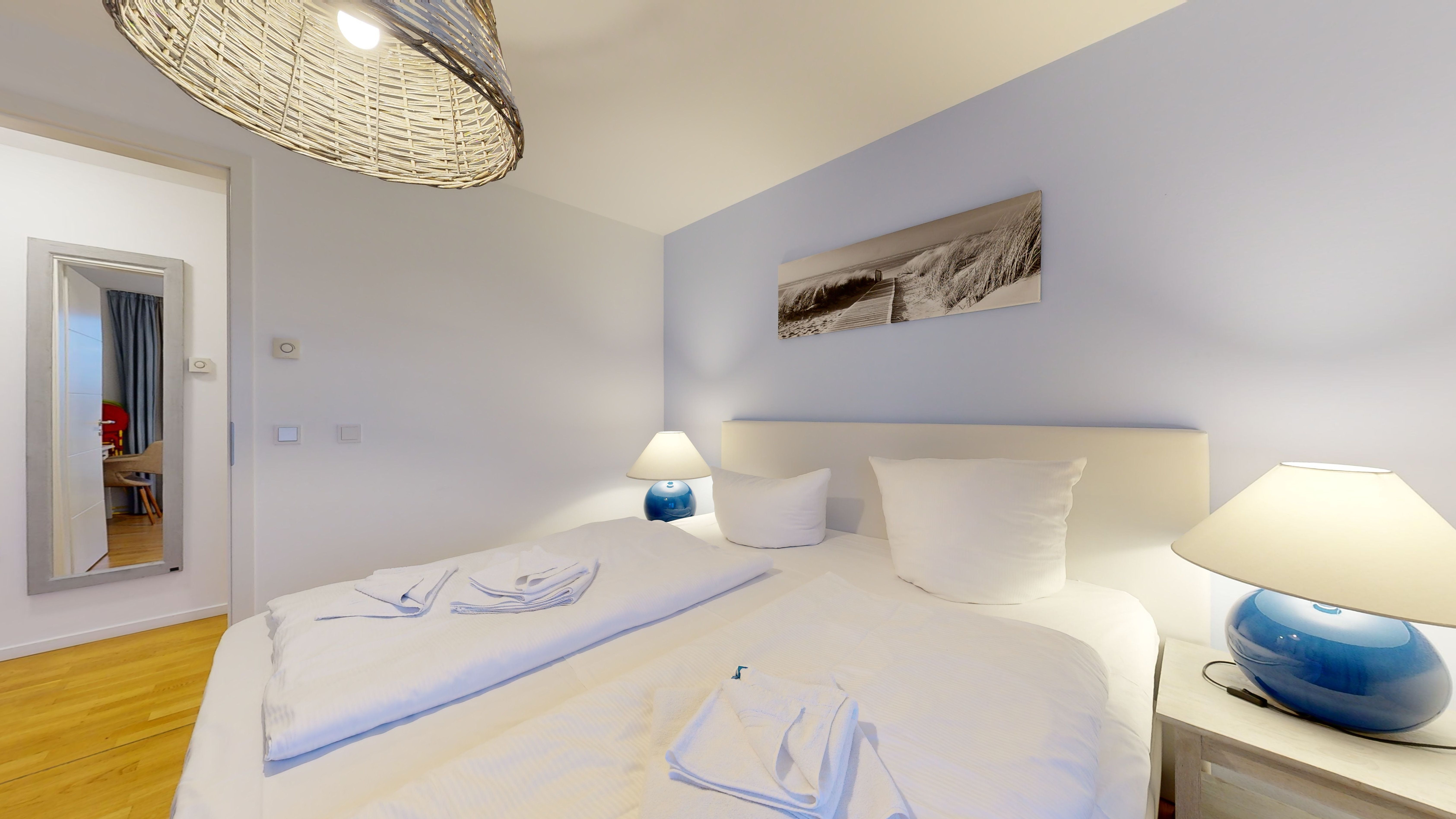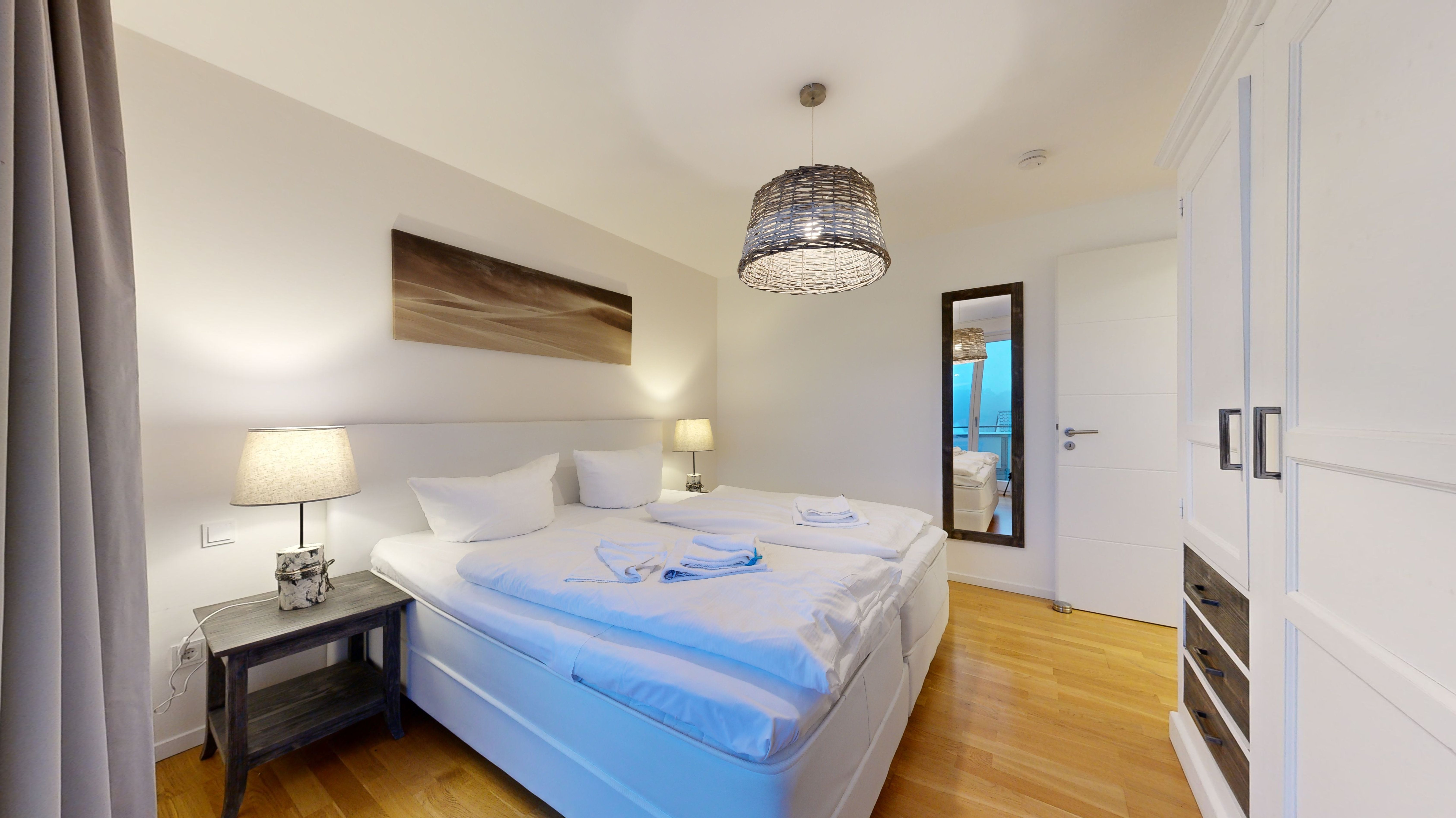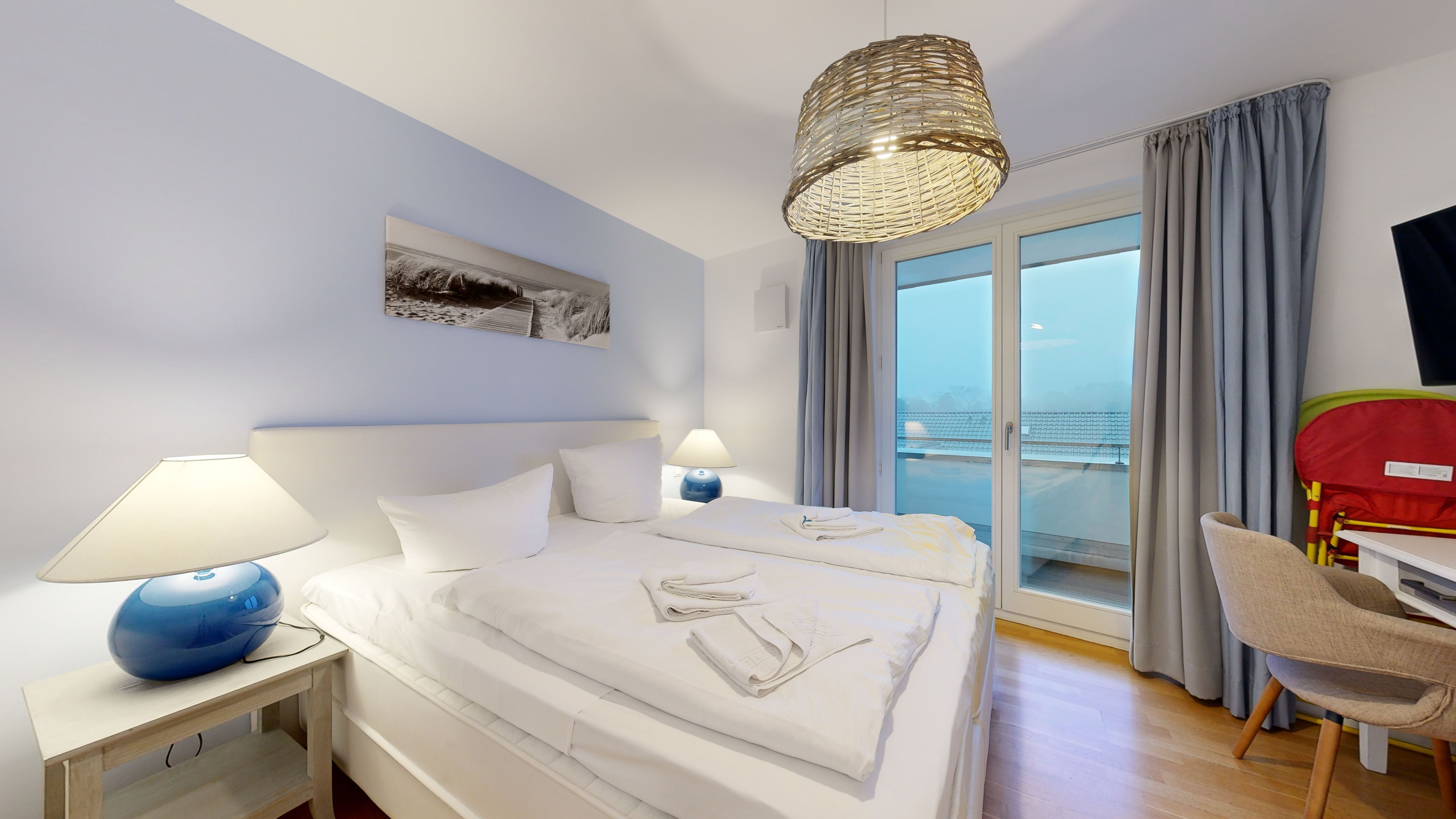 Ostseeblick - Penthouse mit großer Dachterrasse für bis zu 4 Personen (Aufbettung auf Anfrage); Ausstattung der 4-5-Sterne Wohnung im 4. OG mit 2 Schlafzimmern (3 Zimmer / 130 m²):