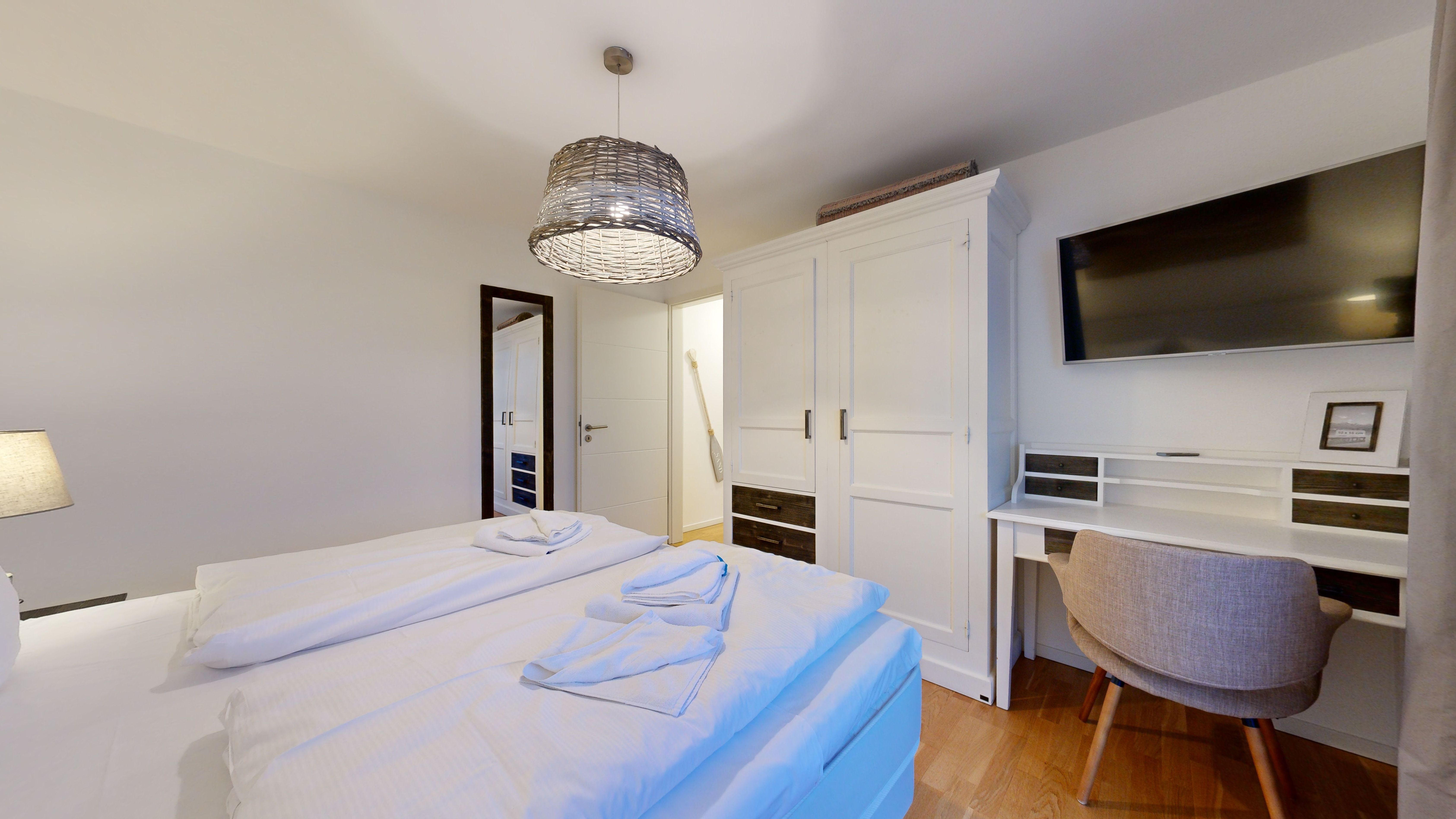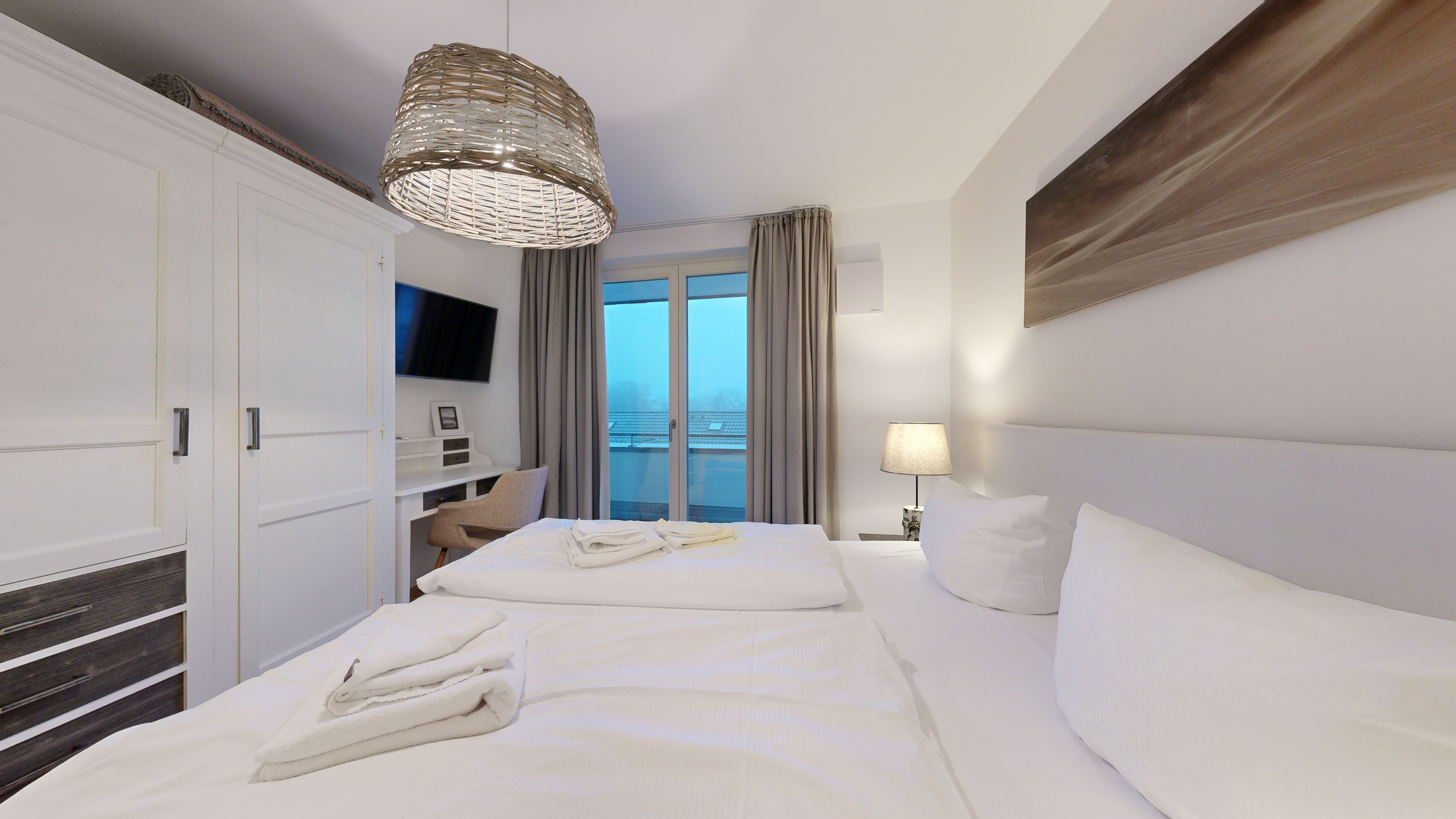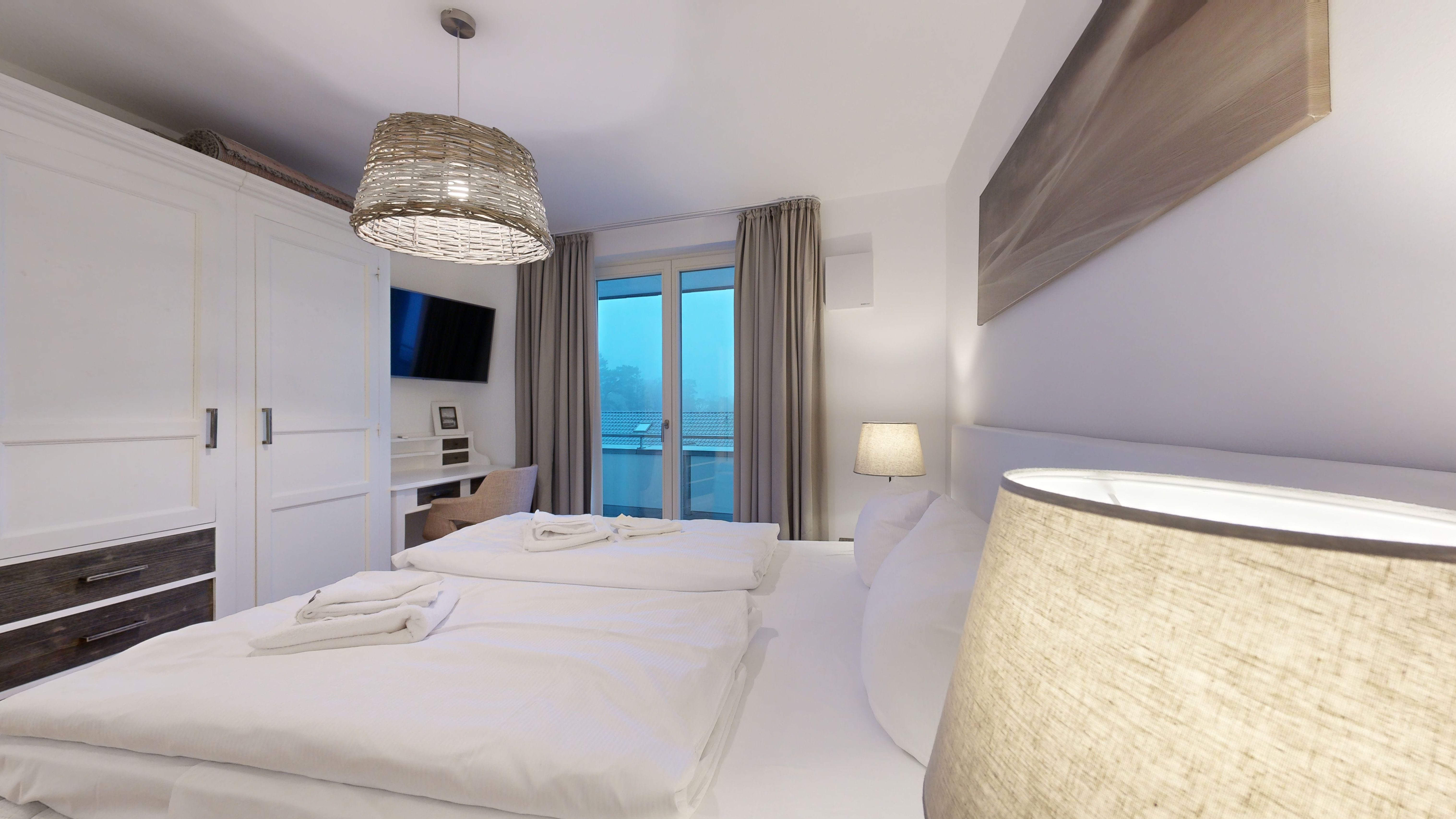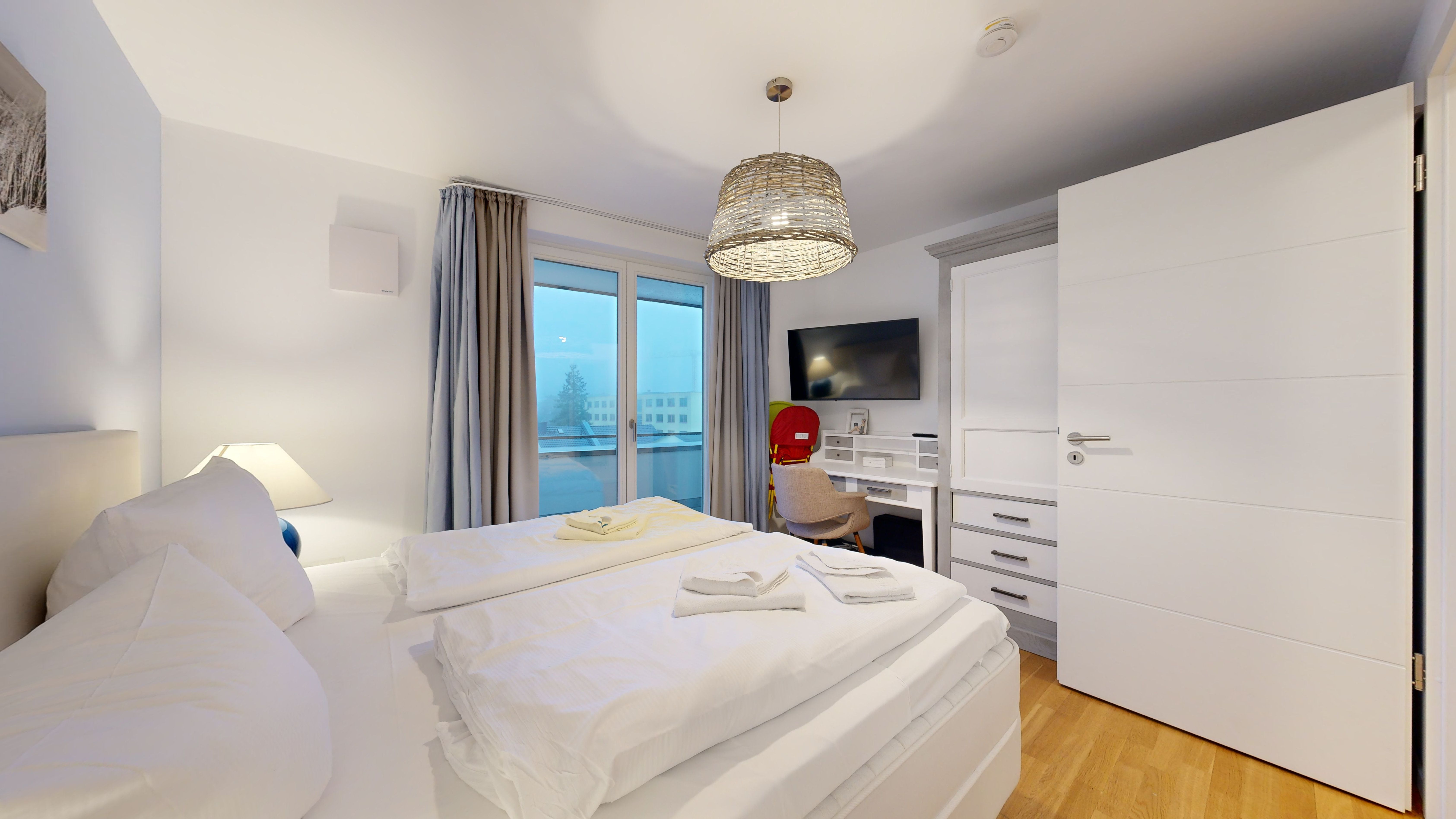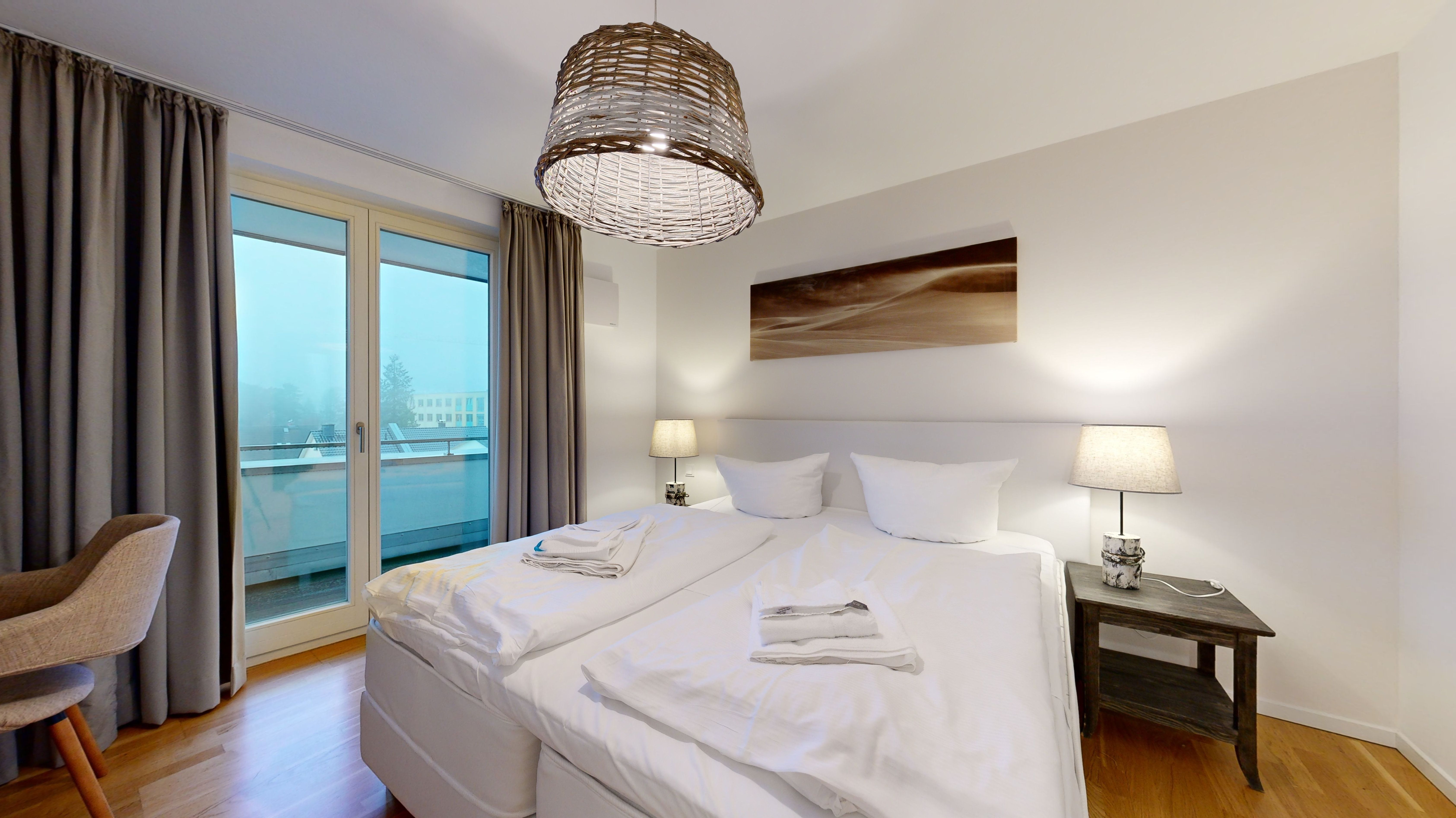 Ostseeblick - Penthouse mit großer Dachterrasse für bis zu 4 Personen (Aufbettung auf Anfrage); Ausstattung der 4-5-Sterne Wohnung im 4. OG mit 2 Schlafzimmern (3 Zimmer / 130 m²):