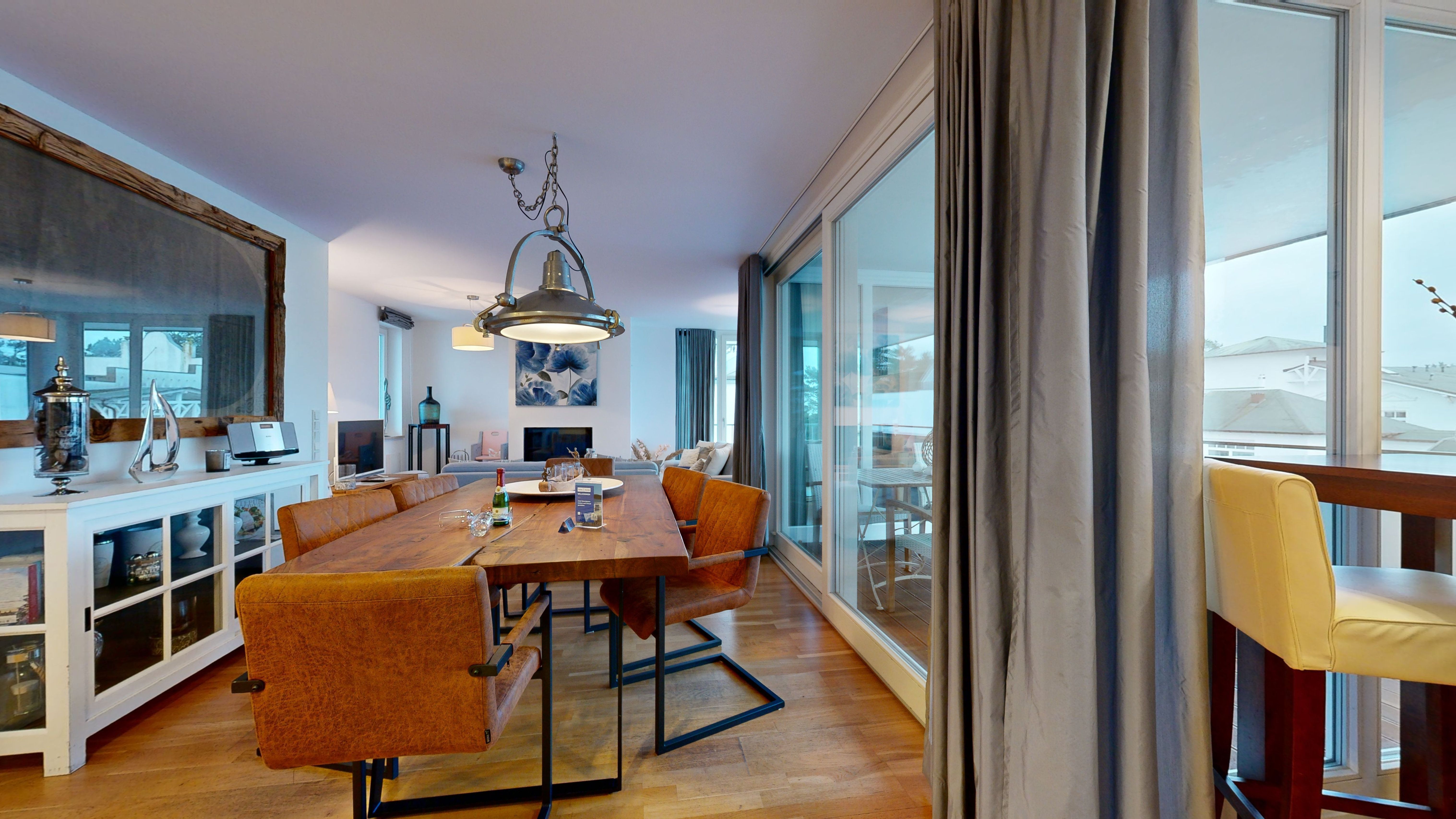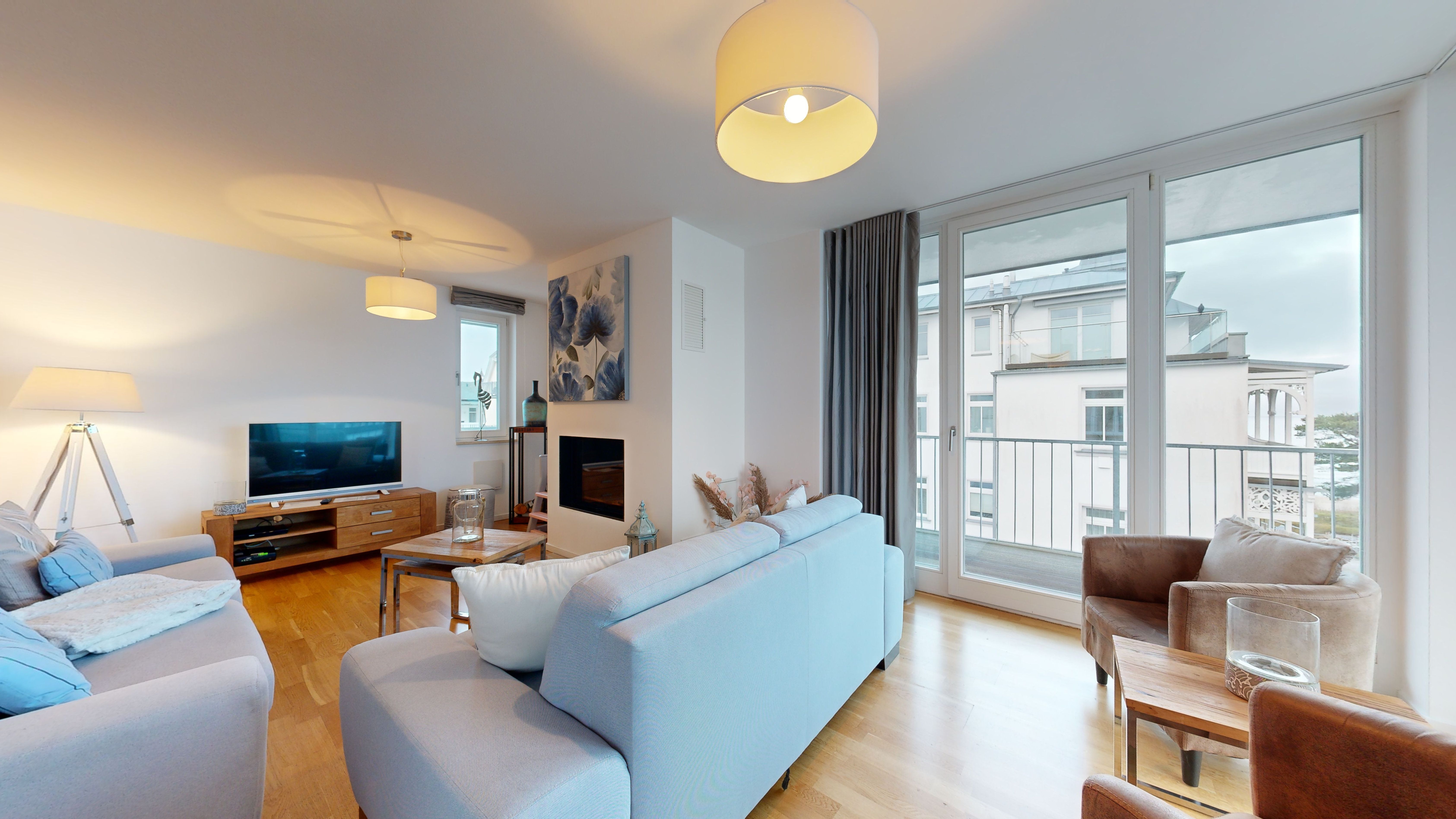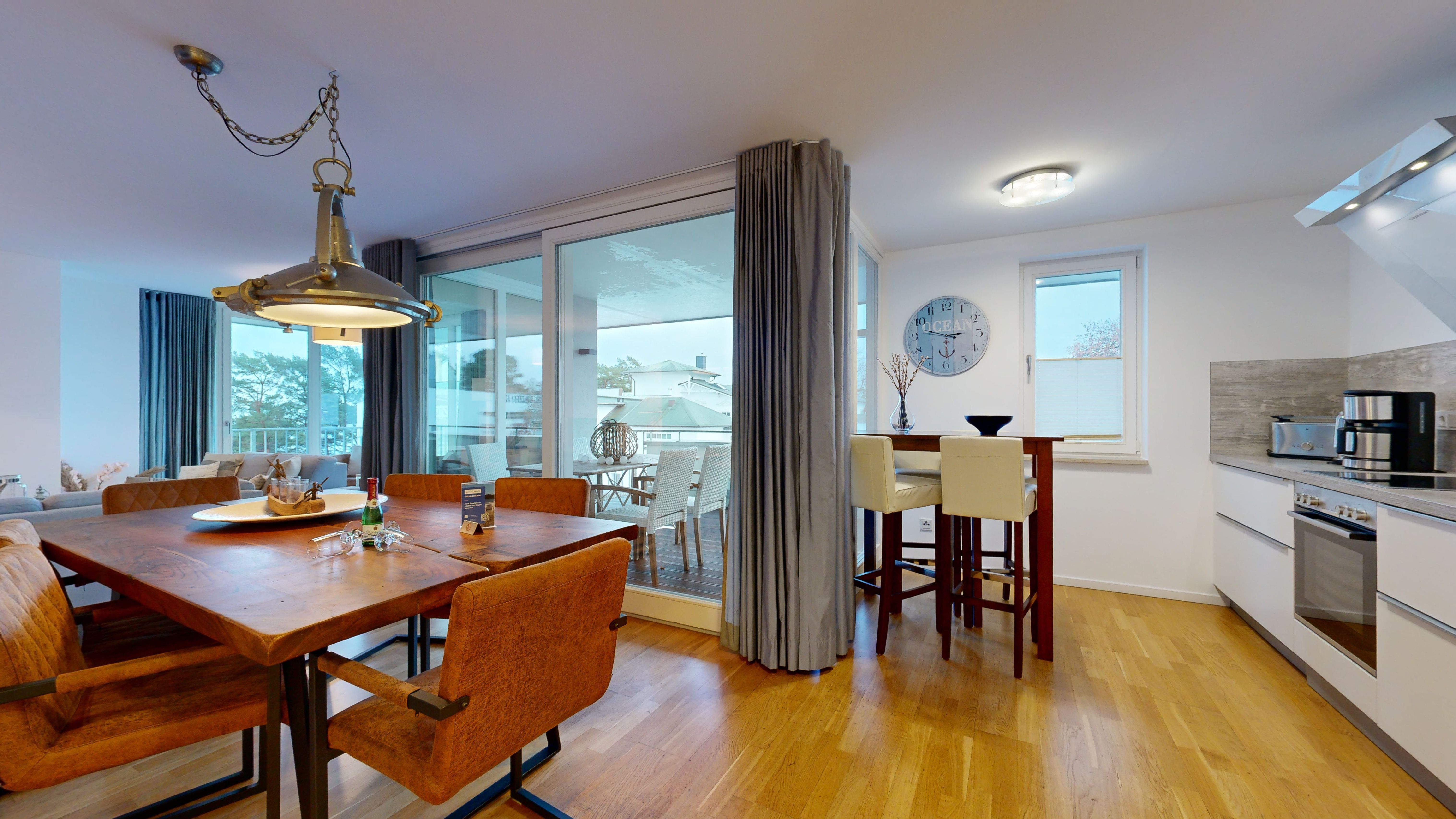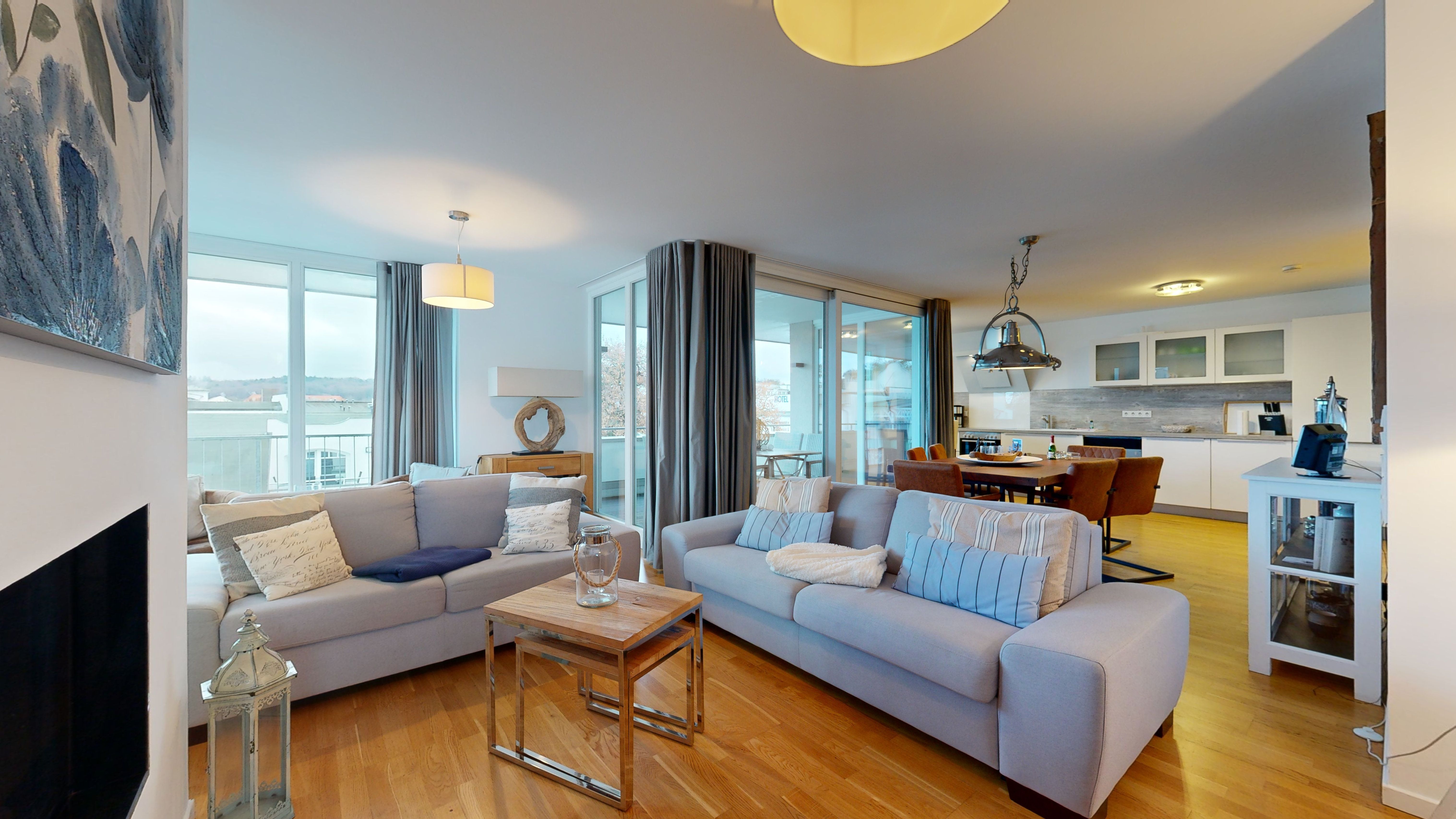 Ostseeblick - Penthouse, eine Luxus-Wohnung mit sehr hochwertiger Ausstattung im Strandhaus Seeblick mit großer Dachterrasse für bis zu 4 Personen im 3. OG mit 2 Schlafzimmern, 2 Badezimmern und Sauna auf 130 m² in allerbester Lage von Binz