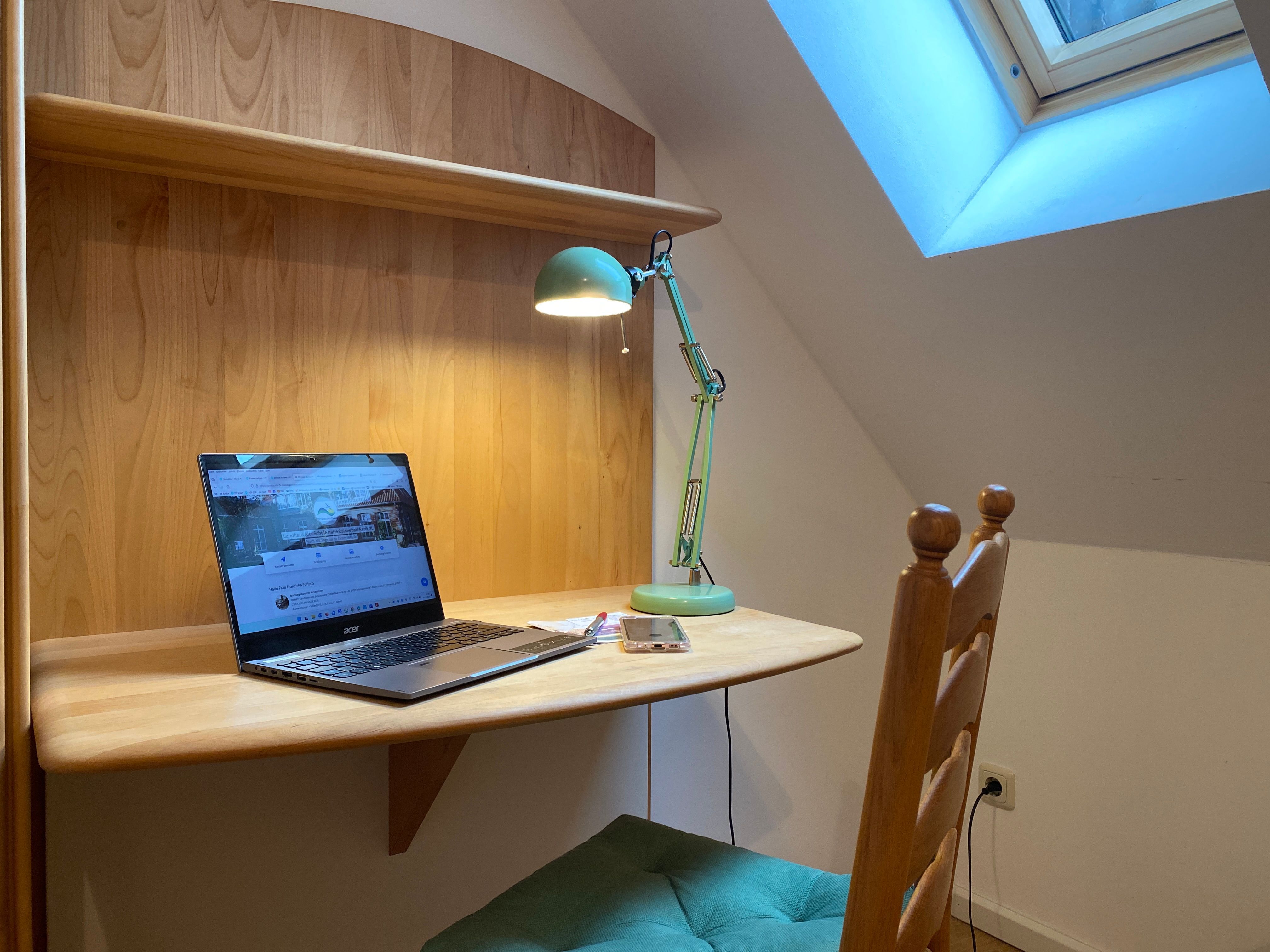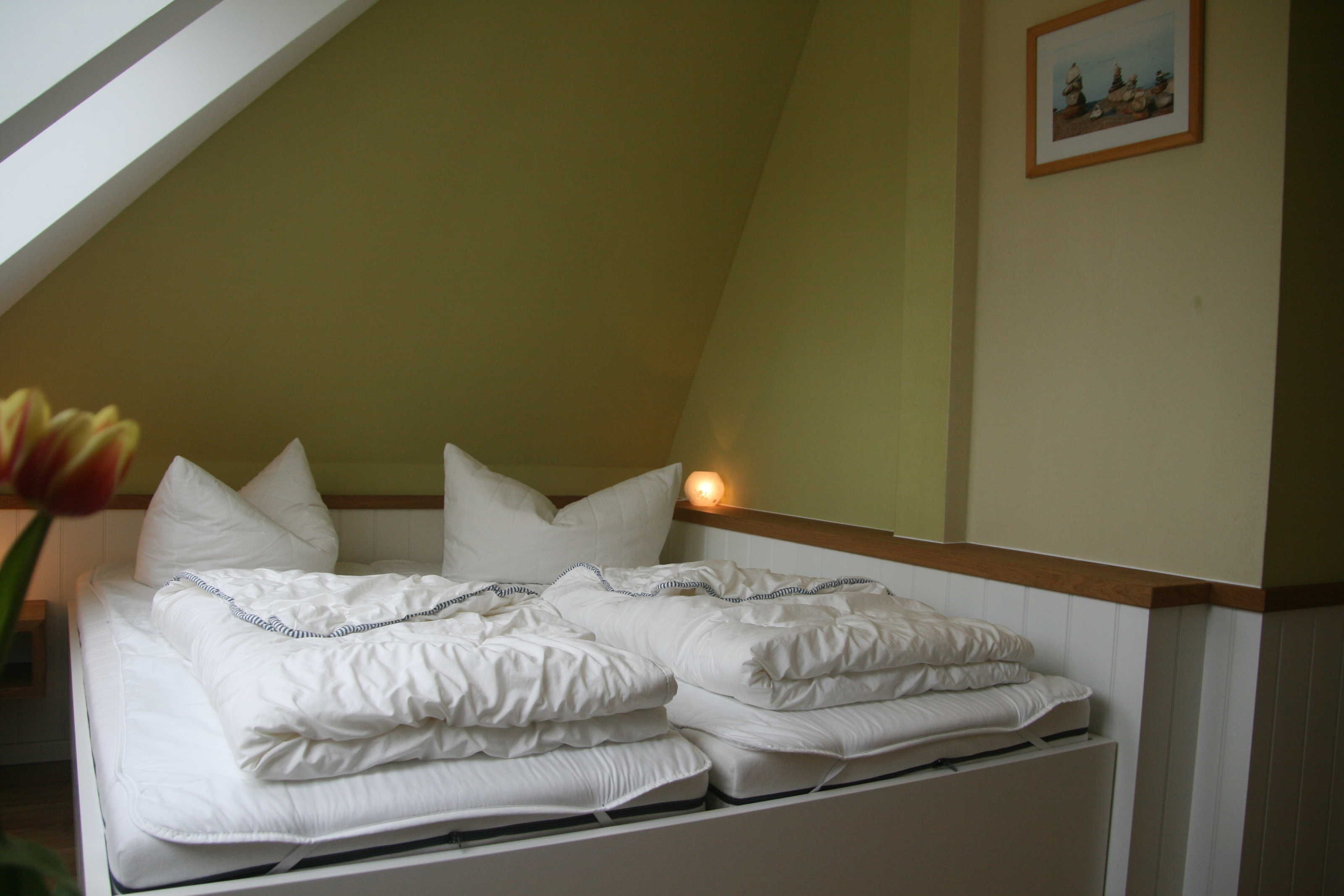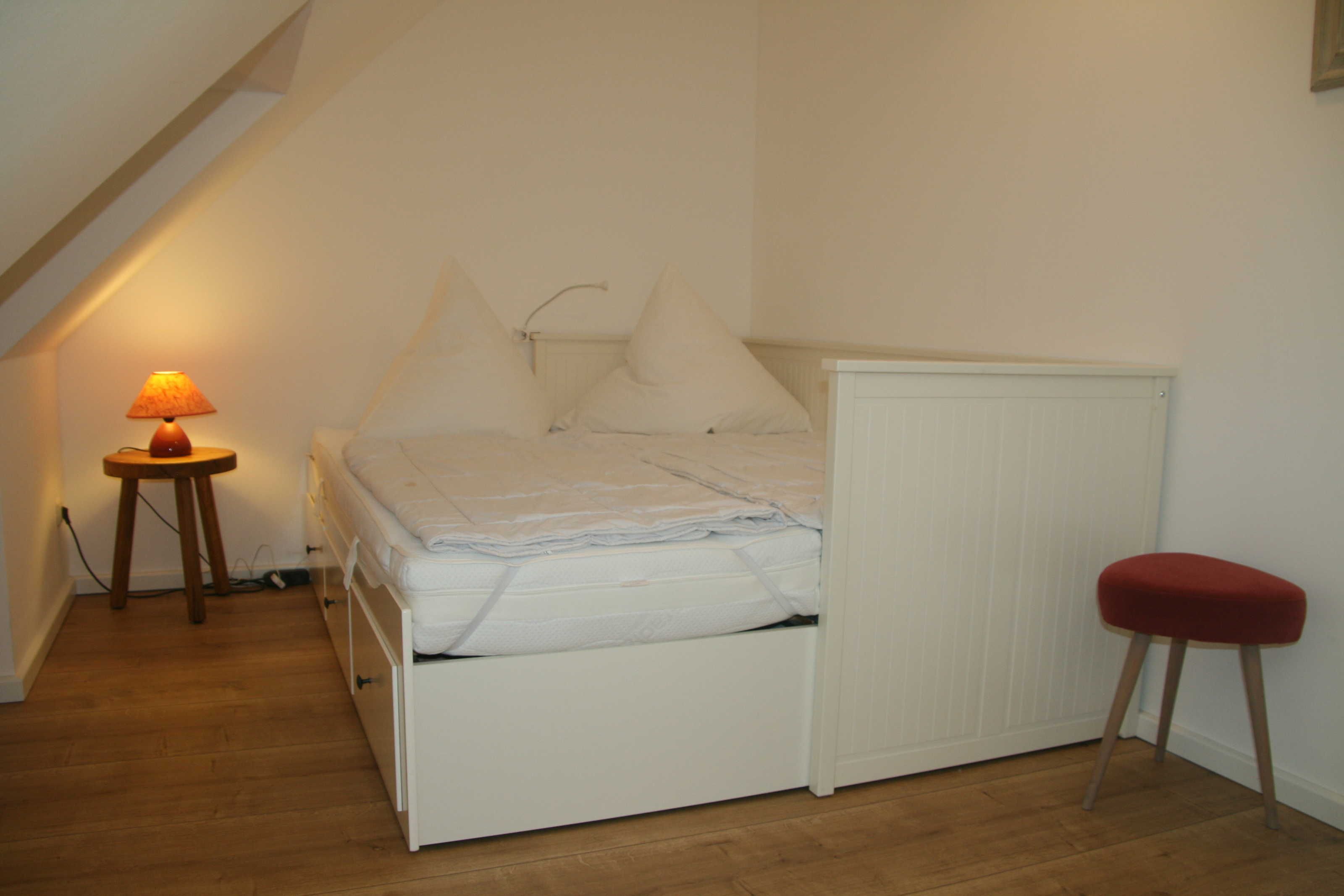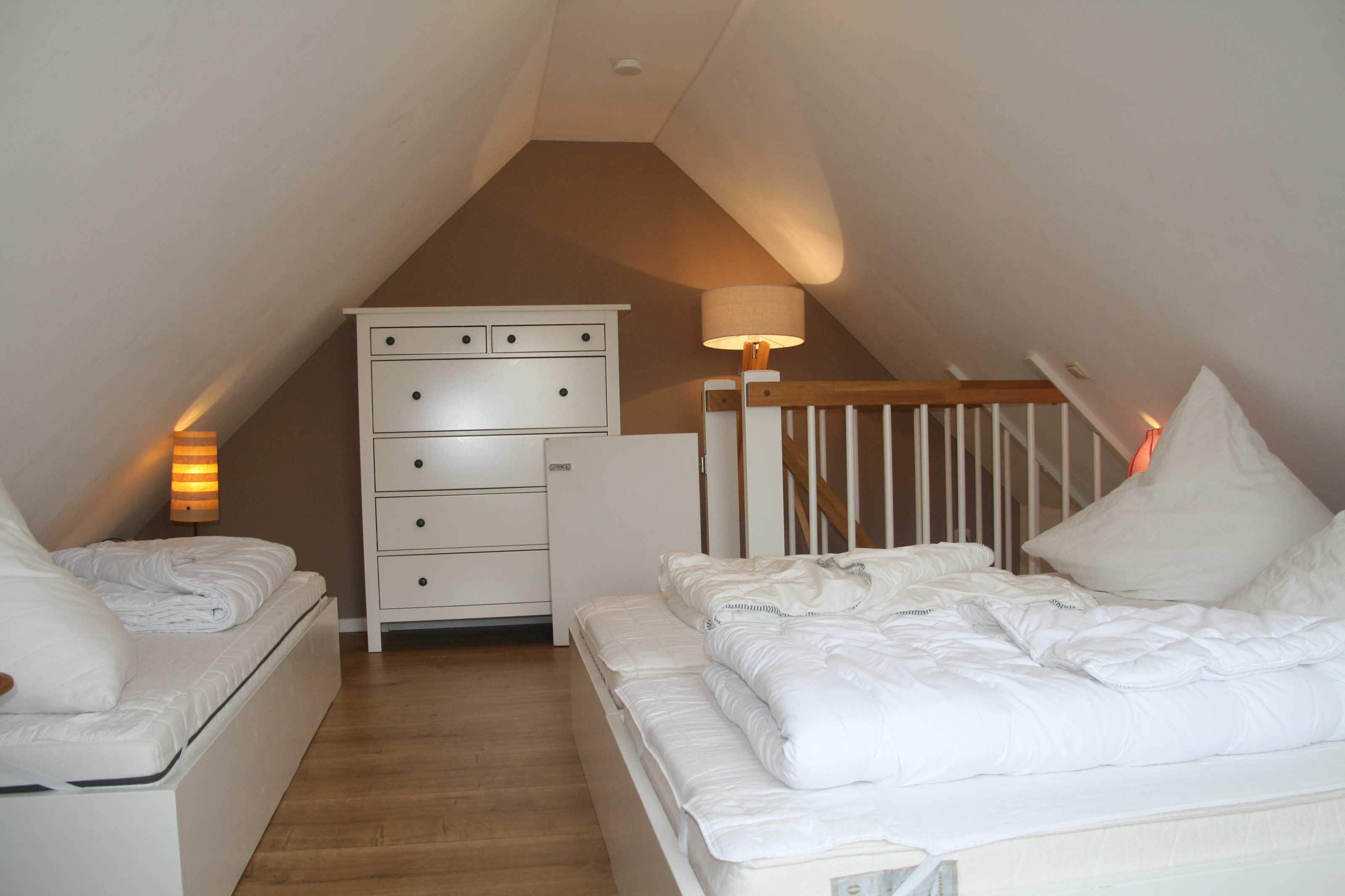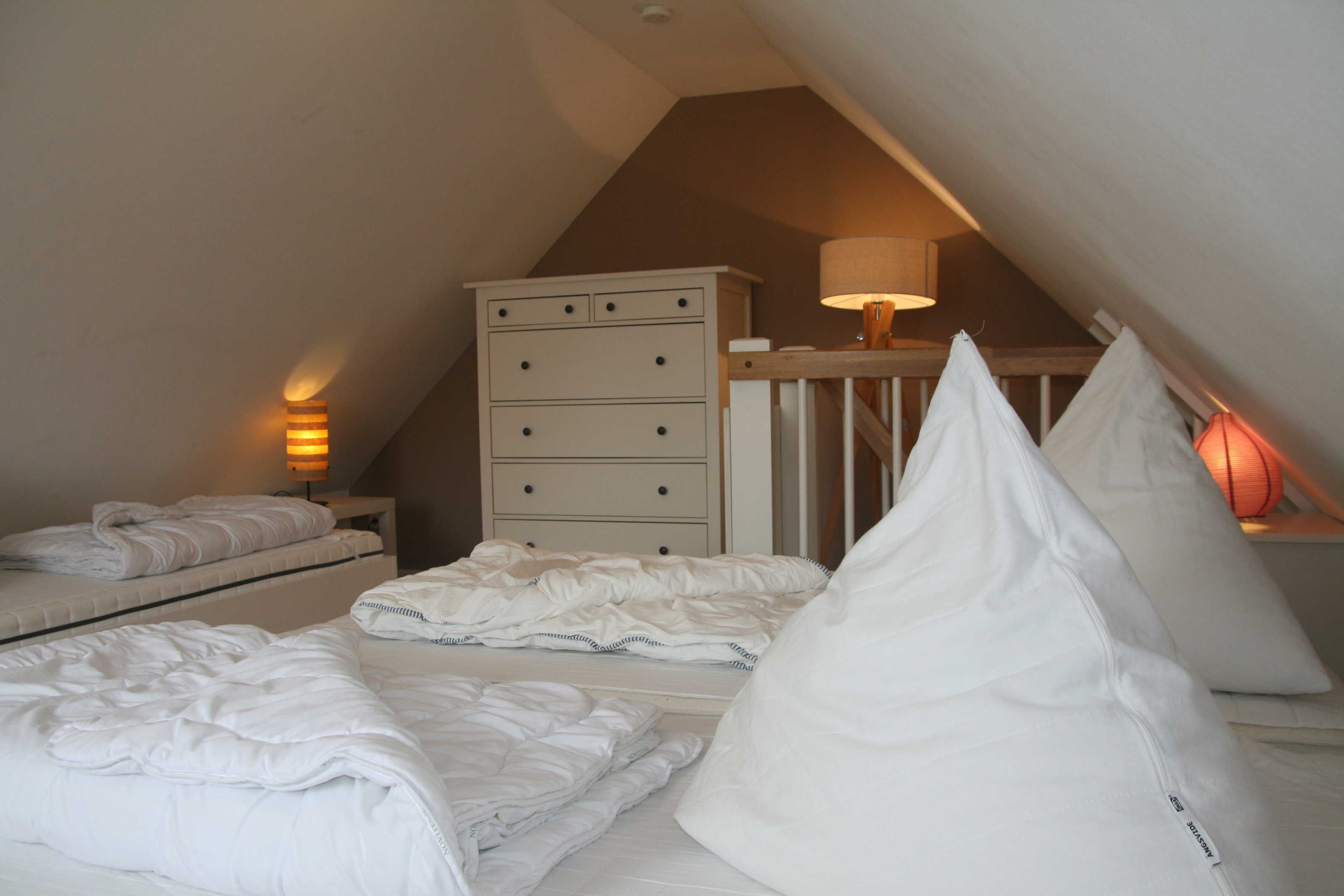 • 1 Schlafgalerie mit 3 Einzelbetten (beliebig auch als Doppelbett stellbar) im Dachgeschoss