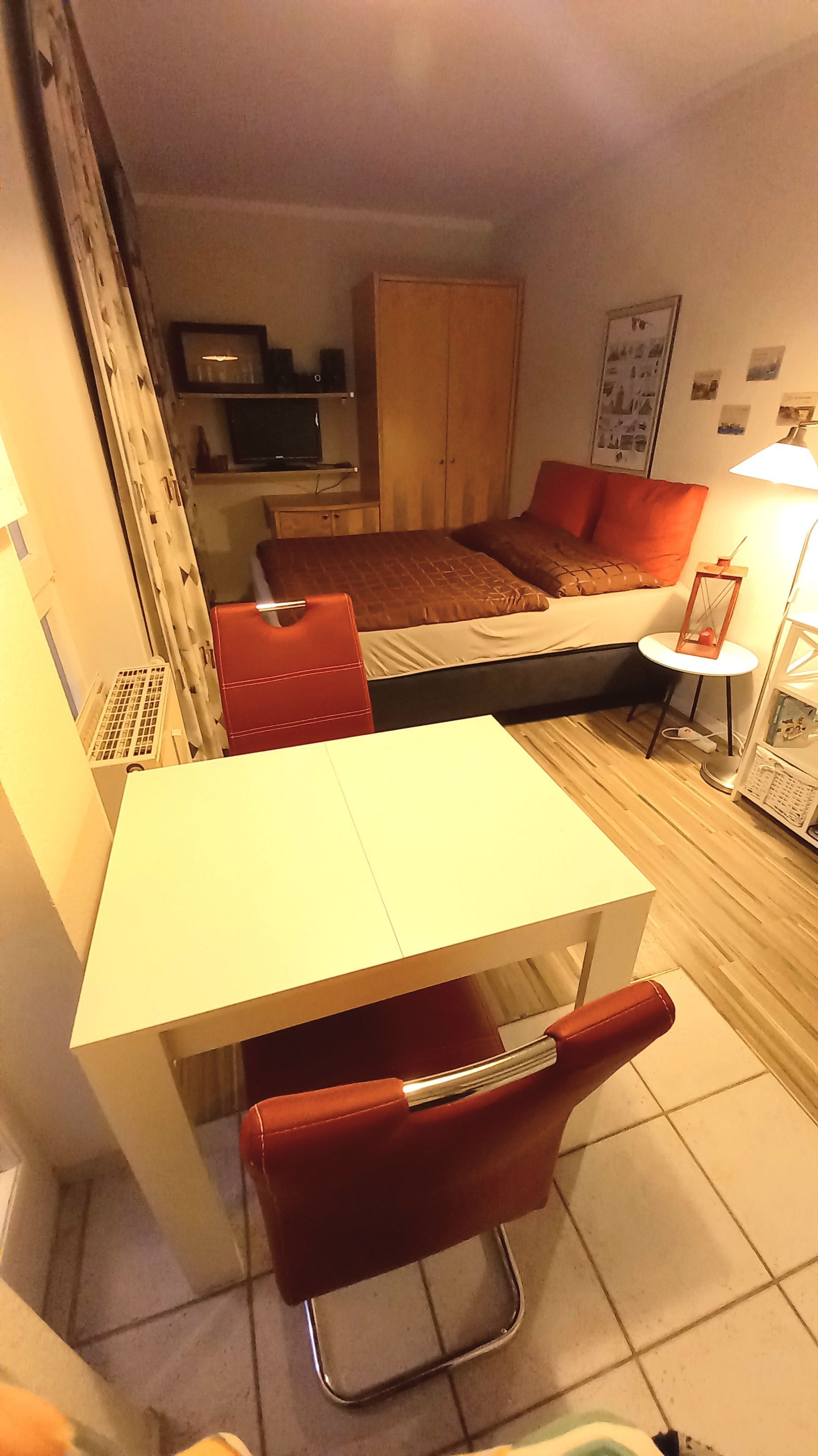 kleine preiswerte Ferienwohnung in einer Ferienanlage, 1 kombinierter Wohn-Schlafraum mit Küchenzeile, 1 Bad mit Dusche und WC, 1 Balkon in Südwestrichtung,