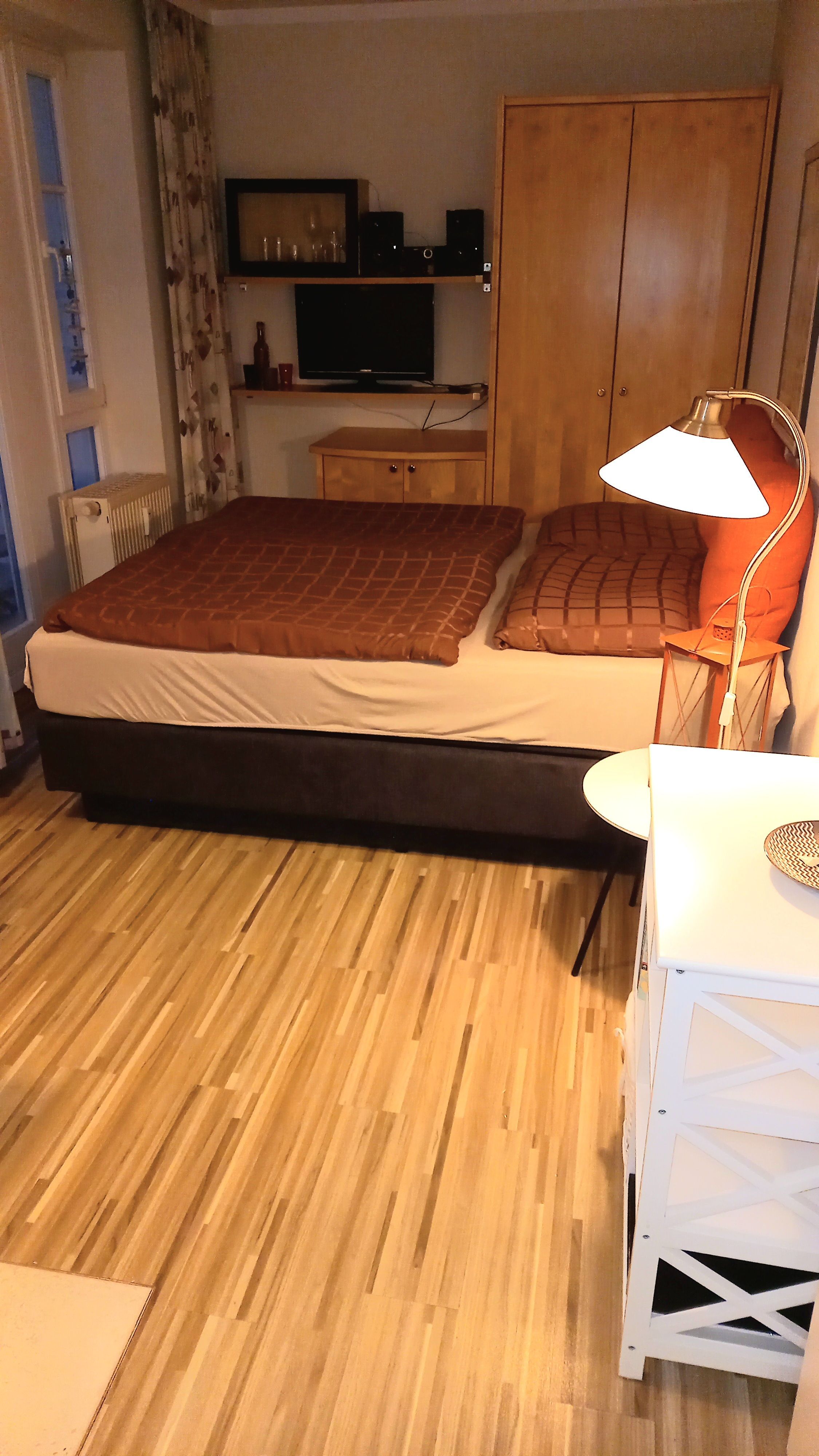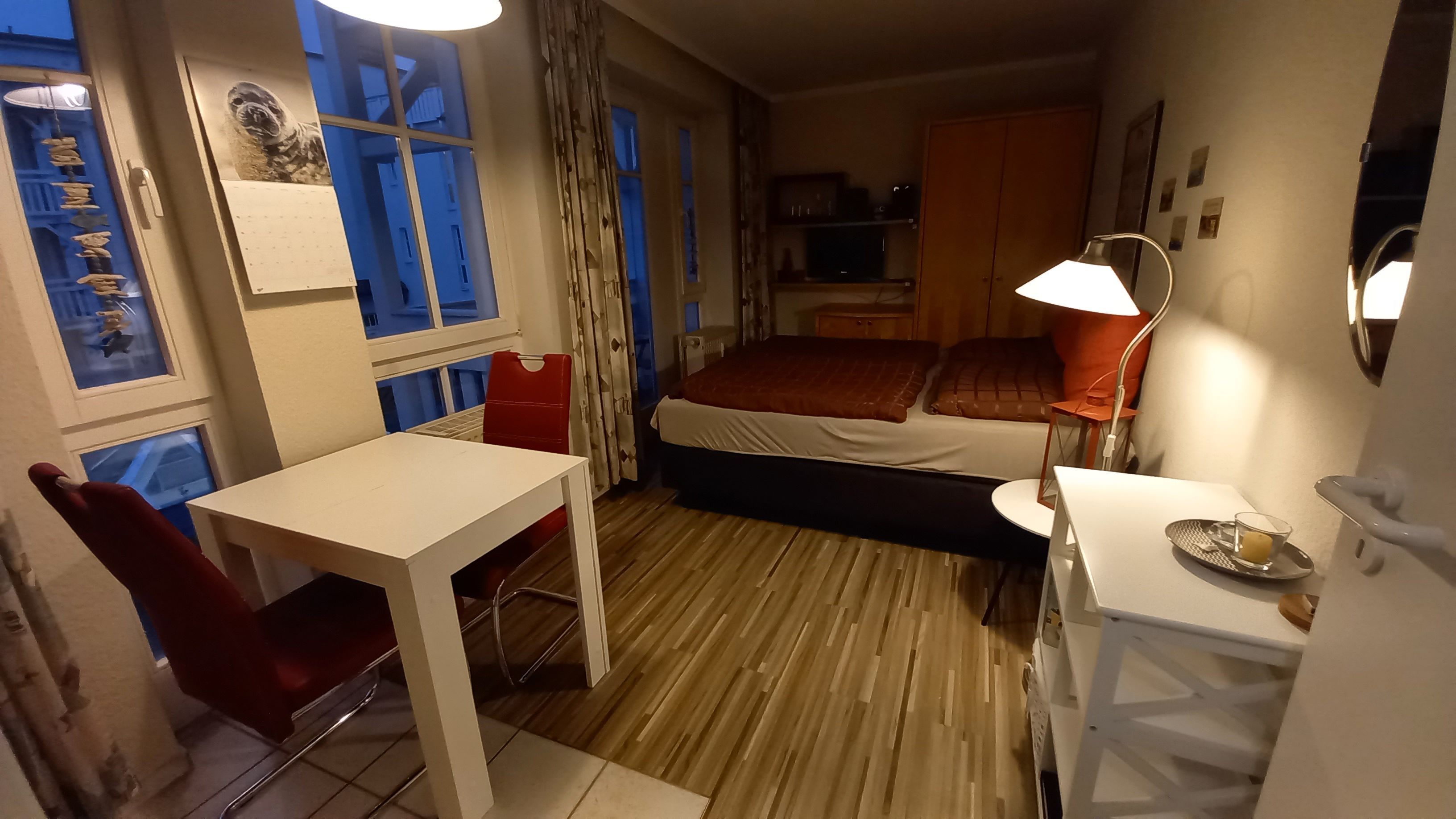 1 kombinierter Wohn-Schlafraum mit Küchenzeile, 1 Bad mit Dusche und WC, 1 Balkon in Südwestrichtung, Küchenzeile mit üblichem Geschirr und Besteck, Töpfe, Kaffeemaschine, Toaster, 2 Ceran-Herdplatten, Mikrowelle, Kühlschrank mit Gefrierfach, Flachbildfernseher, Stereoanlage (CD, Radio),