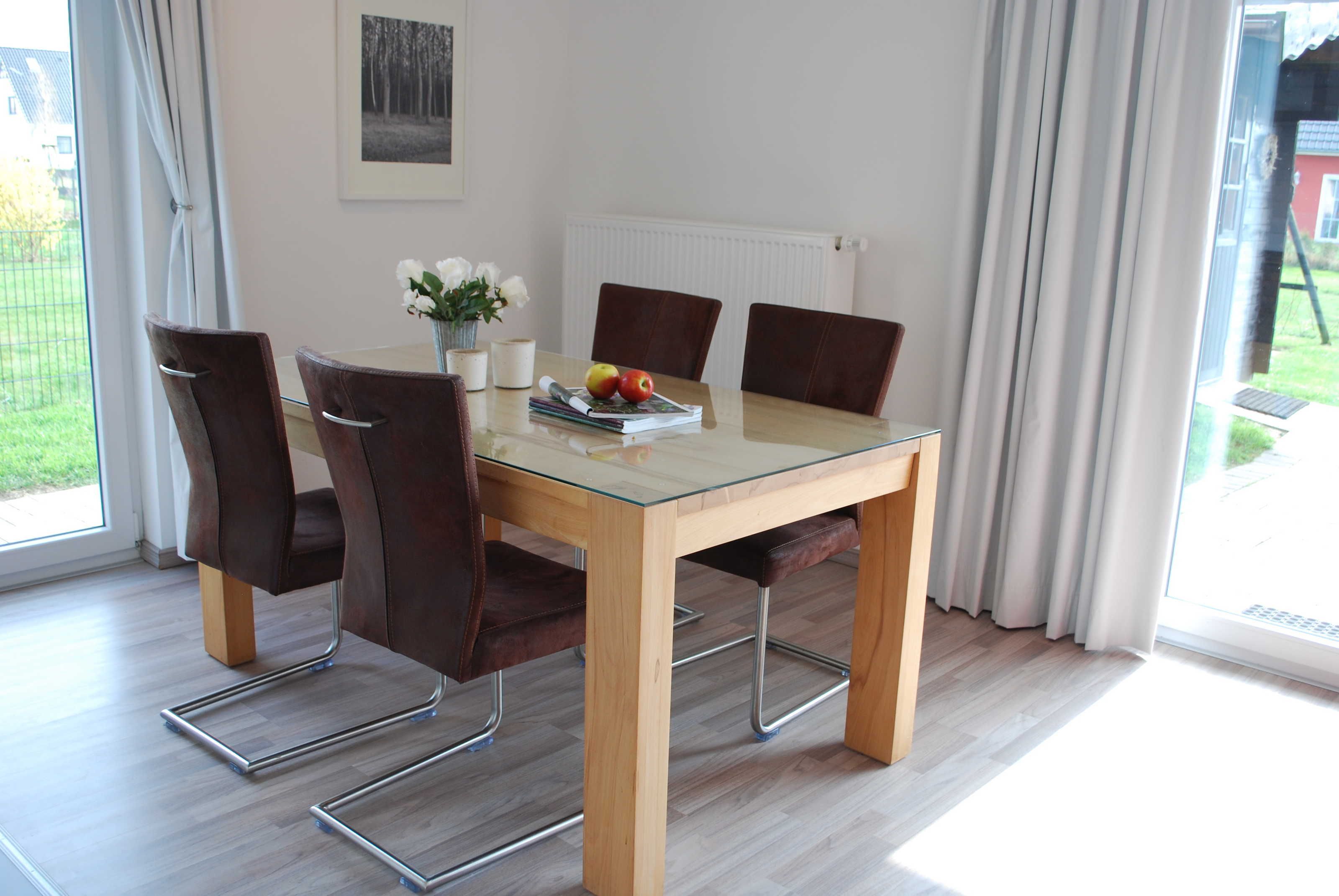 Die Steilküste ist nur einen Katzensprung entfernt. Steigen Sie in die Ostseefluten oder unternehmen Sie einen Spaziergang entlang der Küste bis in den Gespensterwald. Es erwartet Sie eine Wohnung mit viel Komfort für bis zu vier Personen. Hierzu gehören eine moderne hochwertige Einbauküche (inkl. Granitarbeitsplatte) mit Backofen, Kühlschrank inkl. Gefrierfach, Geschirrspülmaschine, Kaffeemaschine, Wasserkocher und Toaster. Die im Bad befindliche Waschmaschine können Sie kostenlos nutzen. Flachbildschirm TV, Stereoanlage, Blu-Ray und DVD Player sind vorhanden. Ein frei verfügbarer superschneller DSL Anschluß (100.000 kbit/s) mit W-LAN sorgt für den Kontakt in die weite Welt. Gebührenfreie Anrufe ins deutsche Festnetz können über das bereitgestellte Telefon getätigt werden. Für einen erholsamen Schlaf sorgen ein 2,2 m langes Doppelbett im Schlafzimmer sowie eine 2,20 x 1,40 m Schlafcouch im Wohnzimmer. Für Riesen wurden extra hohe Türen eingebaut. Und für die Kleineren sind ein Reisebabybettchen und ein Hochstuhl vorhanden. Wir bitten Handtücher und Bettwäsche mitzubringen. Hiermit weisen wir daraufhin das keine Vermietungen an gewerbliche Gäste möglich ist.