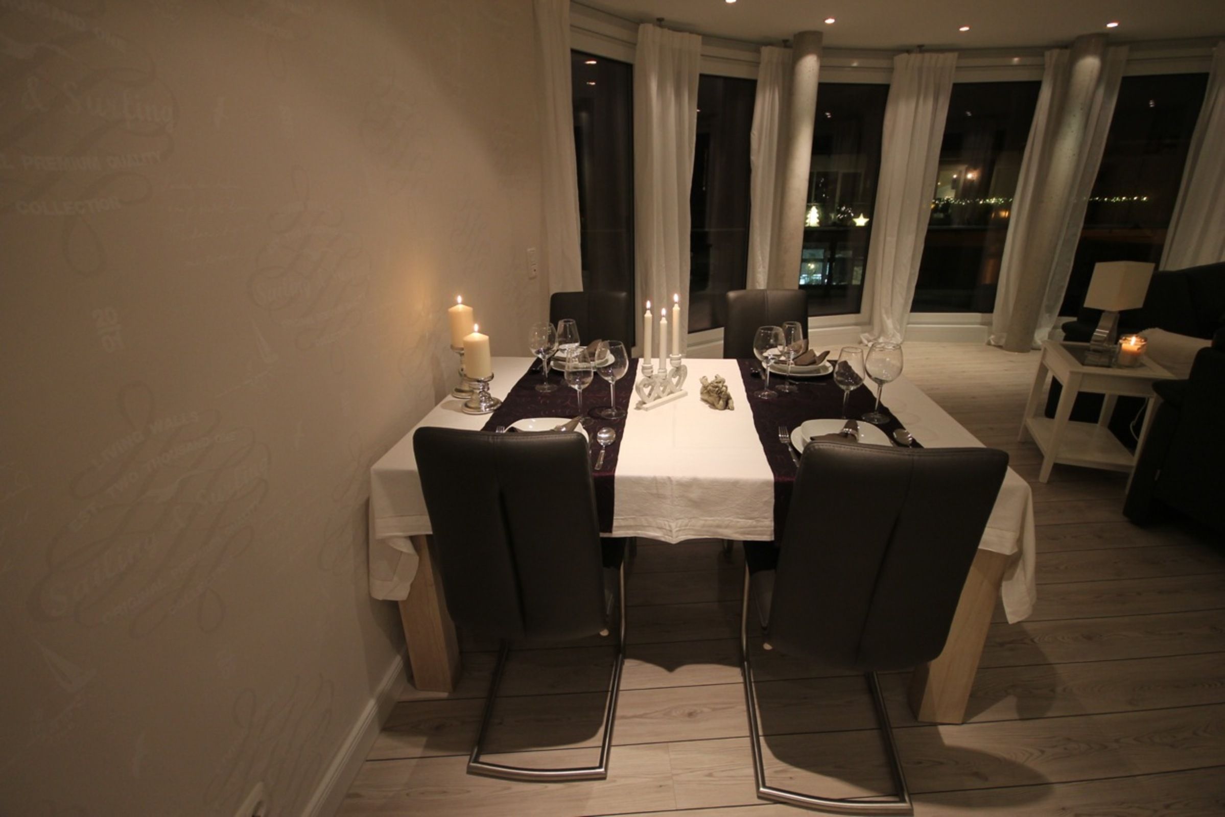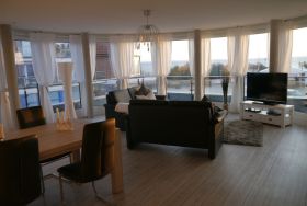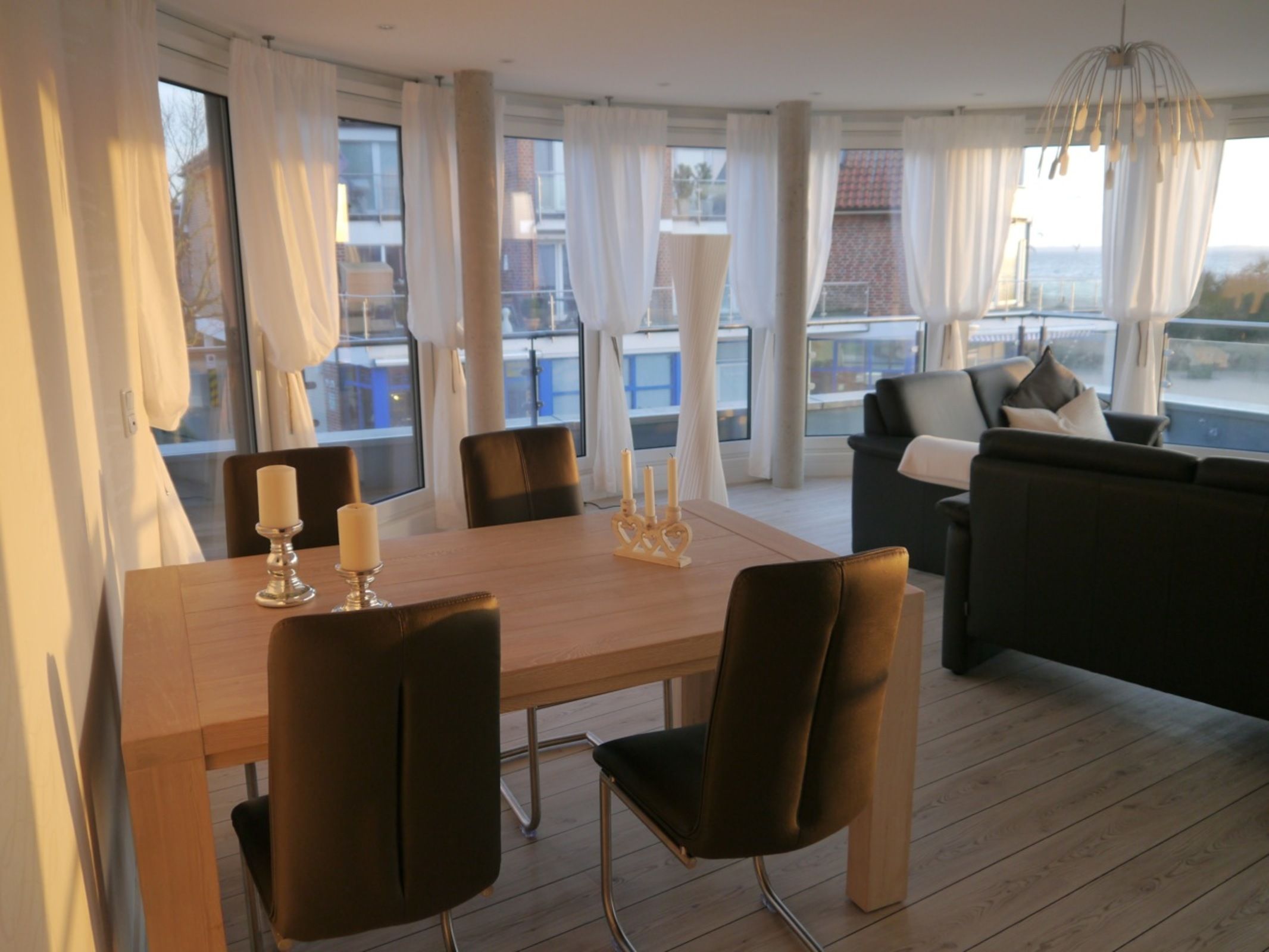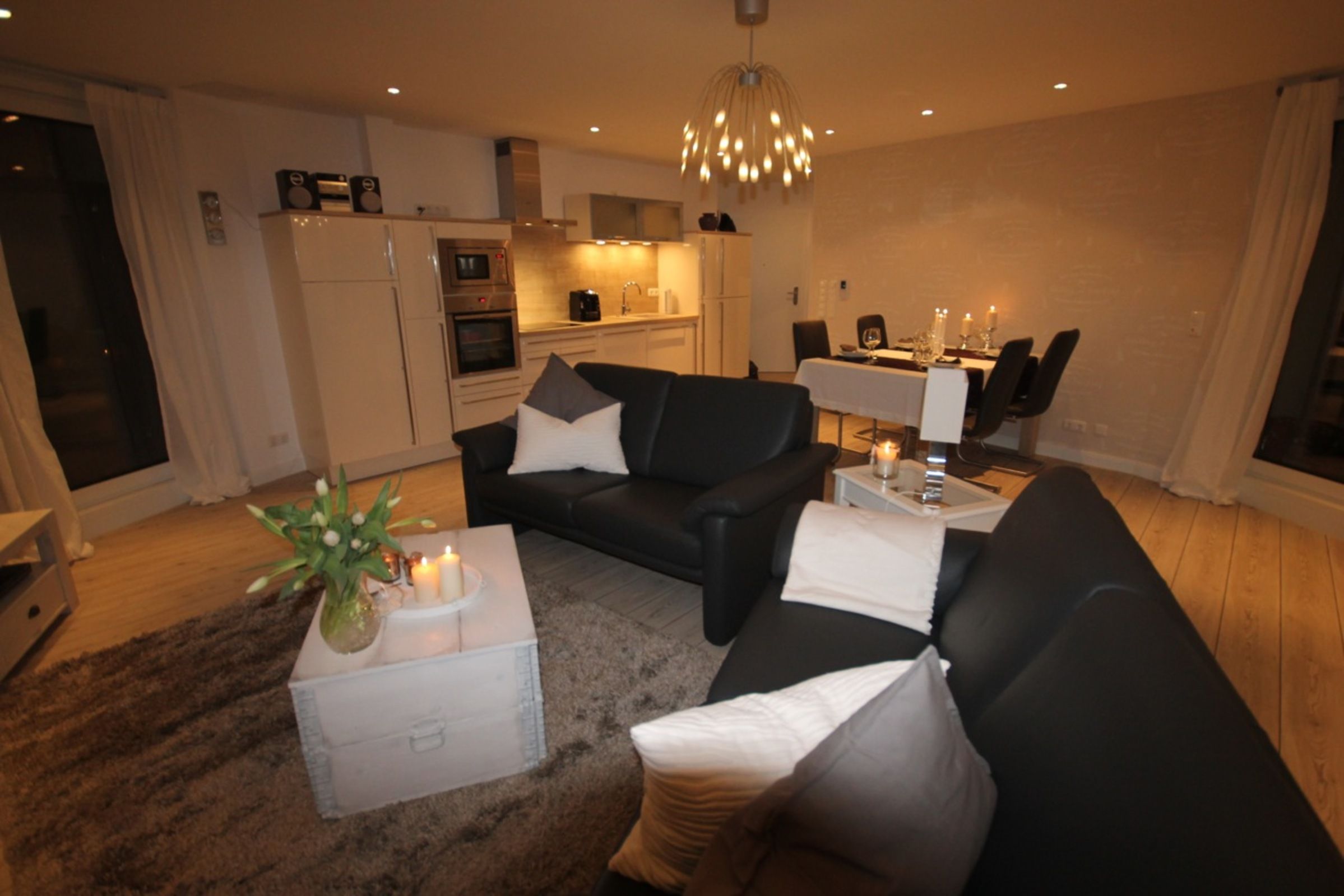 das Wohnzimmer mit seinem unvergleichbaren Blick auf die Ostsee hat eine Größe von ca. 35 m². Die bodentiefen Fenster mit einer automatischen Beschattung lassen sofort eine erholsame Stimmung aufkommen. Der Esstisch mit 4 Stühlen ist im Wohnbereich integriert. Ein Kinderhochstuhl ist bei Bedarf vorhanden. Dies bitte bei Bedarf angeben. Aktuelle Neuigkeiten gibt es über SAT-TV oder Radio. Der Fußboden ist allergiefreundlich mit Fußbodenheizung und Amtico Spacia Vinyl Designbelag erstellt