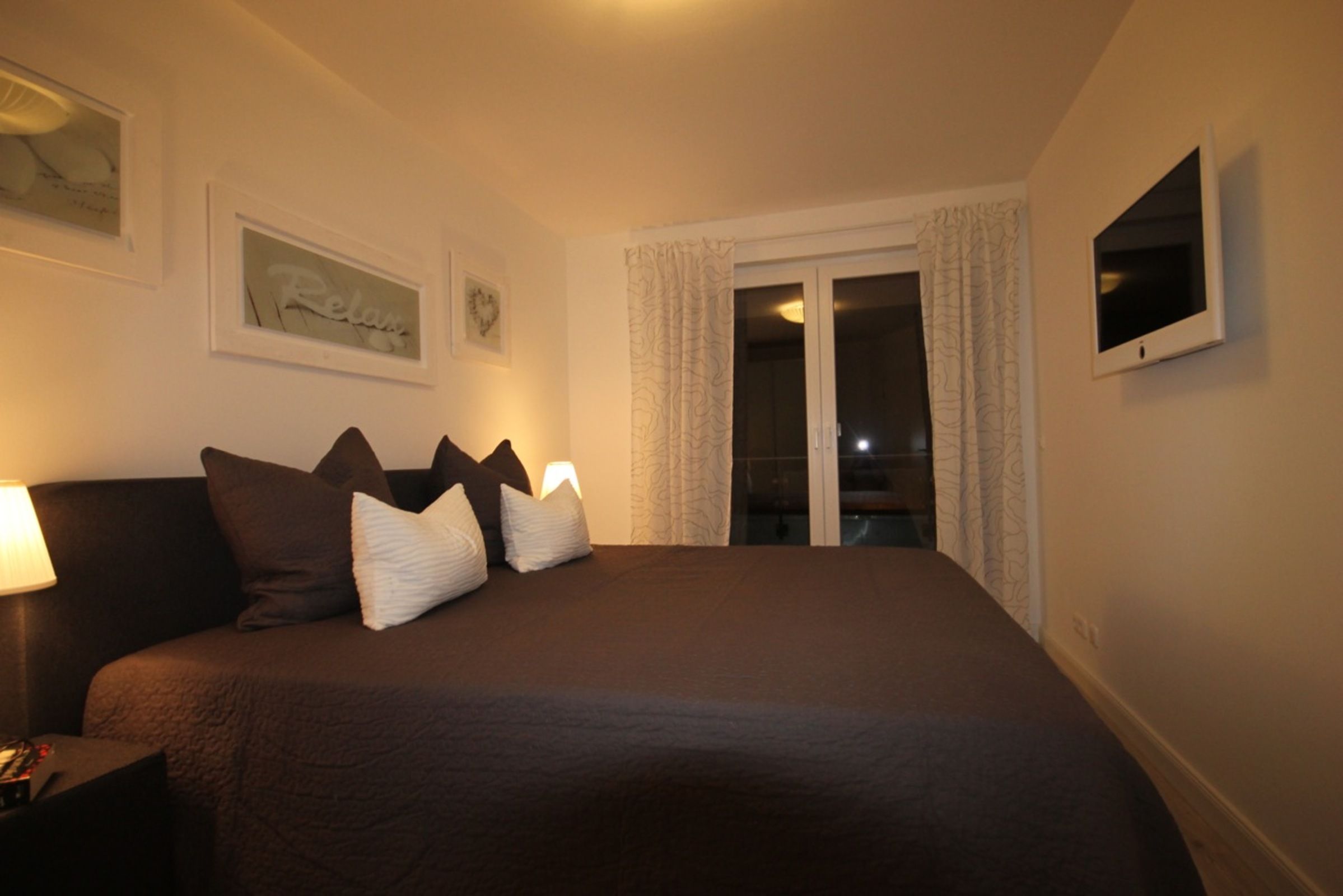 das Boxspringbett als gemütliche Schlaflandschaft und das eigene TV lassen das Wiederkommen im nächsten Jahr leichter werden. Ein großer Kleiderschrank mit 2x T-Aufteilung bietet Platz für mitgebrachte Sachen und man muss nicht aus dem Koffer leben. Zwei Nachtischlampen direkt am Bett ermöglichen einen kuschligen Abend mit einem netten Buch. Den Ausgang zur Terrasse und die Beschattung durch elektrische Rollläden sind inklusive.