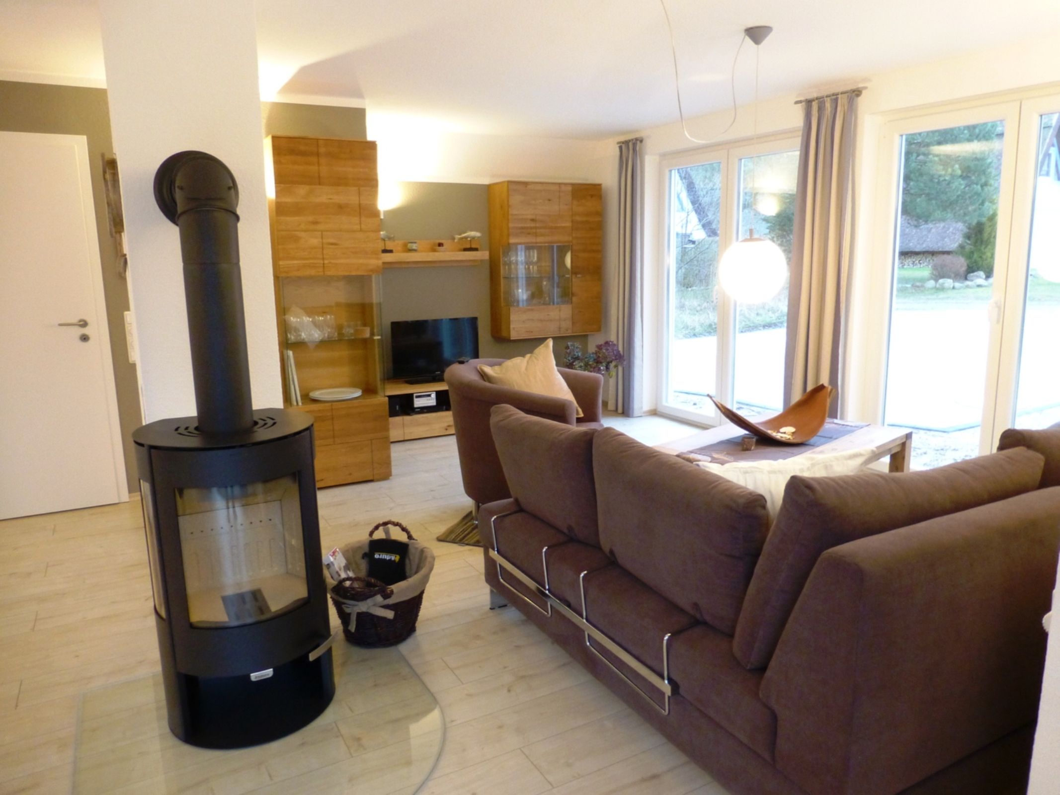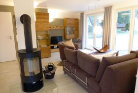 Ein besonderes Highlight ist der zentrale Ofen mit drei Sichtfenstern für behagliche Stunden in der kühleren Jahreszeit.