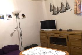 Die Wohnung hat einen separaten Eingang und eine eigene Garten- u. Grillecke, Wäscheplatz ist vorhanden. Die Entfernung zum Strand beträgt ca.1km. Die Ferienwohnung besteht aus einem Wohnzimmer mit Küchenzeile,Schlafzimmer,Dusche/WC und Flur mit Garderobe.Alle Fußböden mit Teppichboden bzw. Fliesen. Zentralheizung. Bei Bedarf ist ein Kinderbett vorhanden. Kostenloser W-LAN-Anschluss.