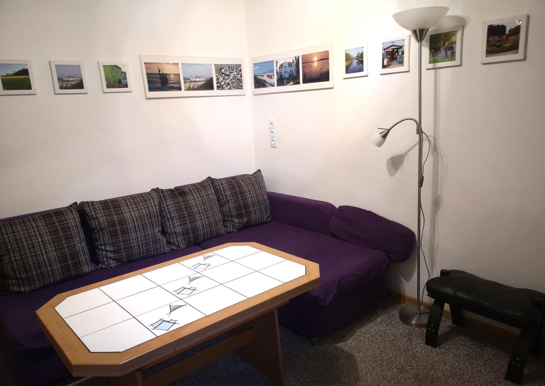 Die Ferienwohnung besteht aus einem Wohnzimmer mit Küchenzeile (Couchgarnitur, Schrankwand, Tisch, Miniküche mit Spüle, E-Herd, Kühlschrank, Kaffeemaschine, Geschirr und Hausrat, TV mit Sat-Anschluss und Radio), Schlafzimmer (Doppelbett, Rollbett, Kleiderschrank), Dusche/WC und Flur mit Garderobe. Alle Fußböden mit Teppichboden bzw. Fliesen. Zentralheizung. Ein Kinderbett ist ebenfalls vorhanden. Erstausstattung Bettwäsche inklusive Übernachtungspreis.