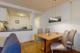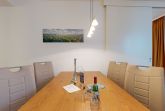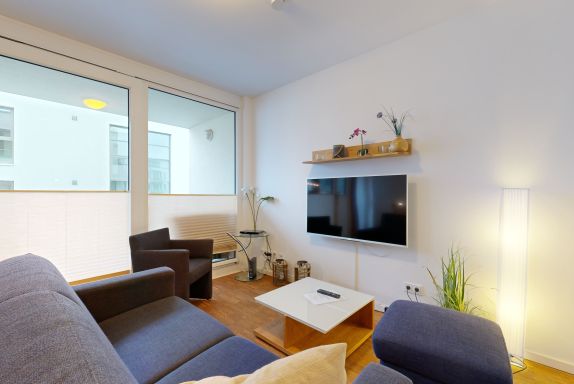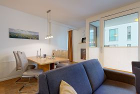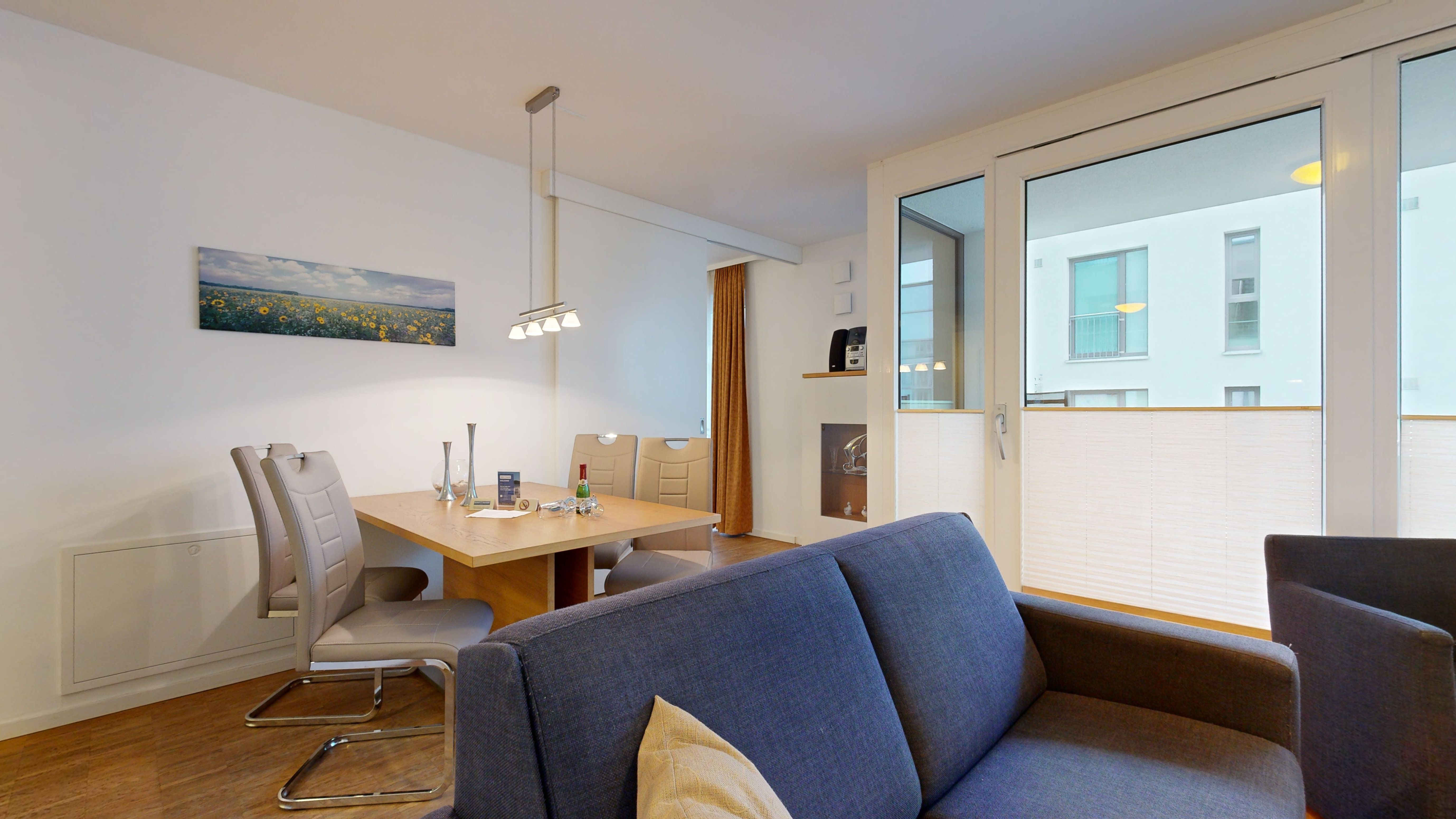 Freundliches, helles Wohnzimmer mit Südwest-Balkon mit gemütlicher Couchgarnitur (Schlafgelegenheit für 1-2 Pers. 140 cm x 200 cm), Kabel-TV, DVD-Player, Internetzugang (WLAN inkl.), Esstisch