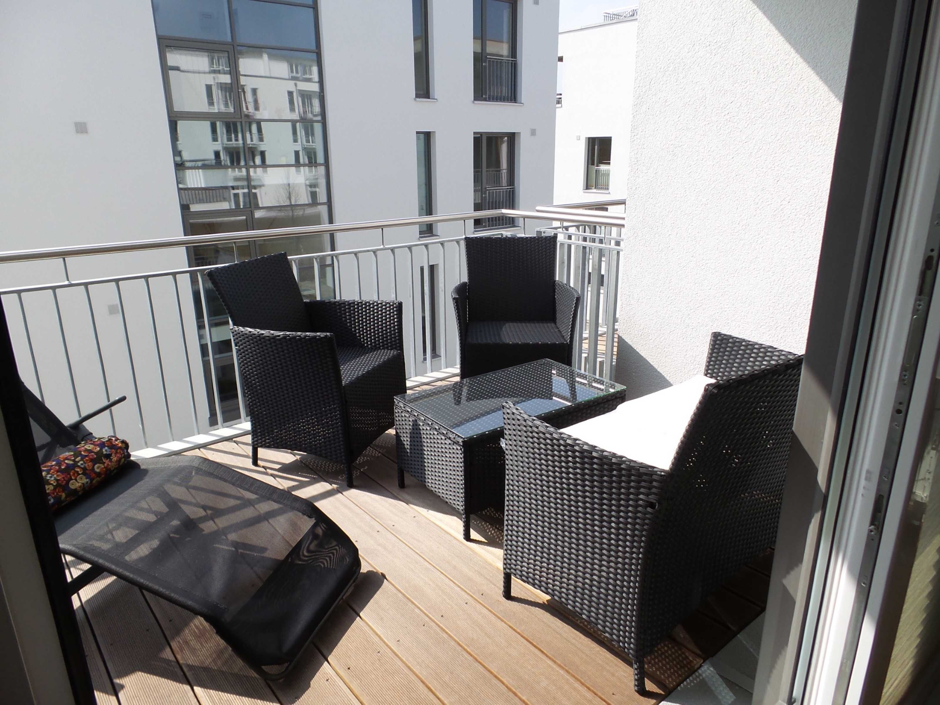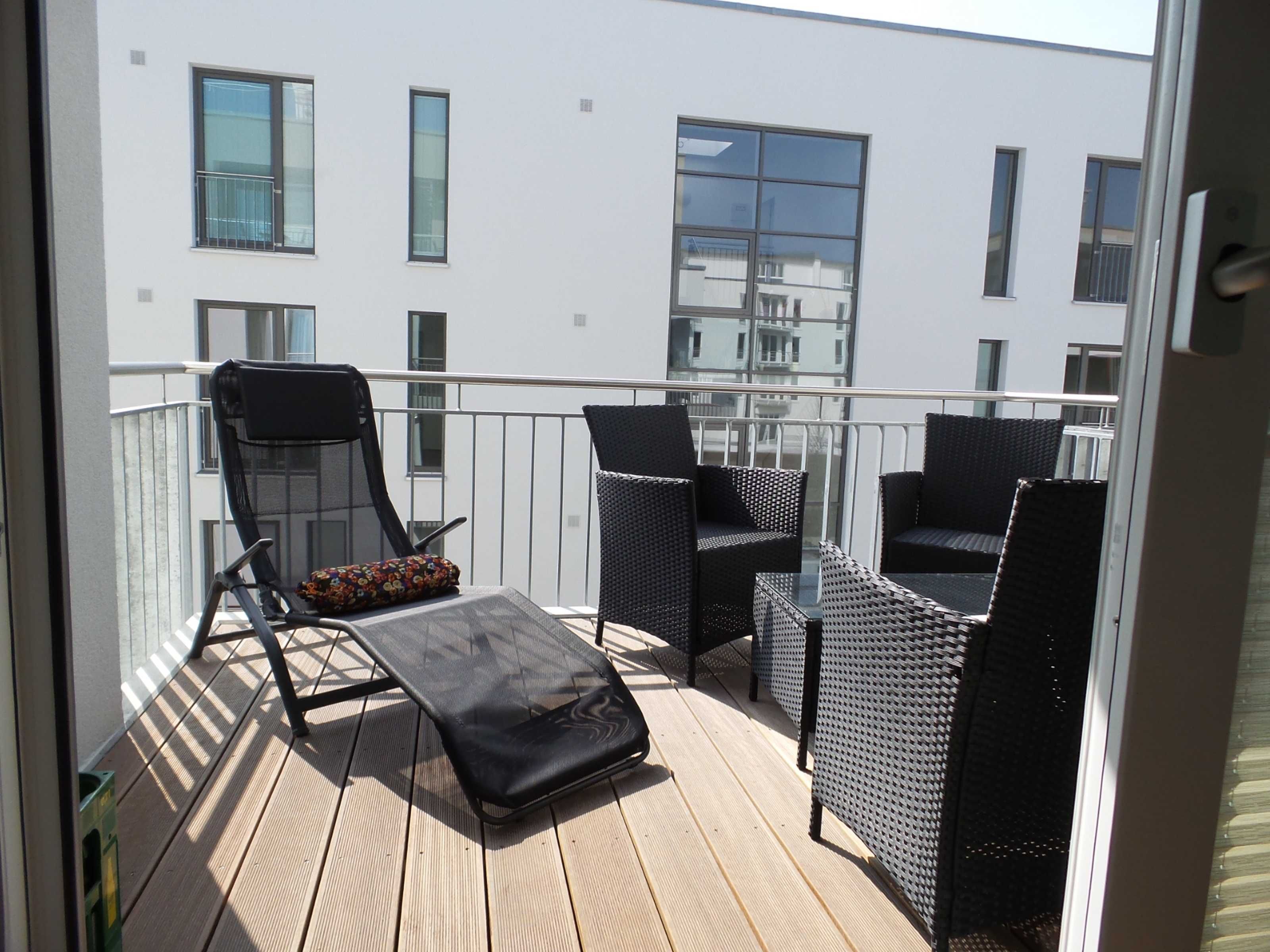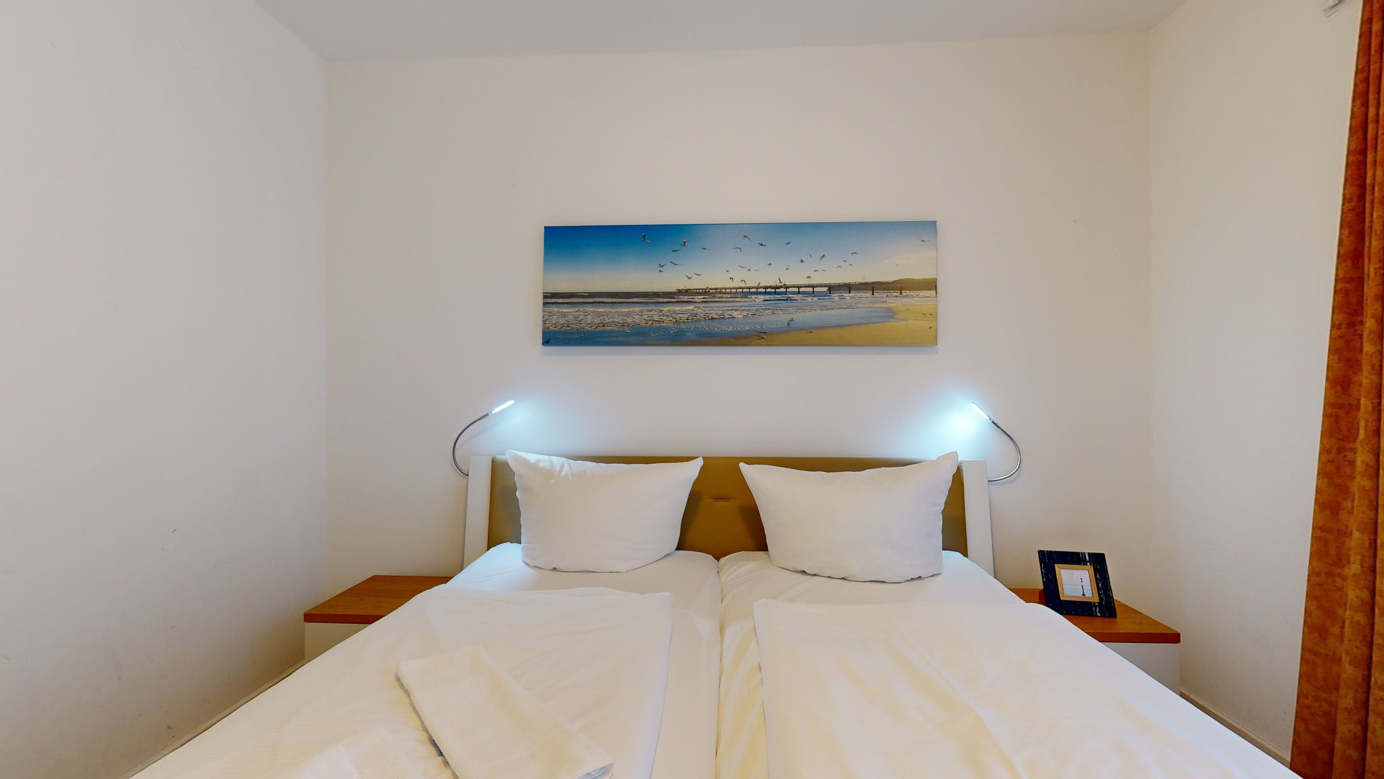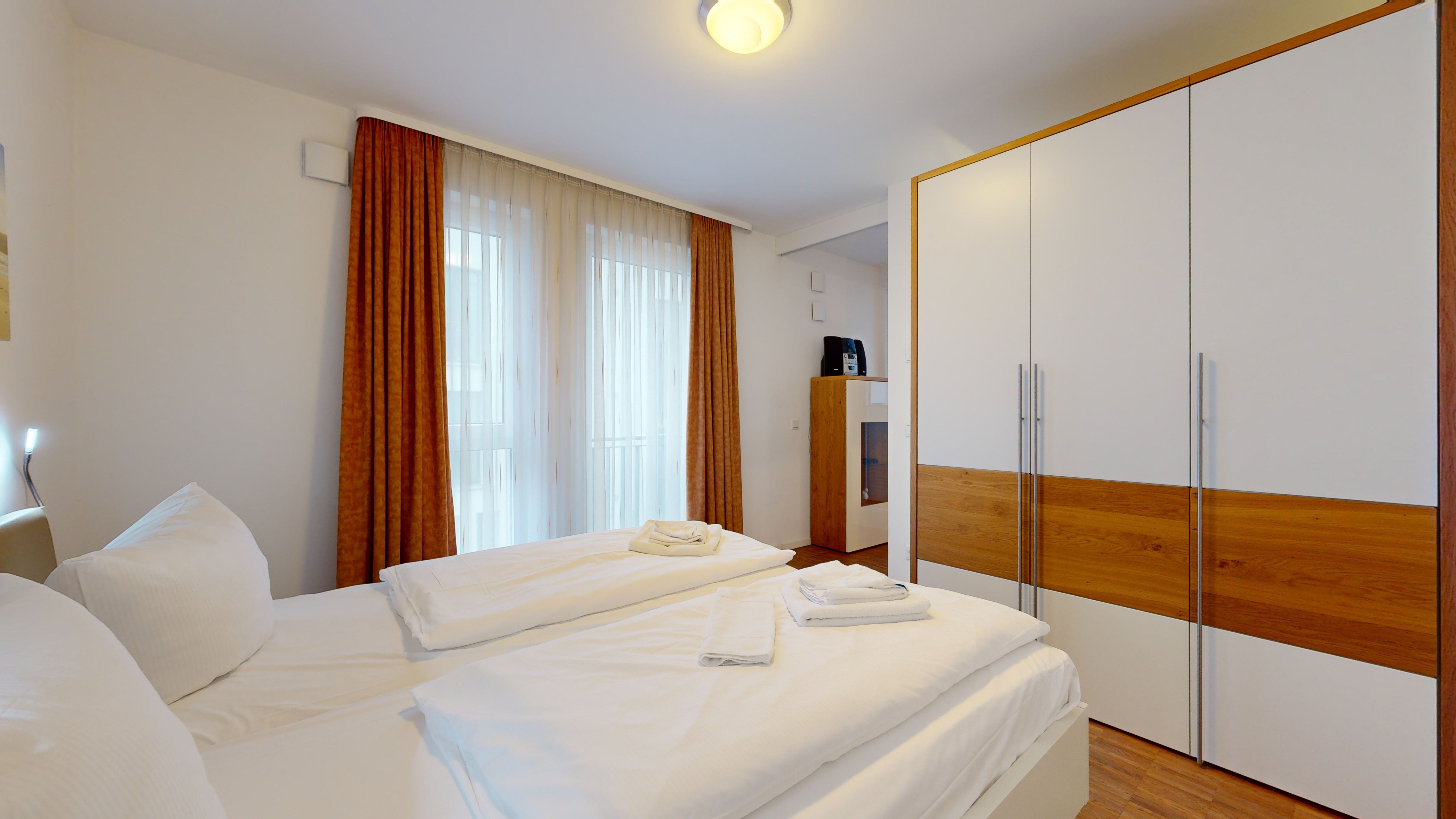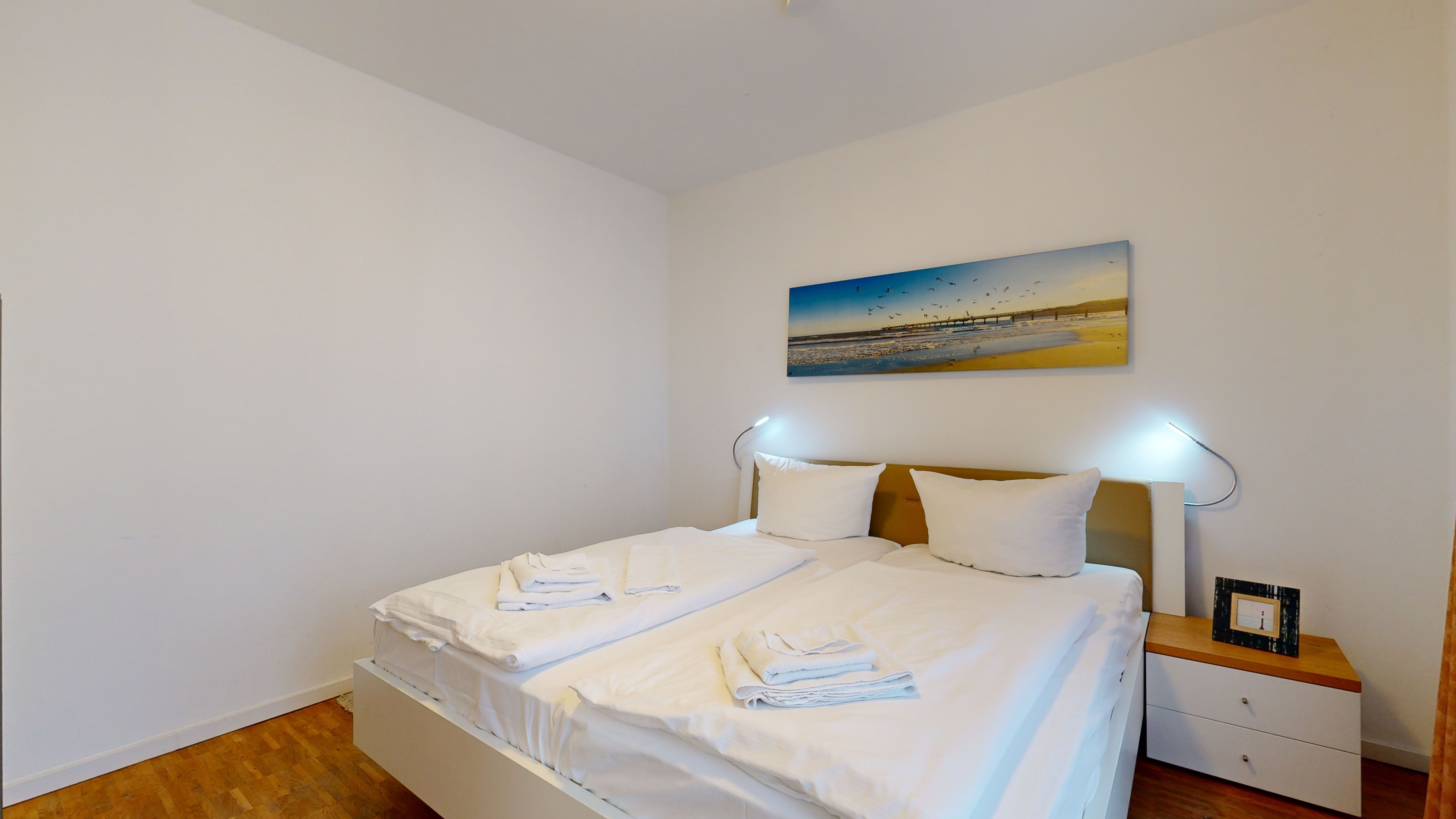 Die Komfort-Wohnung im 2. OG (2 Zimmer / 52 m²) hat ein Schlafzimmer mit Doppelbett (2 Matratzen je 90 x 200 cm), Südbalkon, Fahrstuhl und Tiefgarage.