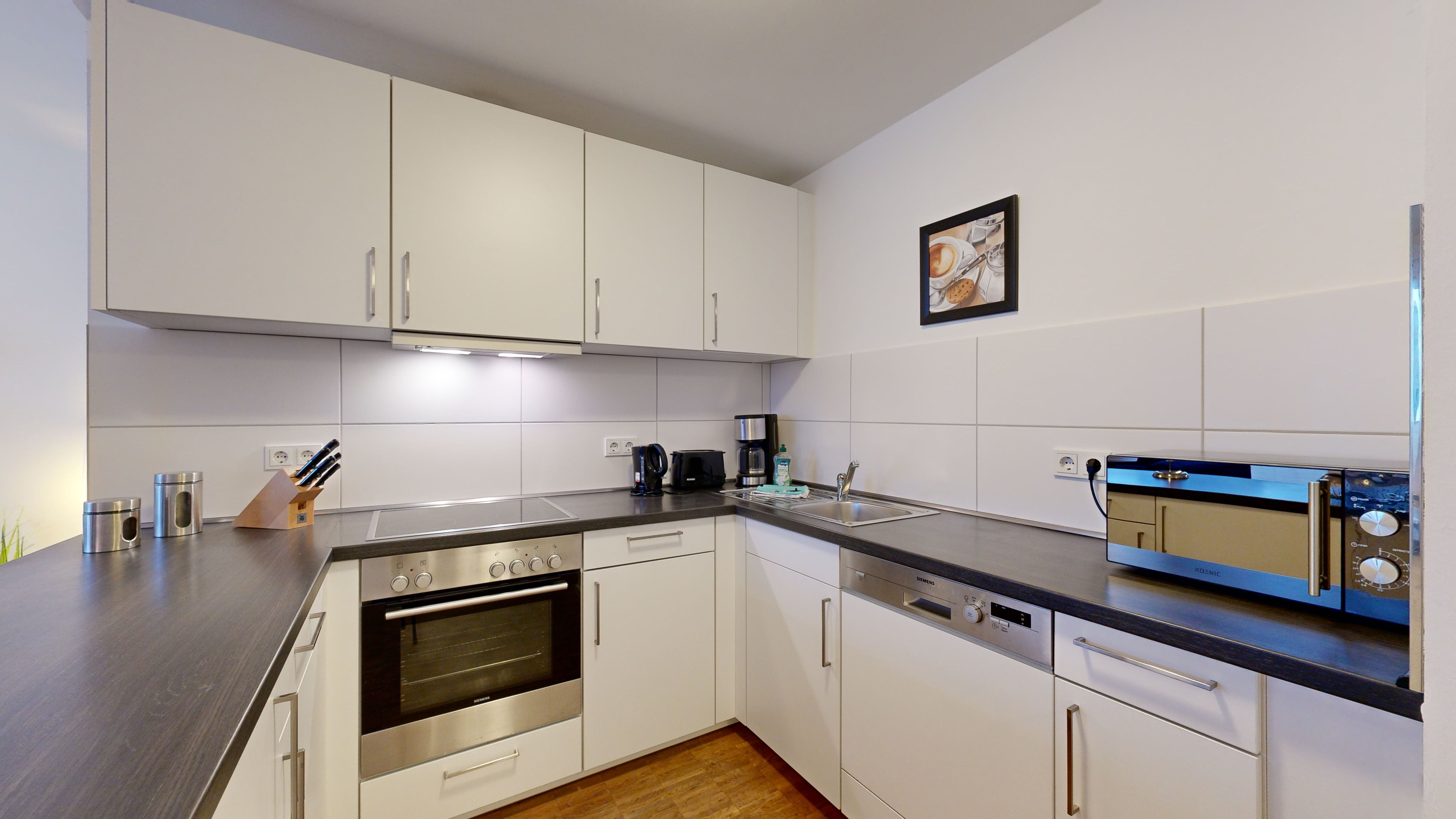 Küche: Moderne, großer Küchenbereich mit Ceran-Herd, Backofen, Spülmaschine, Mikrowelle, Wasserkocher, Kaffeemaschine und Toaster