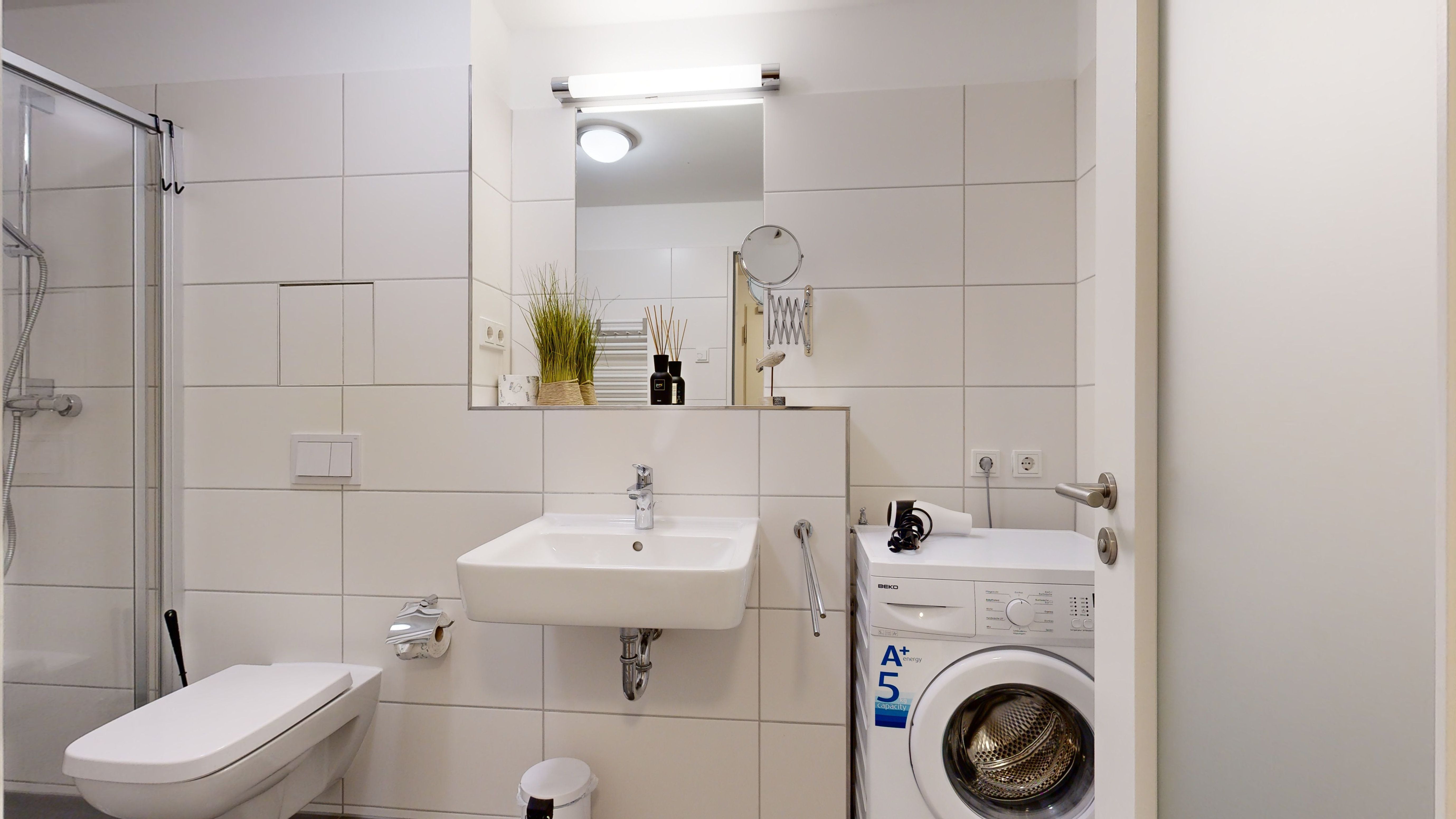 Badezimmer mit Dusche, WC, Föhn, Waschmaschine