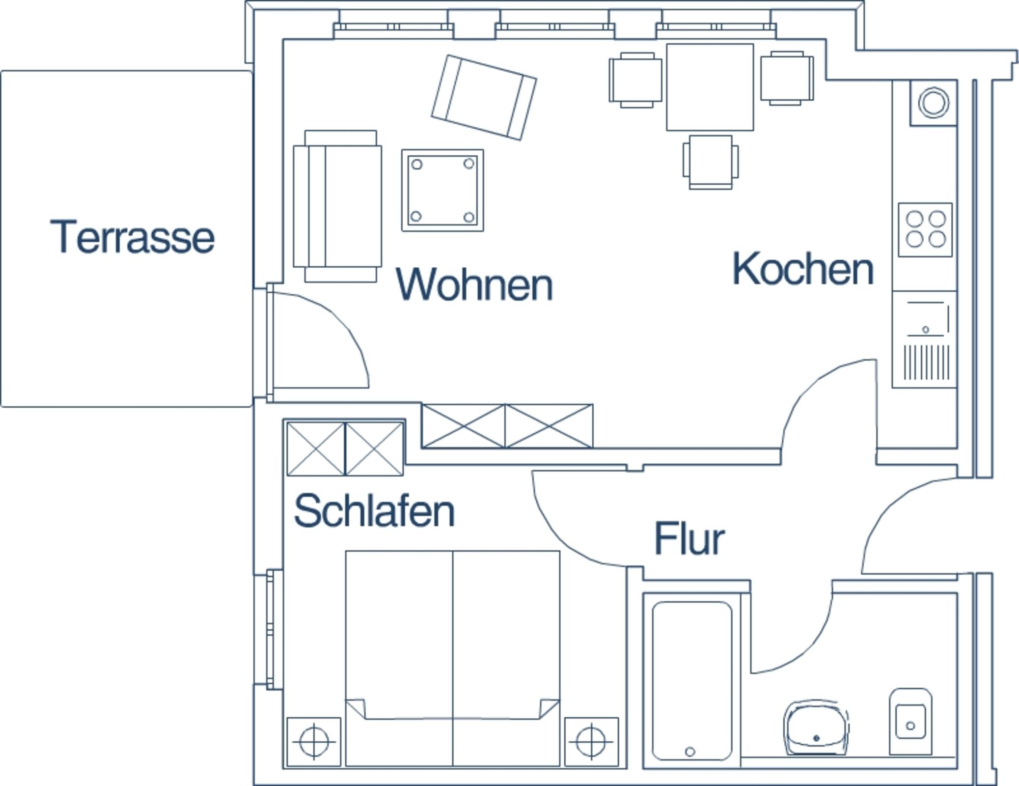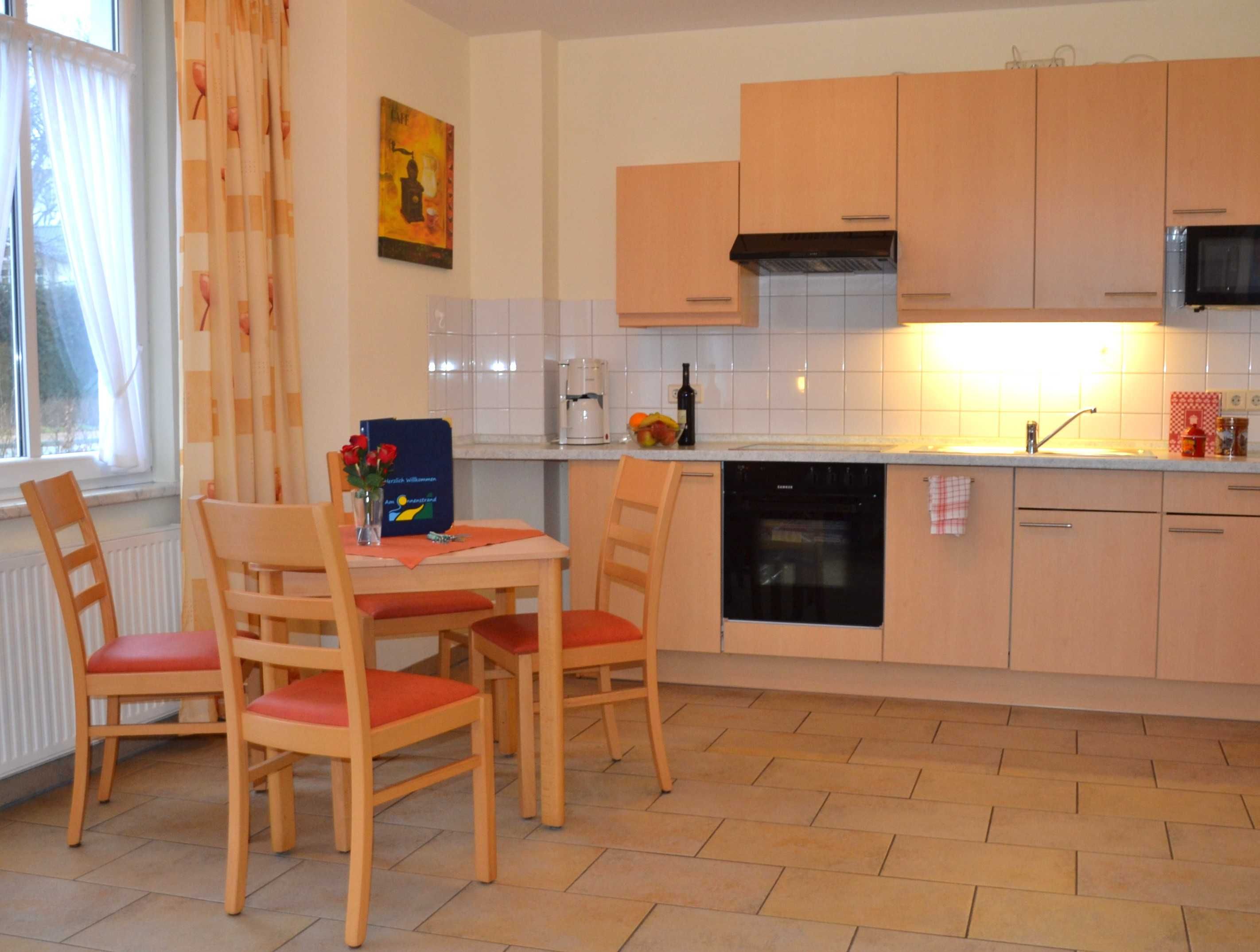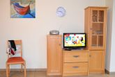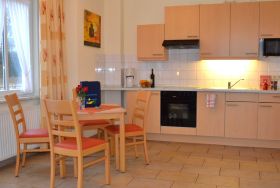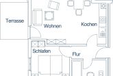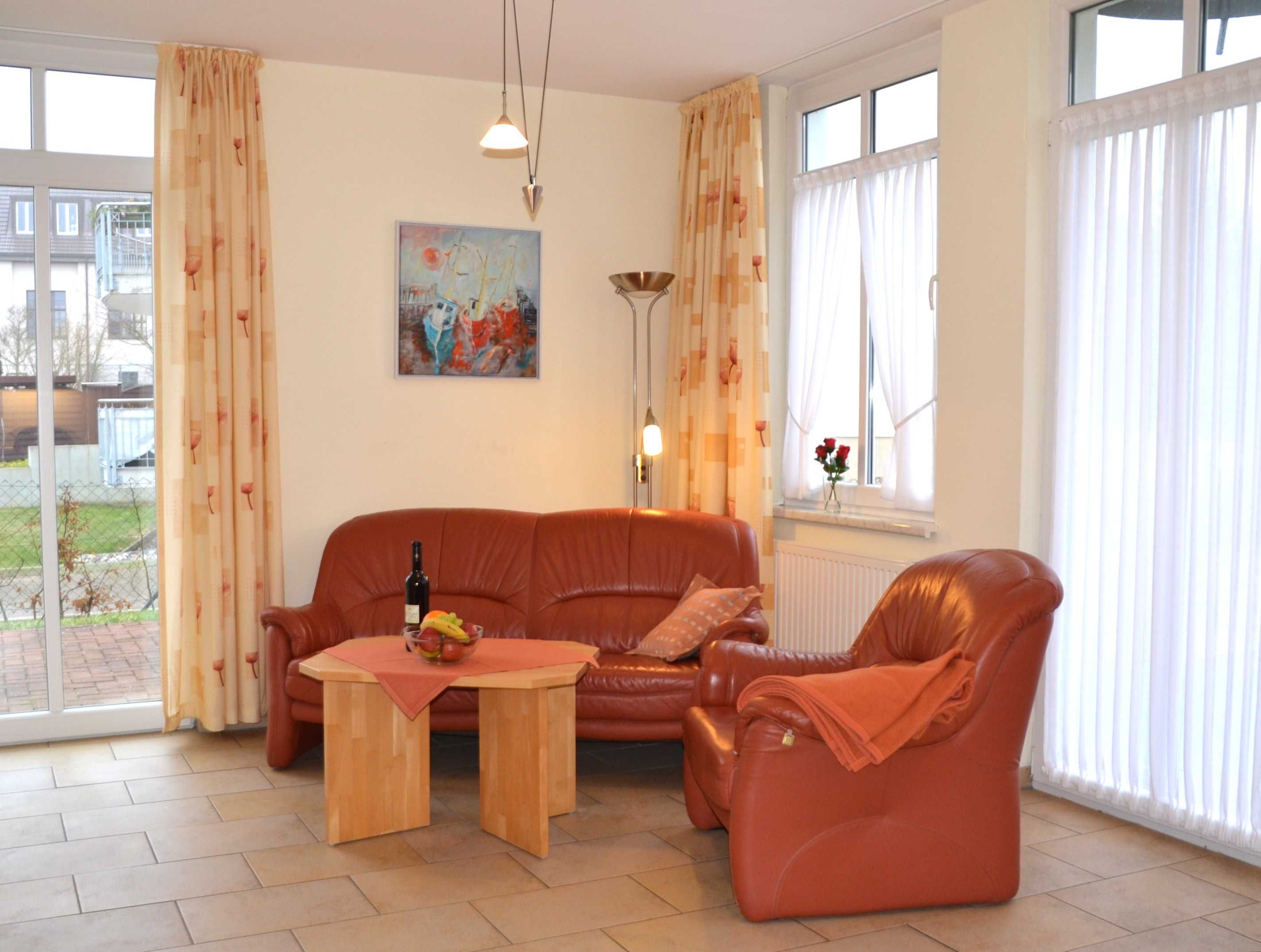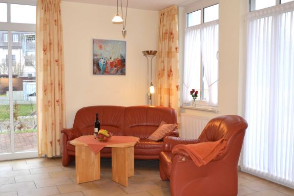 Diese stilvoll eingerichtete Wohnung mit 40² liegt im Erdgeschoss. Es gibt einen Wohnraum mit kompletter, gut ausgestatteter Küchenzeile, ein separates Schlafzimmer mit 1,80 m breitem Doppelbett, ein Bad mit Dusche (Wo. 1) oder Badewanne mit Duschvorrichtung (Wo. 4) sowie eine möblierte Terrasse. Glatte Fußböden, Ledercouch und abwischbare Bezüge kommen Allergikern entgegen. Die Nichtraucherwohnung wirkt durch viele, auch bodentiefe Fenster hell und freundlich.