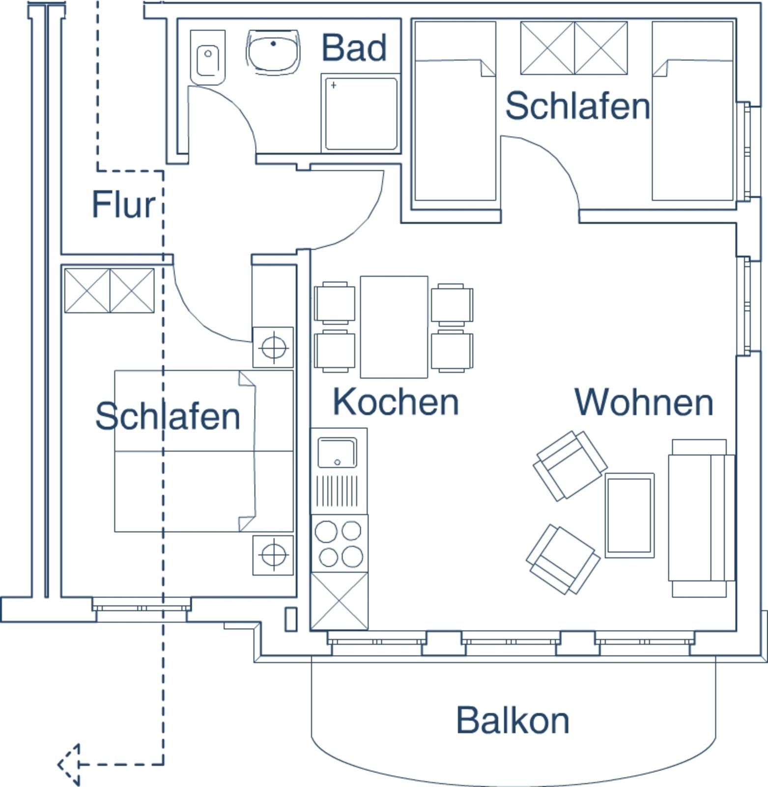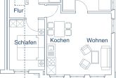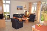 Diese stilvoll eingerichtete Wohnung mit 50² liegt im Erdgeschoss. Es gibt einen Wohnraum mit kompletter, gut ausgestatteter Küchenzeile, ein separates Schlafzimmer mit 1,80 m breitem Doppelbett, ein weiteres Schlafzimmer mit 2 Einzelbetten, ein Bad mit ebenerdiger Dusche sowie eine möblierte Terrasse. Glatte Fußböden, Ledercouch und abwischbare Bezüge kommen Allergikern entgegen. Die Nichtraucherwohnung wirkt durch ihre bodentiefen Fenster hell und freundlich.