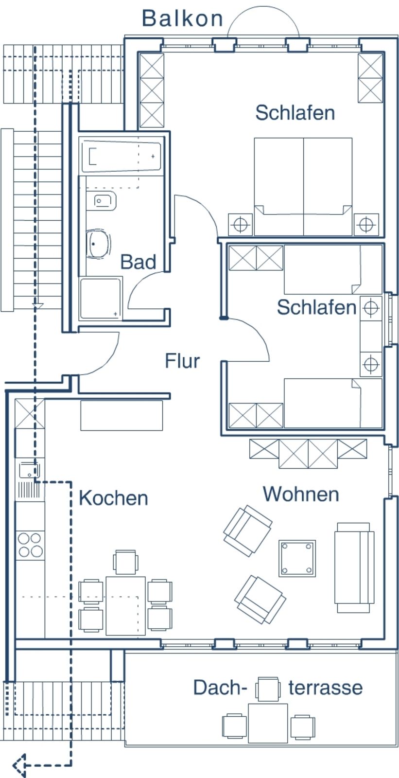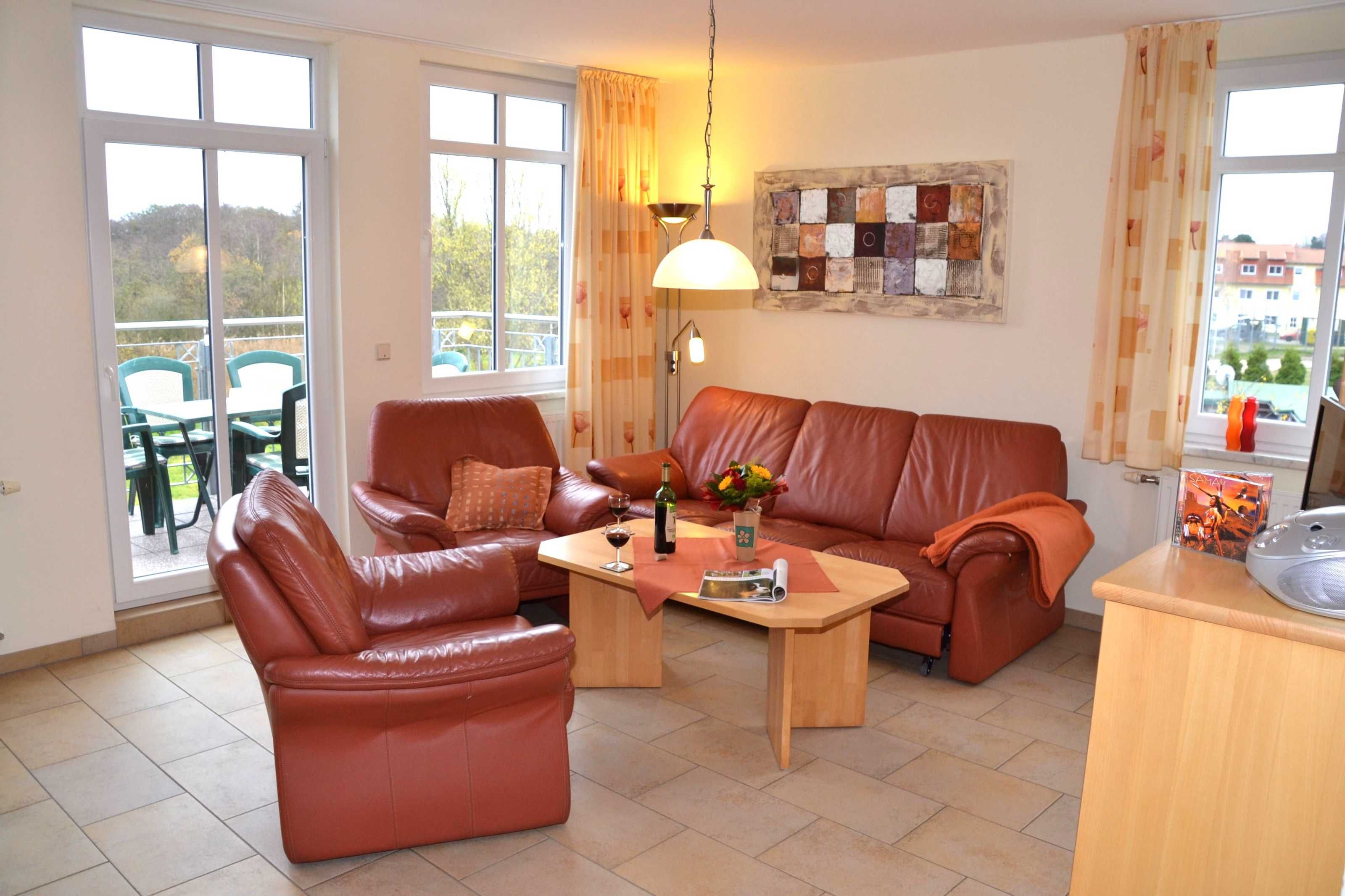 Diese stilvoll eingerichtete Wohnung mit 80² liegt im 2. Obergeschoss. Es gibt einen sehr großzügigen Wohnraum mit kompletter, gut ausgestatteter Küchenzeile, ein separates Schlafzimmer mit 1,80 m breitem Doppelbett und Stehbalkon, ein weiteres Schlafzimmer mit 2 Einzelbetten, ein Bad mit Dusche und Badewanne sowie eine große möblierte Dachterrasse mit Blick auf den Schloonsee. Die stabile Sitzcouch kann mit einfachen Handgriffen zu einem Doppelbett umgebaut werden. Glatte Fußböden, Ledercouch und abwischbare Bezüge kommen Allergikern entgegen. Die Nichtraucherwohnung wirkt durch ihre bodentiefen Fenster hell und freundlich. In dieser Wohnung sind keine Hunde erlaubt.