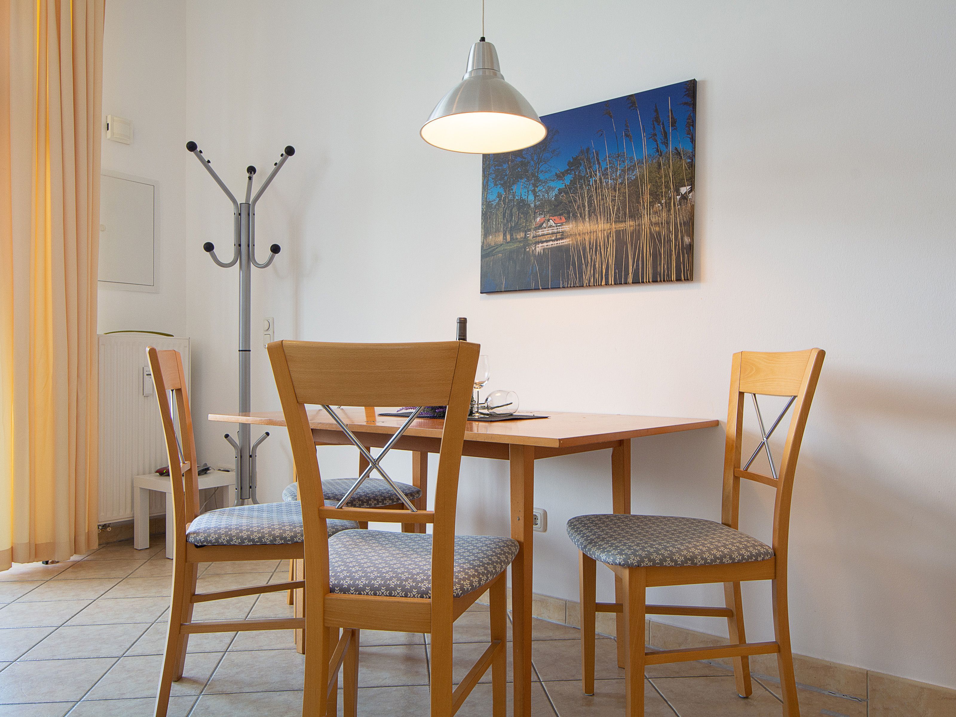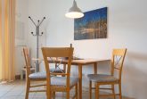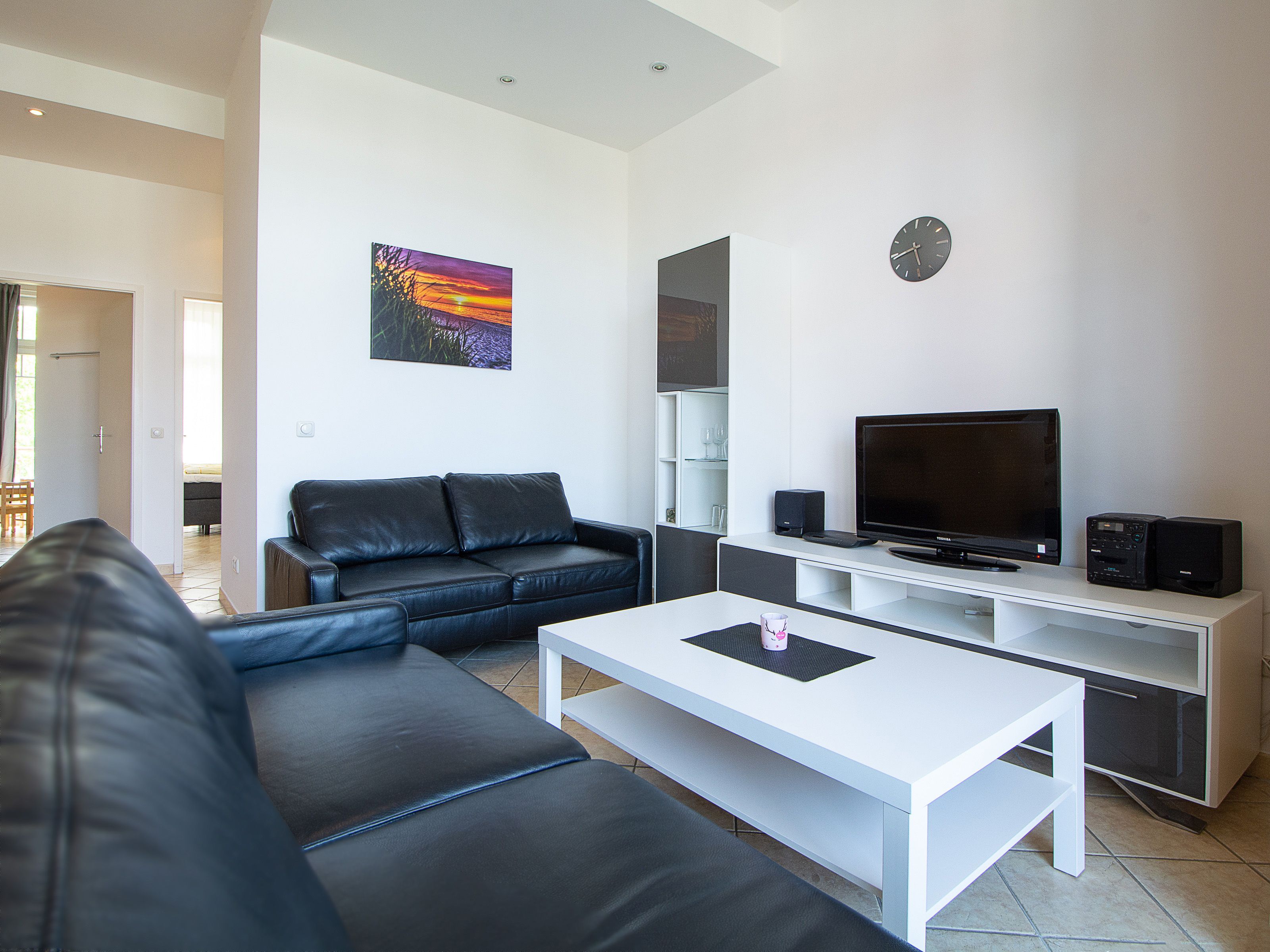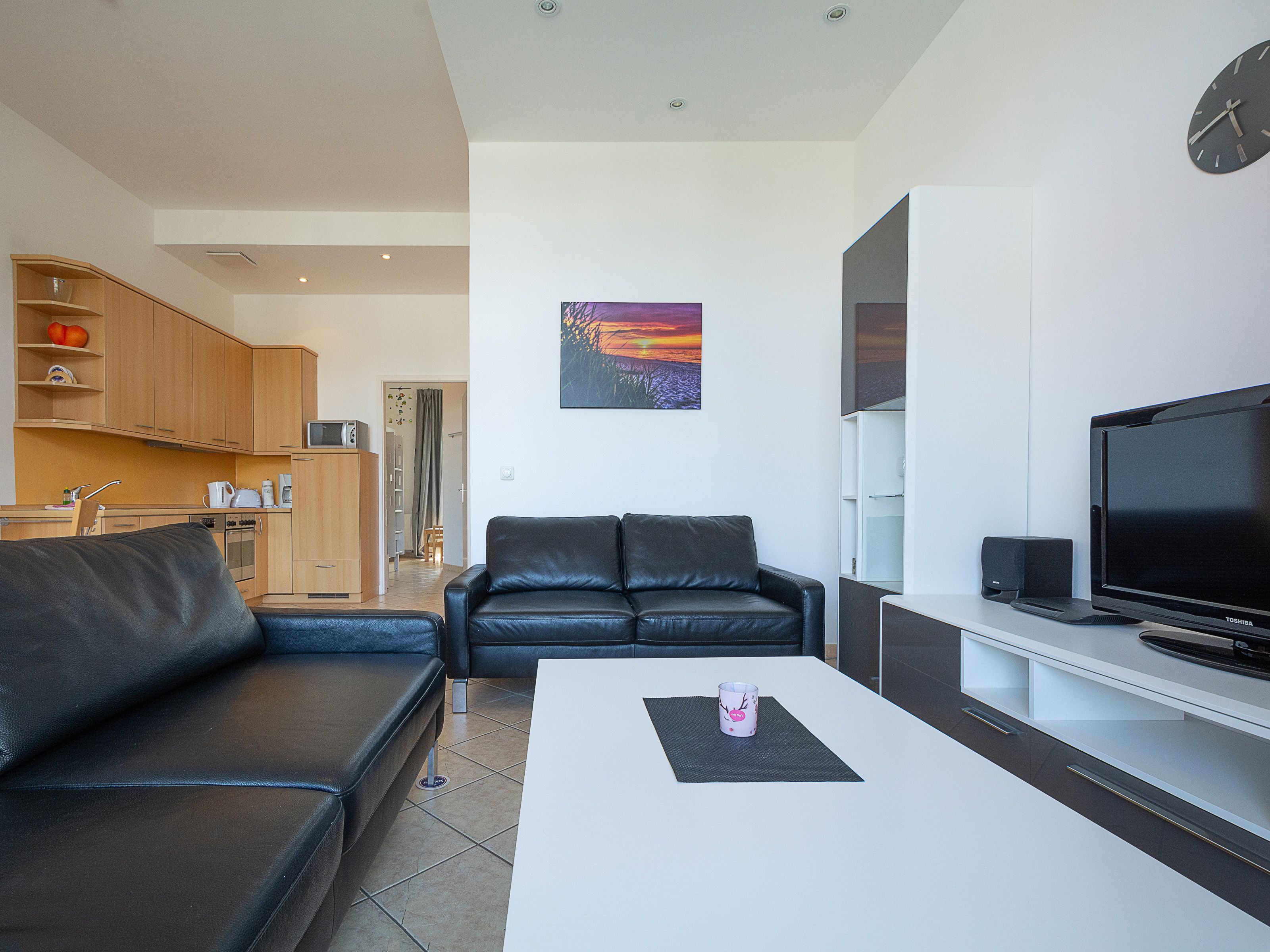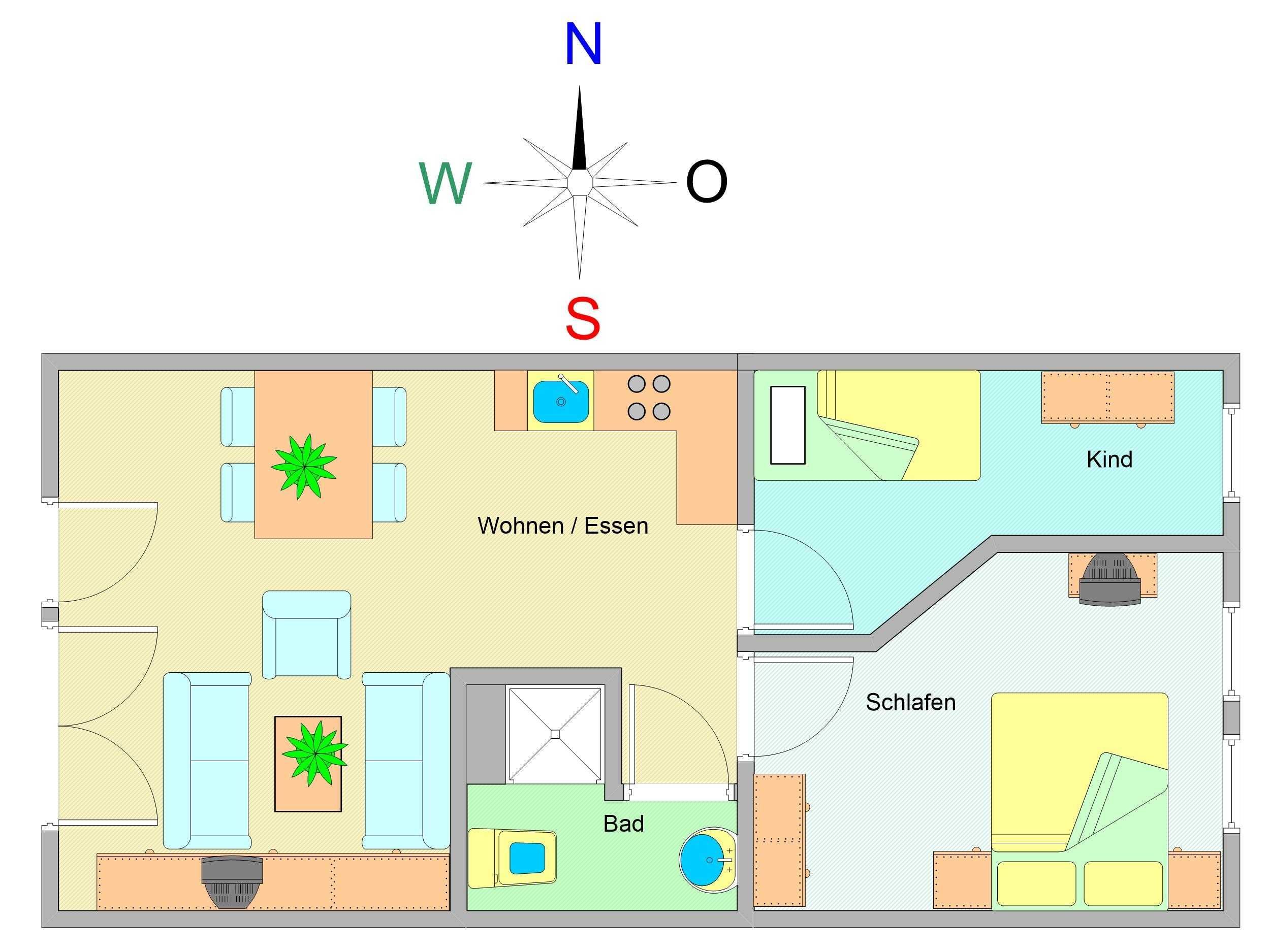 Sie wohnen in einer komfortablen 3-Raum-Wohnung von ca. 56 qm Größe, die sich im ersten Obergeschoss befindet. Sie betreten die freundliche Ferienwohnung über die möblierte West-Terrasse, auf die Sie über die Rückseite des Hauses per Außentreppe (links) gelangen. Es begrüßt Sie ein heller freundlicher Wohnraum mit bequemer Wohnlandschaft, Stereoanlage und TV-Gerät. Der Essbereich ist im Wohnbereich integriert und bietet Ihnen Platz für gemeinsame Mahlzeiten.